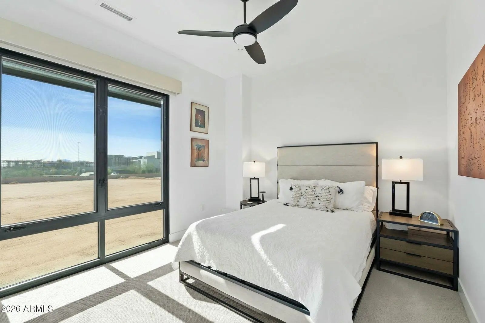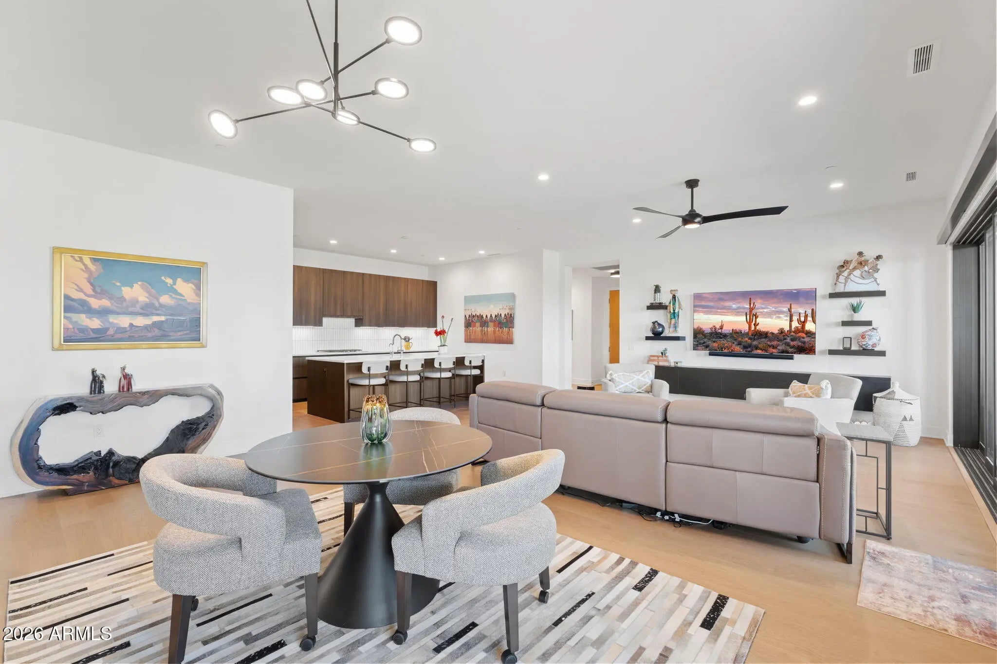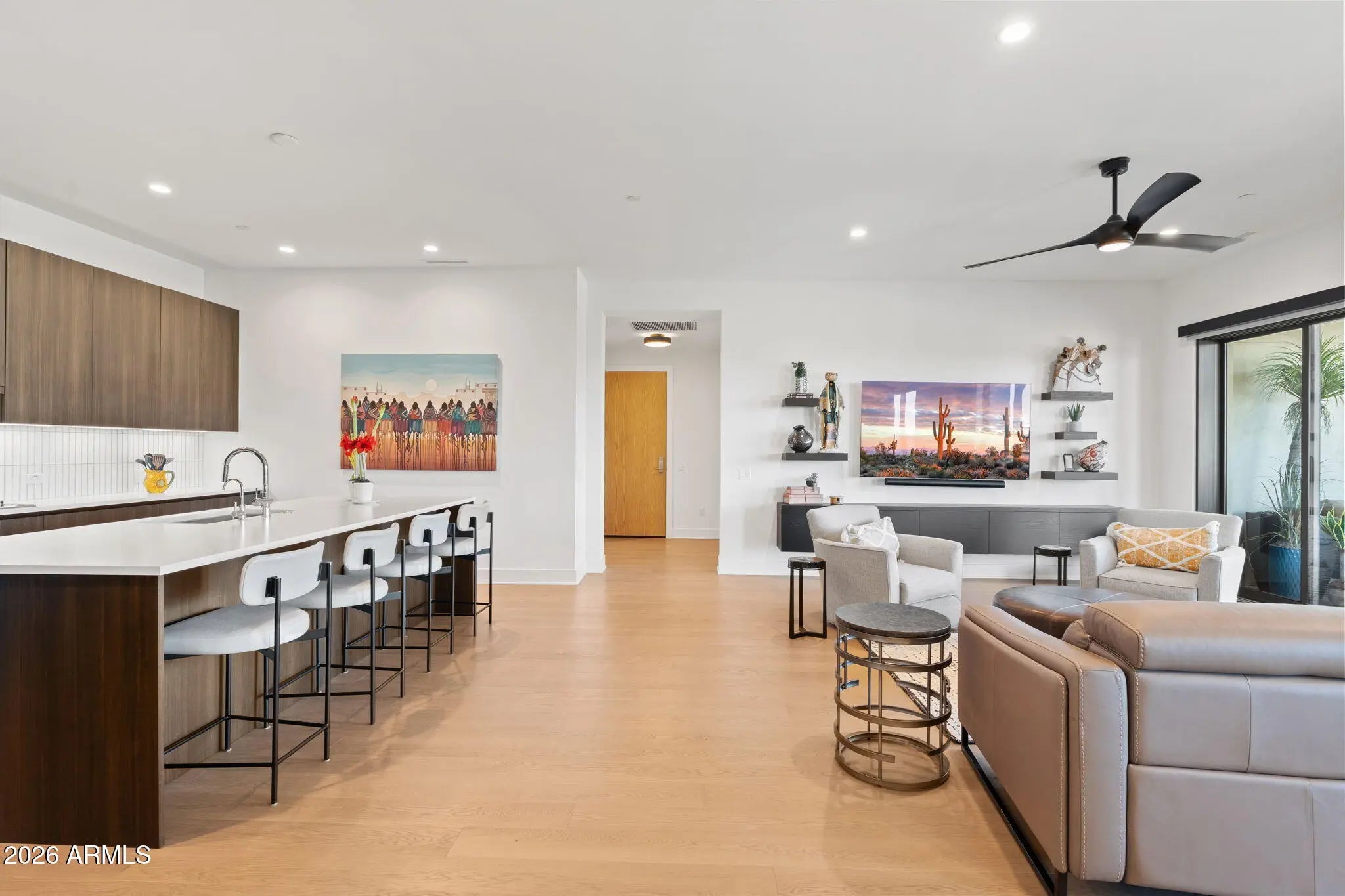 Welcome to Portico, an exceptional luxury condominium community brought to Scottsdale by the renowned Belgravia group, one of Chicago's premier condominium developers making their highly anticipated Arizona debut. This brand new second-floor residence exemplifies sophisticated urban living, where contemporary design meets unparalleled convenience in the heart of Scottsdale. Step inside this stunning four-bedroom, three-and-a-half bathroom home and be greeted by dramatic floor-to-ceiling glass that floods the space with natural light while offering breathtaking views. The expansive layout flows seamlessly to a generous 39'13'' covered patio, perfect for year-round entertaining or morning coffee against the backdrop of Arizona's stunning McDowell Mountains.