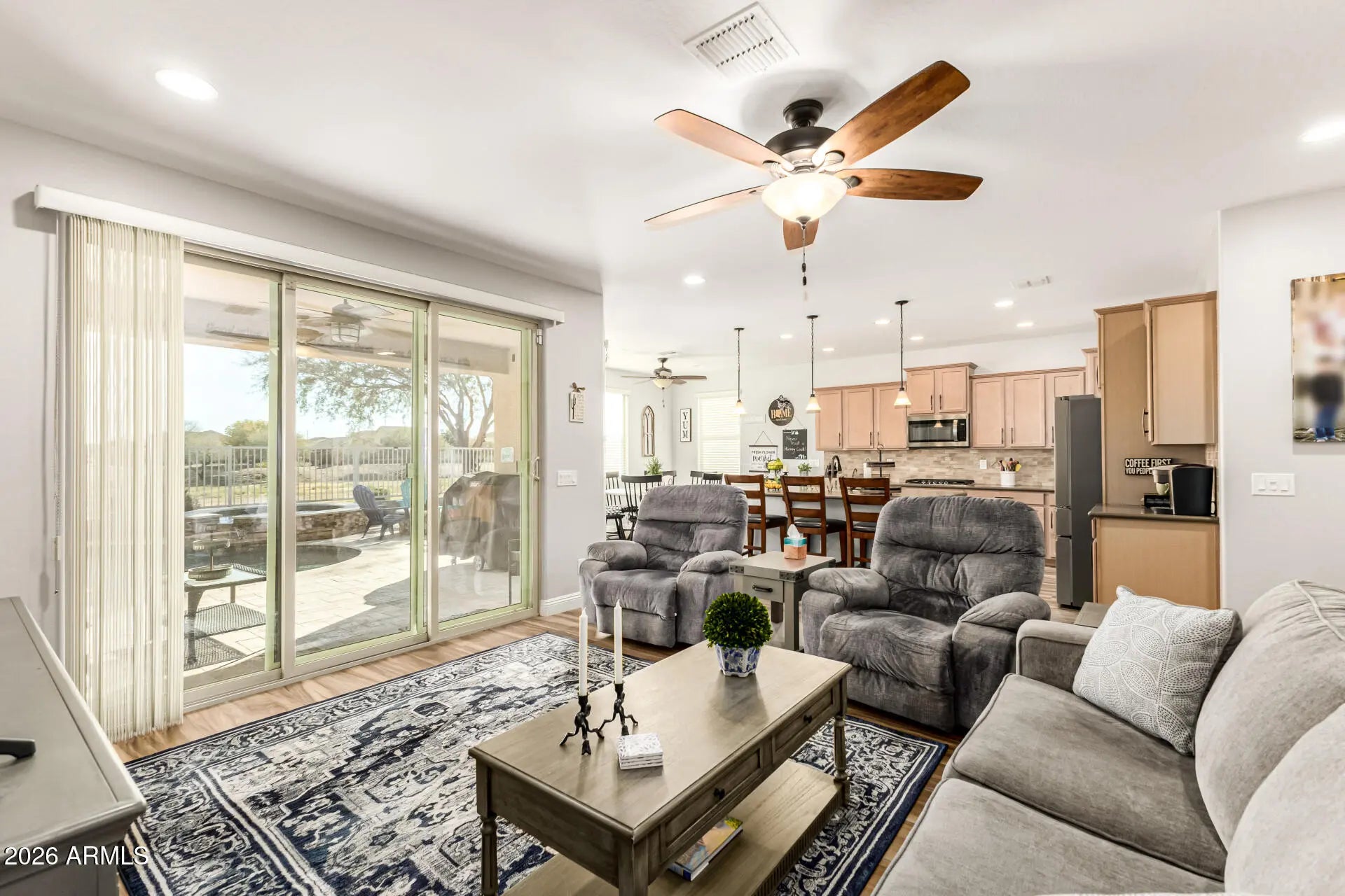 Welcome to this beautifully upgraded, partially furnished home in desirable Morning Sun Farms. Exceptional curb appeal features a tandem garage, stone accents, and expanded concrete driveway with added walkway. The open great room offers high ceilings, recessed lighting, upgraded baseboards, neutral paint, blinds, and porcelain tile flooring throughout the main living areas.The kitchen includes solid-surface countertops, ample wood cabinetry with crown molding, stainless steel appliances, pendant lighting, walk-in pantry, and island with breakfast bar. The primary suite features new carpet, a walk-in closet, and ensuite bath with dual vanities. Secondary bedrooms also include new carpeting. The backyard is an entertainer's dream with a covered patio, travertine pavers, fire pit, pool and spa, and serene greenbelt views. A concrete slab adds additional usable outdoor space. This move-in-ready home offers comfort, style, and functionality.