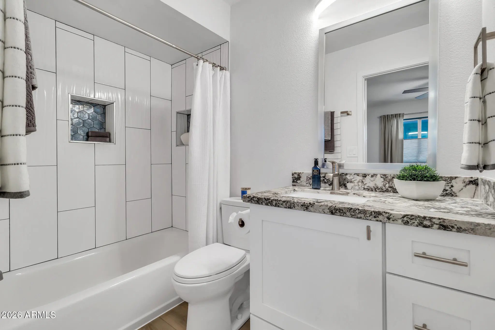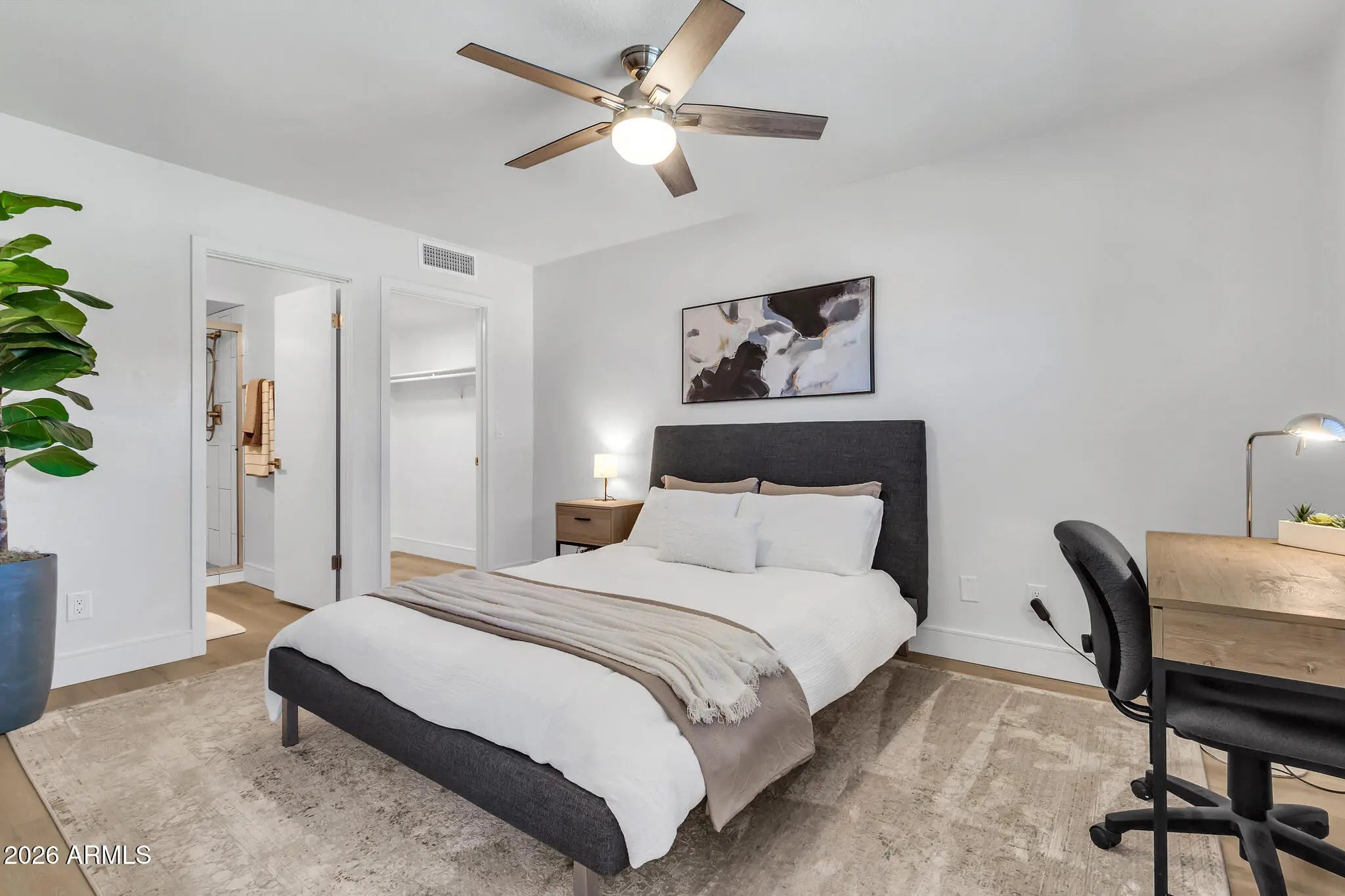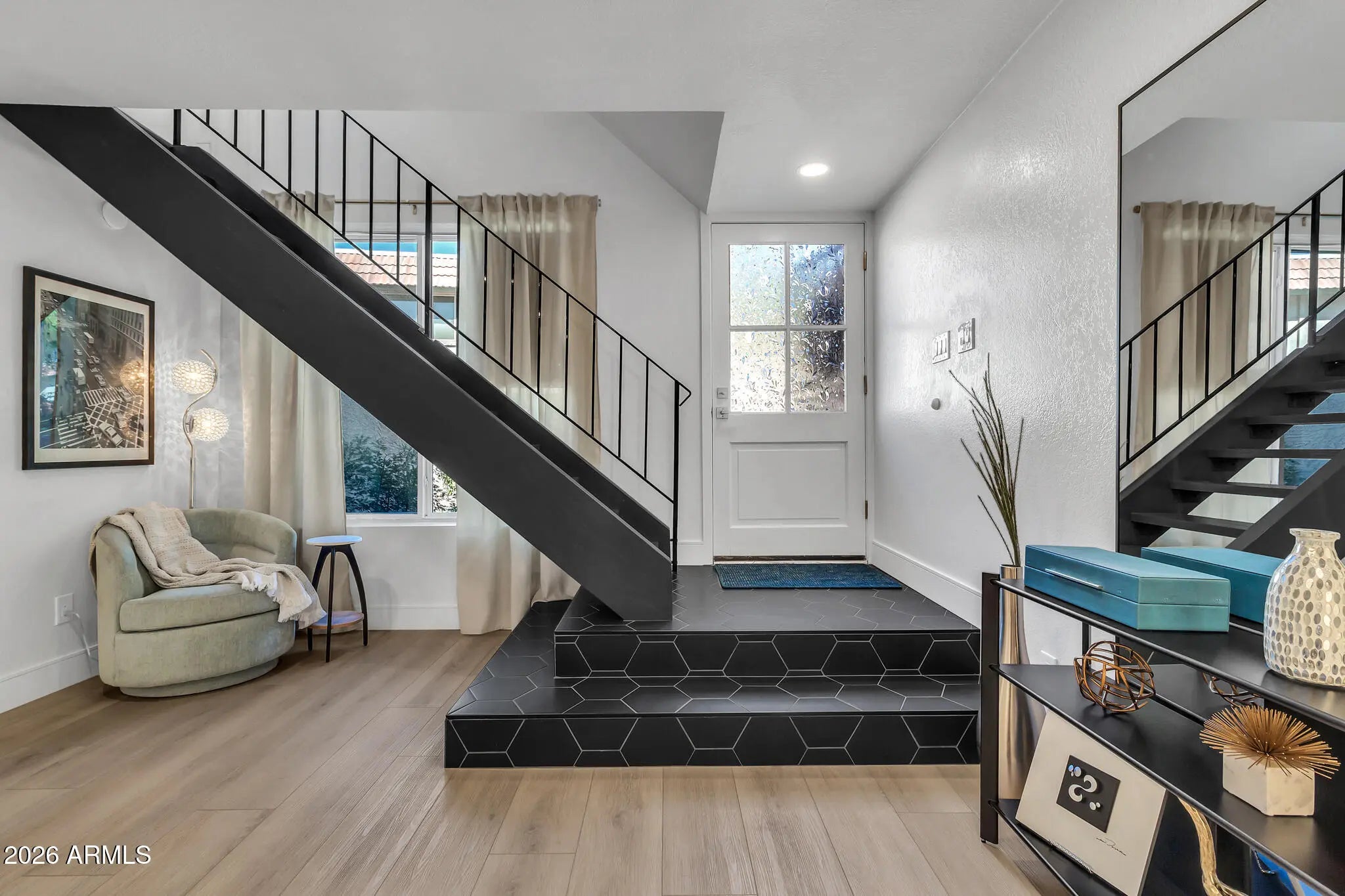 Seller offering 6 Months of Prepaid HOA Dues for Buyer at Close of Escrow!! Stunning Fully Renovated Mid-Century Modern Townhome in The Lakes -- one of Tempe's most sought-after lake communities! Thoughtfully reimagined in 2023 with high-quality custom renovations, this home features designer tilework, natural wood-plank flooring throughout, and a striking rebuilt staircase with modern iron railing. The open great room and dining space flow seamlessly to a private outdoor patio --perfect for entertaining or relaxing. The redesigned kitchen offers soft-close white cabinetry, quartz countertops, under-cabinet lighting, induction cooktop, stainless appliances and a French-door refrigerator. Upstairs features a fantastic double en-suite layout with two spacious primary suites, each with its own spa-inspired bath and walk-in closet--ideal for guests, roommates, or flexible work-from-home living. Additional highlights include a whole-house water conditioning system, built-in garage storage and laundry area, insulated garage door with smart opener, and a private travertine patio with pet-friendly turf and vertical garden. Enjoy resort-style living in The Lakes with scenic lakes, walking paths, parks, pools, tennis, pickleball, fitness center and clubhouse amenities. Take an evening stroll to Pier 54 neighborhood lakeside restaurant or enjoy nearby dining, Tempe Marketplace, and ASU. A truly turn-key home in a friendly, active lake community where neighbors enjoy a true neighborhood atmosphere; with quick access to US-60 and I-10, placing the entire Valley within easy reach!