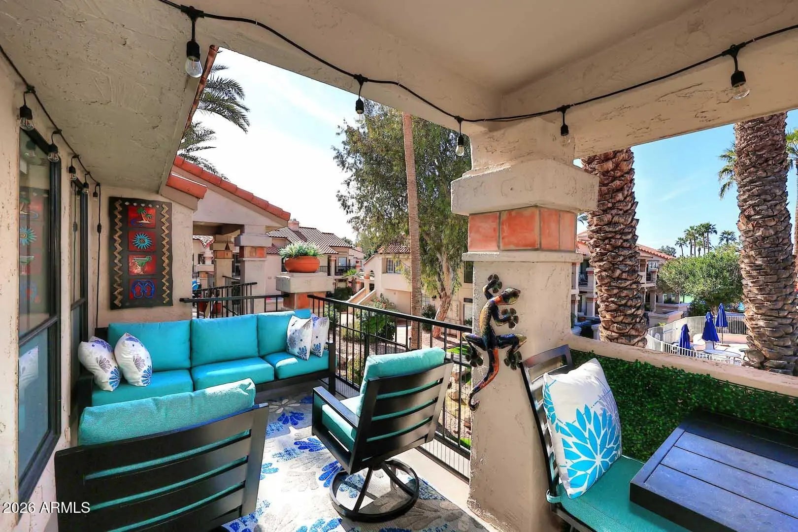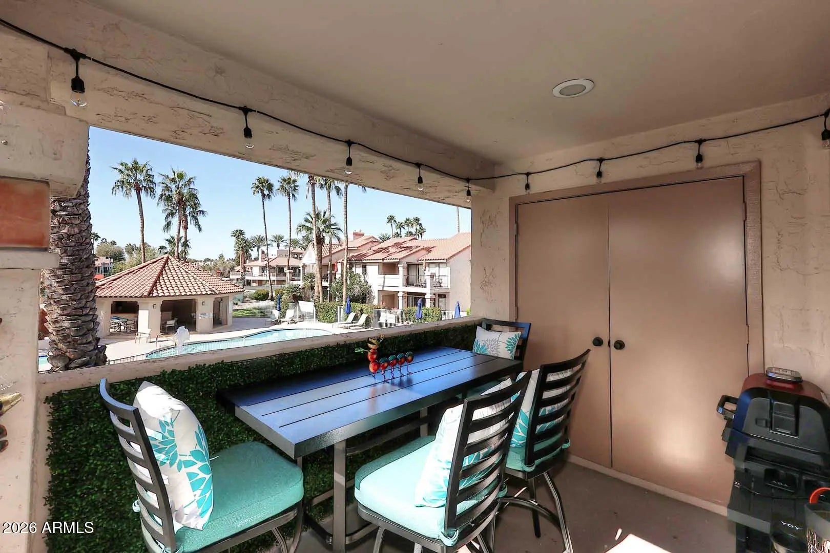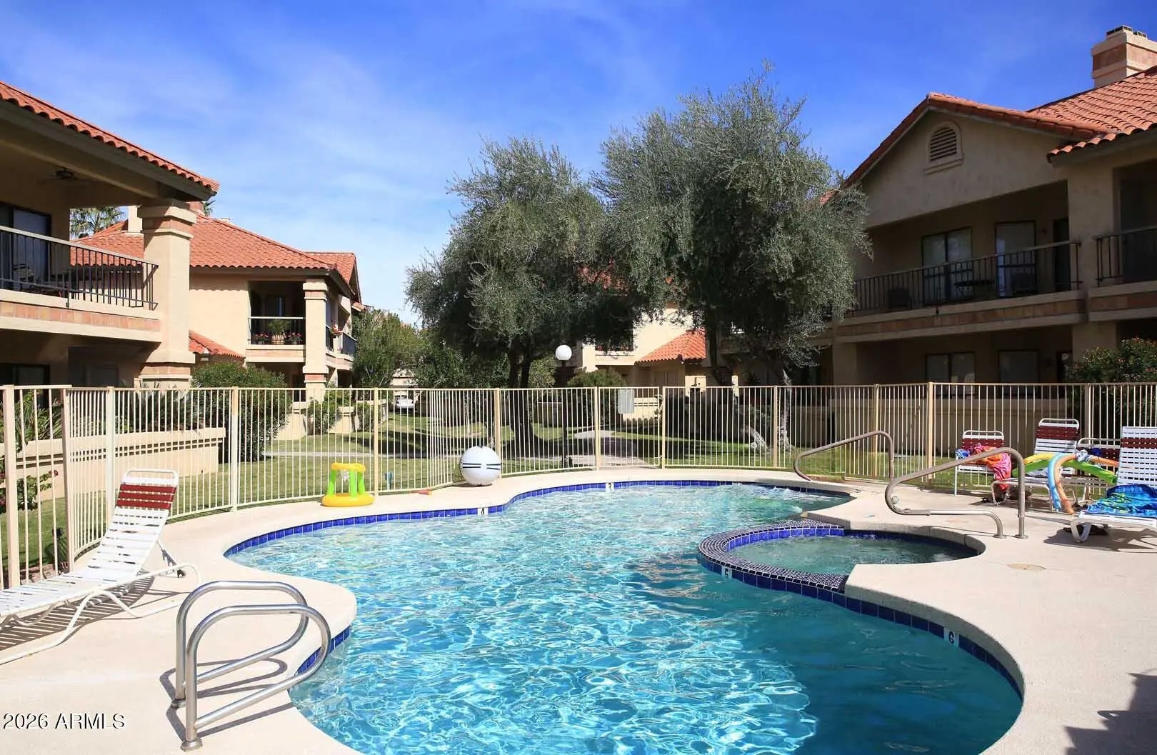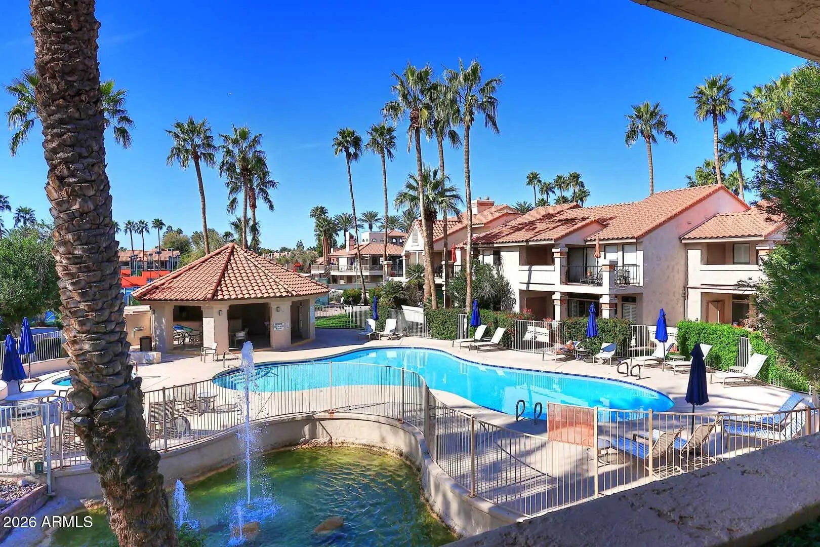Wow! What a beautiful property. Upper level overlooking 1 of 5 community pools. This shows great! Nothing to do here but move in. Nicely updated with SS appliances. 9 tennis courts, pickle ball, active clubhouse and fitness center with on site masseuse. On site EV stations in a resort style gated community. Close to Spring training and events. Free Kayaking on Scottsdale Ranch Lake for residents. Some furniture included.