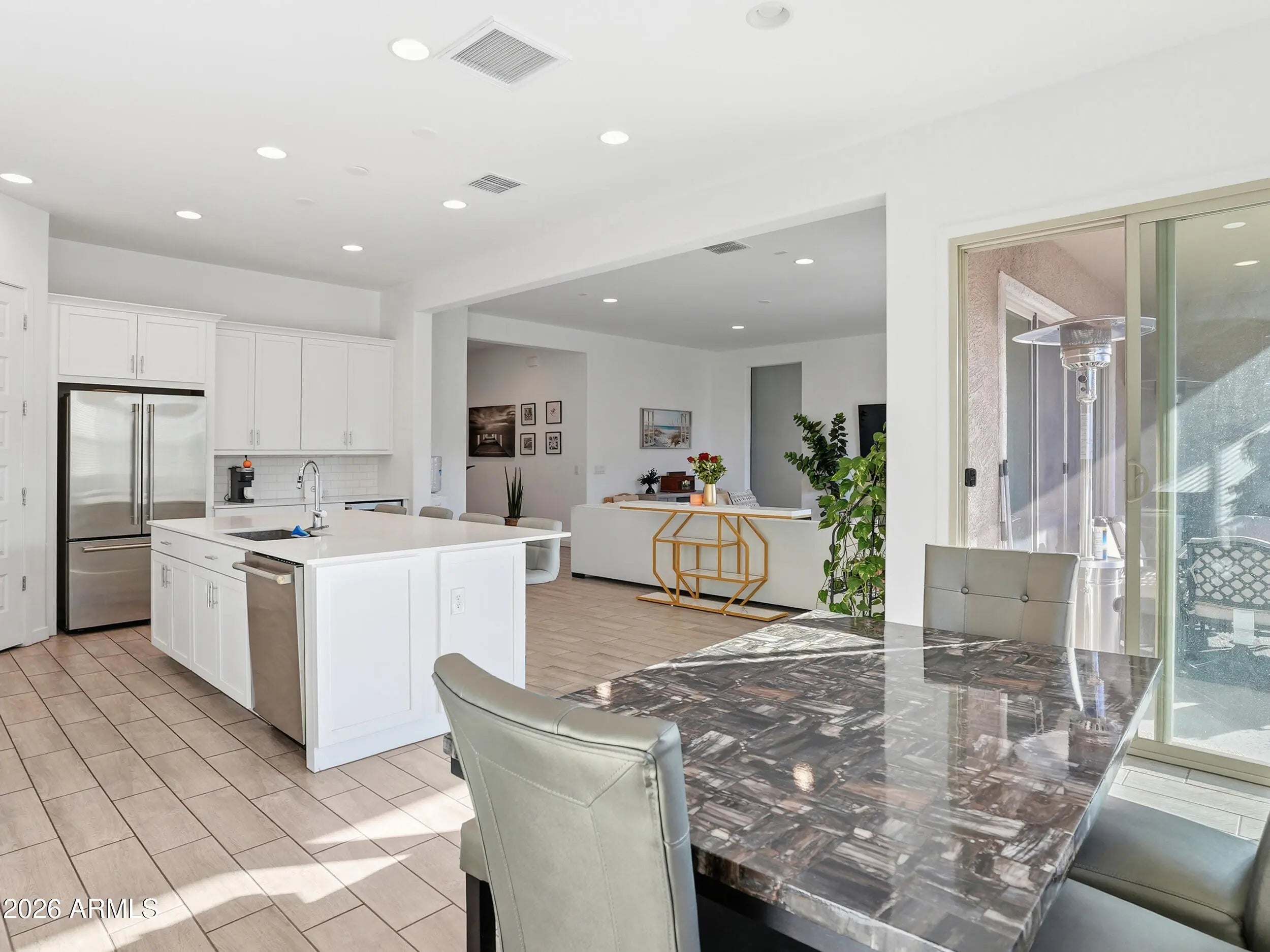 Welcome to this thoughtfully designed home offering generous living space and a highly functional split floor plan. Upon entry, a versatile game room is flanked by two secondary bedrooms and a full bathroom, ideal for guests, work, or play. The private primary suite features dual walk-in closets, a spa-inspired bathroom, and convenient access to the laundry room, while an additional secondary bedroom and bathroom are located down the hall. The heart of the home showcases an open-concept great room that seamlessly connects the chef's kitchen and dining area and opens to a covered patio for effortless indoor-outdoor living. Designer Platinum upgrades include quartz countertops, Sonoma Maple Linen (white) cabinetry, and stylish 7x22 plank tile flooring throughout the main living areas. Outside, the home continues to impress with an extended concrete pathway leading to the front yard, a widened driveway with additional concrete on both sides of the home, and three extra slab parking spaces in front. The backyard is designed for both relaxation and entertaining, featuring turf and pavers, a gazebo with full outdoor furniture, a gas fireplace, and a built-in two-burner setupall conveying with the property. Washer and dryer are also included, making this home truly move-in ready.