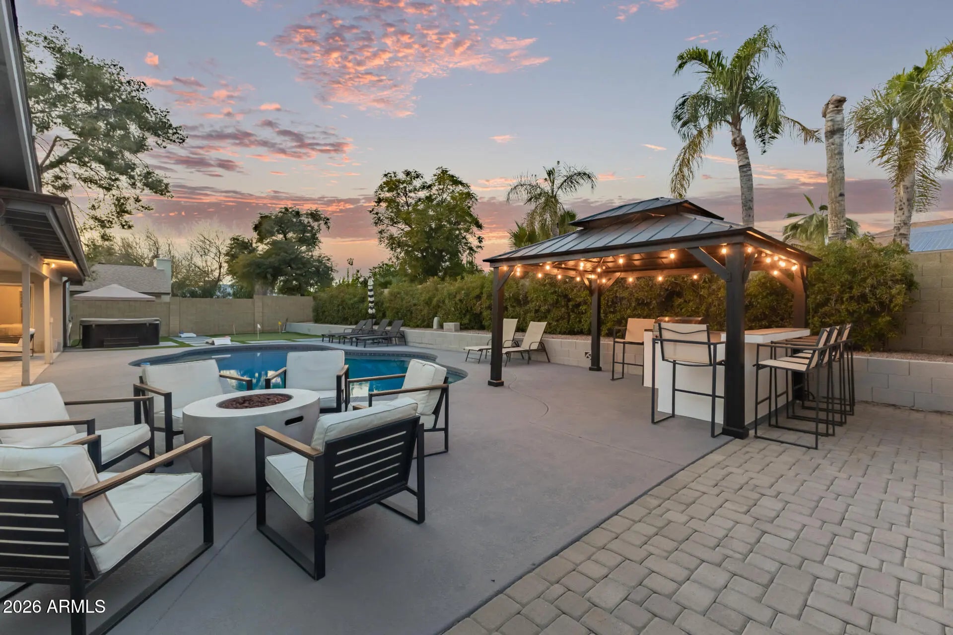 Welcome to 85254 zip code with this beautiful 5-bedroom, 3-bath home with a 3-car garage and a true resort-style backyard, ideally located near the Scottsdale Promenade, Kierland, Spring Training, Barrett-Jackson, the PGA golf course, and premier dining and shopping. Recently painted inside and in excellent condition. The large open, split floor plan is filled with natural light from multiple windows, creating an easy, connected flow throughout the home. The kitchen features quartz countertops, stainless steel appliances, and a striking waterfall quartz center island. The backyard is designed for entertaining, featuring a sparkling pool, hot tub, putting green, covered patio with pavers, gazebo, and built-in BBQ—your own private retreat and a must see!