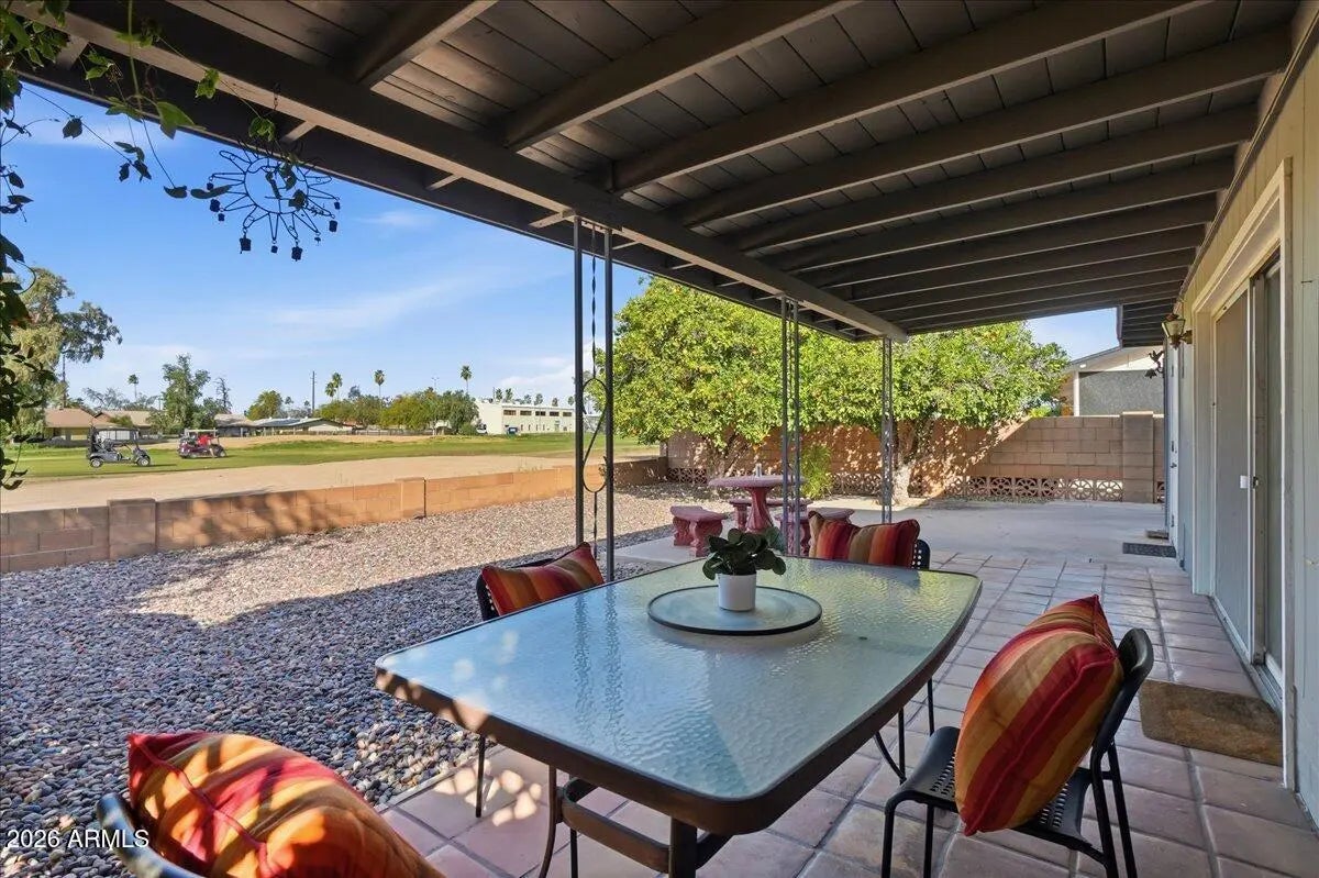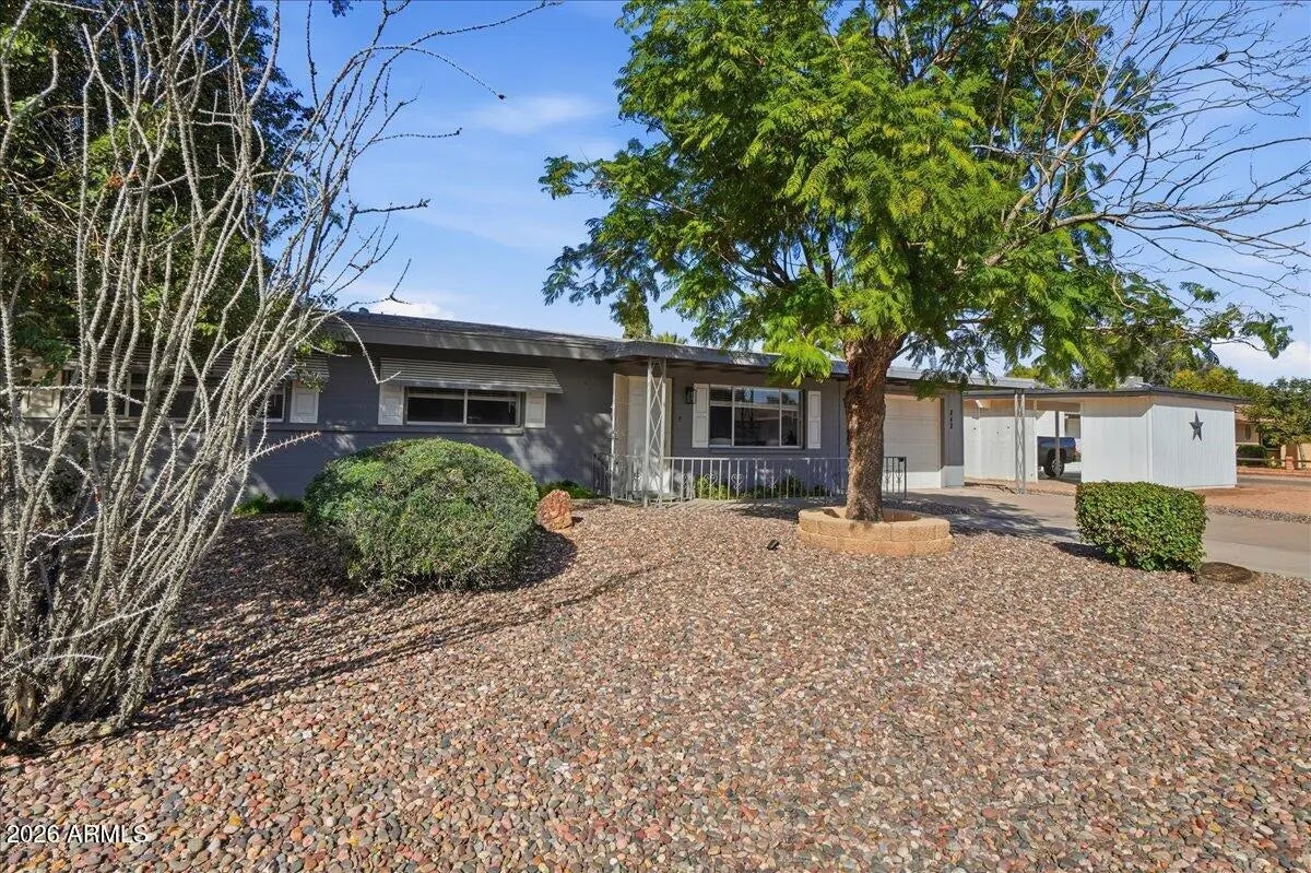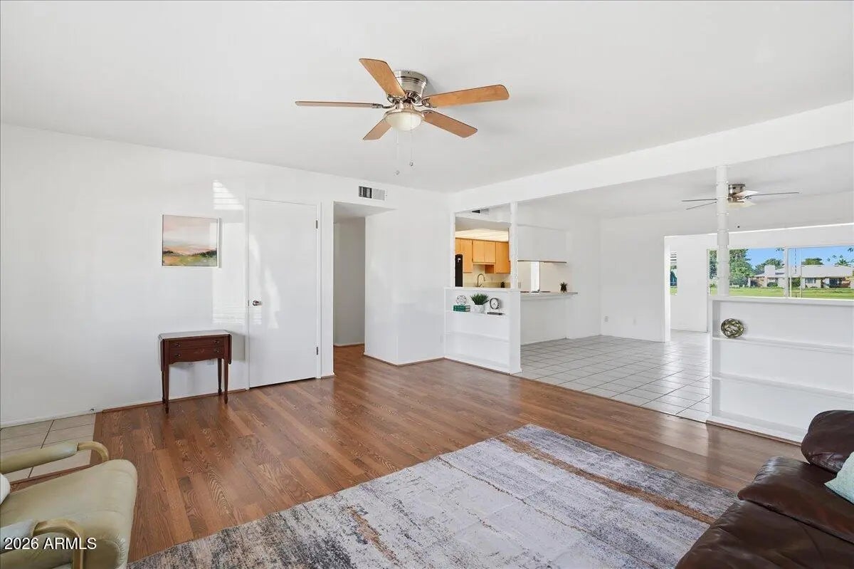 Welcome to this bright and spacious 3-bedroom, 2-bath home located in a desirable golf course community. The home offers multiple living spaces, including a comfortable living room, generous dining area, and an enclosed Arizona room providing flexible space for relaxing, working, or entertaining. The backyard backs the golf course, offering open views along with a covered patio and mature trees for shade and privacy. Interior features include large, light-filled bedrooms with vinyl and tile flooring, plus recent updates including fresh interior paint, new ceiling fans, and new window blinds. A one-car garage with additional space offers room for storage or a workshop. Conveniently located near US-60 with easy access to shopping and dining.