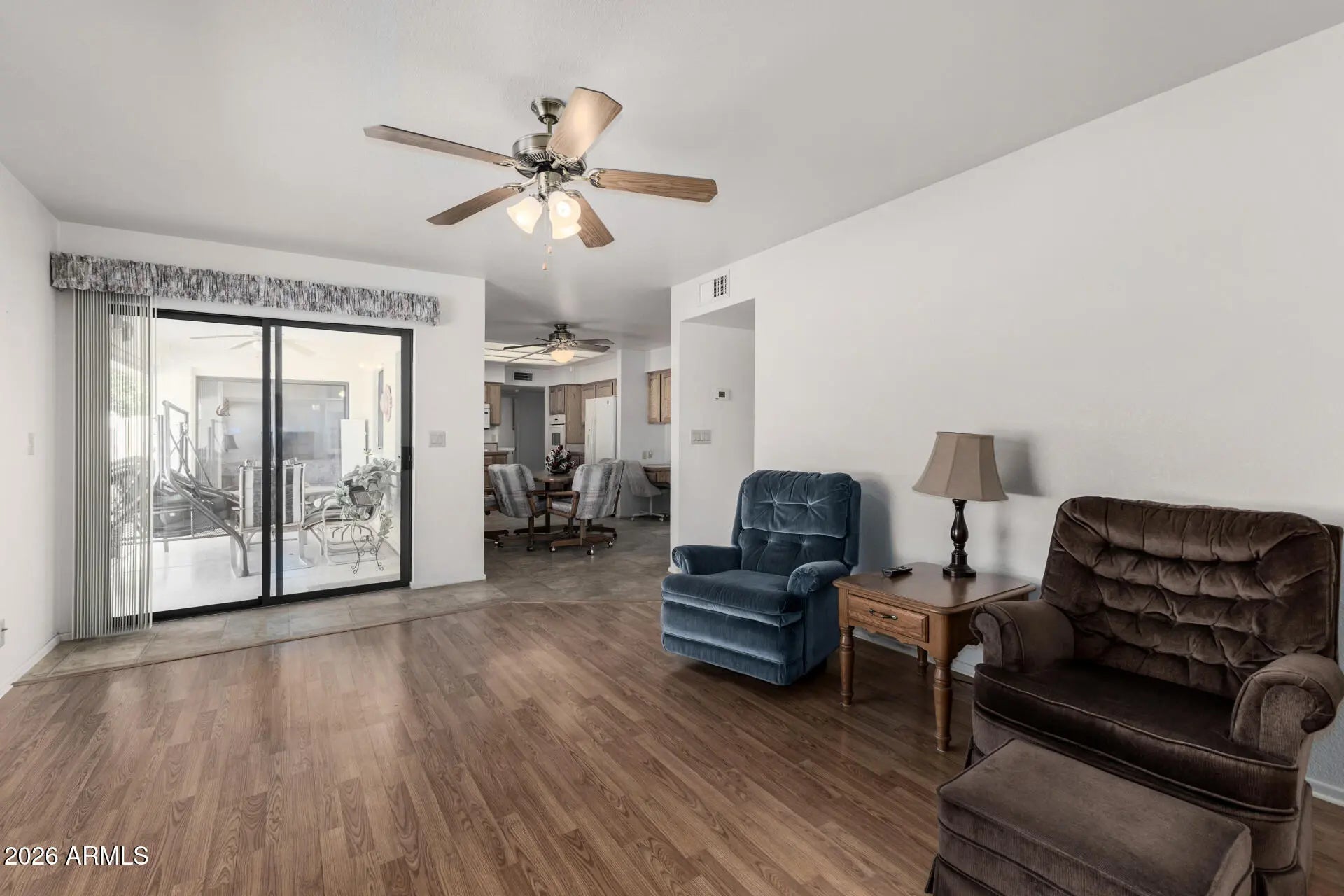 This Beautiful, well-maintained home in Sunland Village East offers 2 Large Bedrooms with Great Closet Space. A spectacular Eat - in - Kitchen. A family and Great room with Vaulted Ceilings. Magnificent natural light. Beautiful flooring throughout he home. Spacious Indoor Laundry, and a Two Car Garage. Corner lot with easily maintained landscape front and back. Added Storage shed in the fenced back yard. Covered front and back patios. Newer Roof, HVAC, Brand New Water Heater. What are you waiting for?!