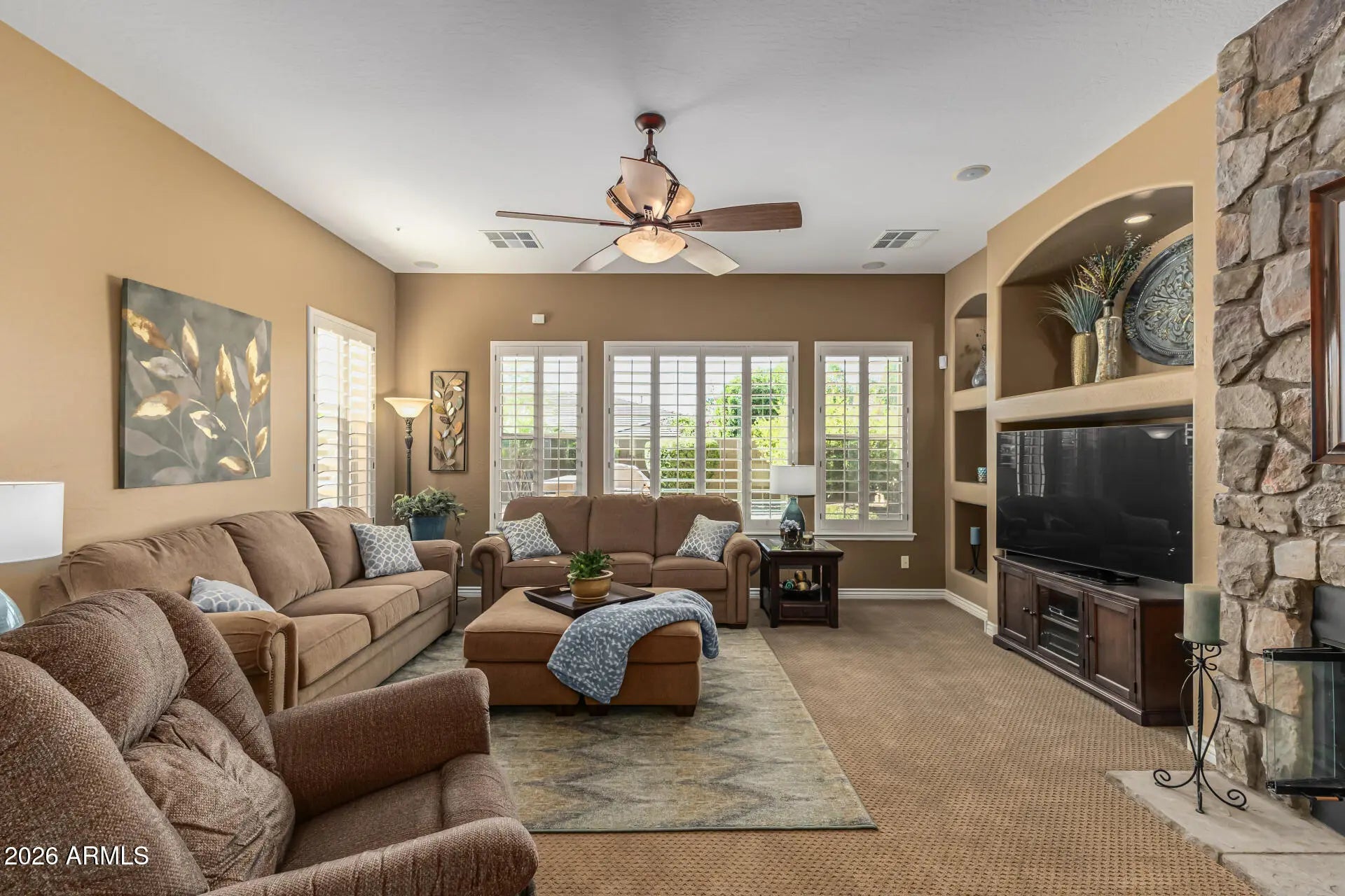 This original TW Lewis home provides sophisticated living from the upgraded elevation with custom stonework exterior; entry medallion, 10' ceilings, 8' raised panel doors, Large Primary Suite and 2 additional Bedroom Suites; Generous kitchen with secretary, buffet, granite slab counters, island, stainless Whirlpool appliances, walk-in pantry; Fireplace in the family room; courtyard with outdoor fireplace; 3-car garage; Primary Bath with glass block snail shower, his/her vanities, walk-in closet, separate soaking tub. Plantation Shutters throughout and sound system for BY, GR and Primary. The pre-paid leased solar system keeps your APS bills approx $45.54 per mo. Compare this beauty with any new build homes and you'll save, save, save. Come and make this beautiful gem your home today ...
