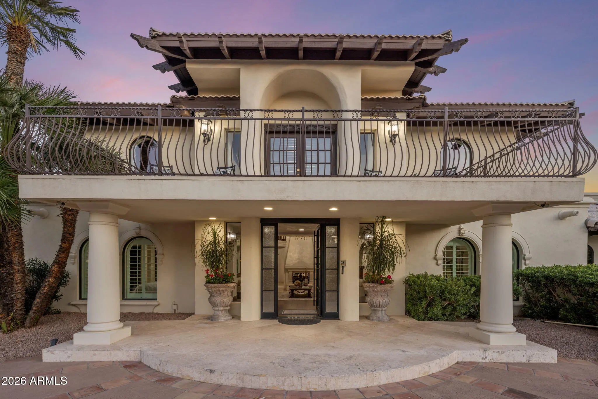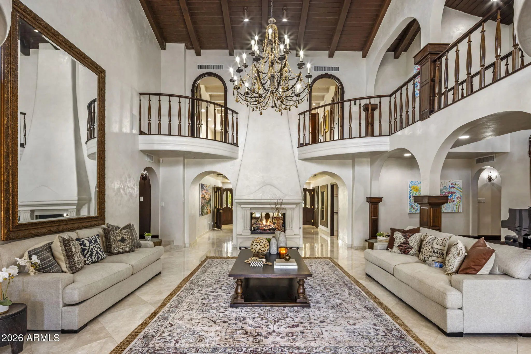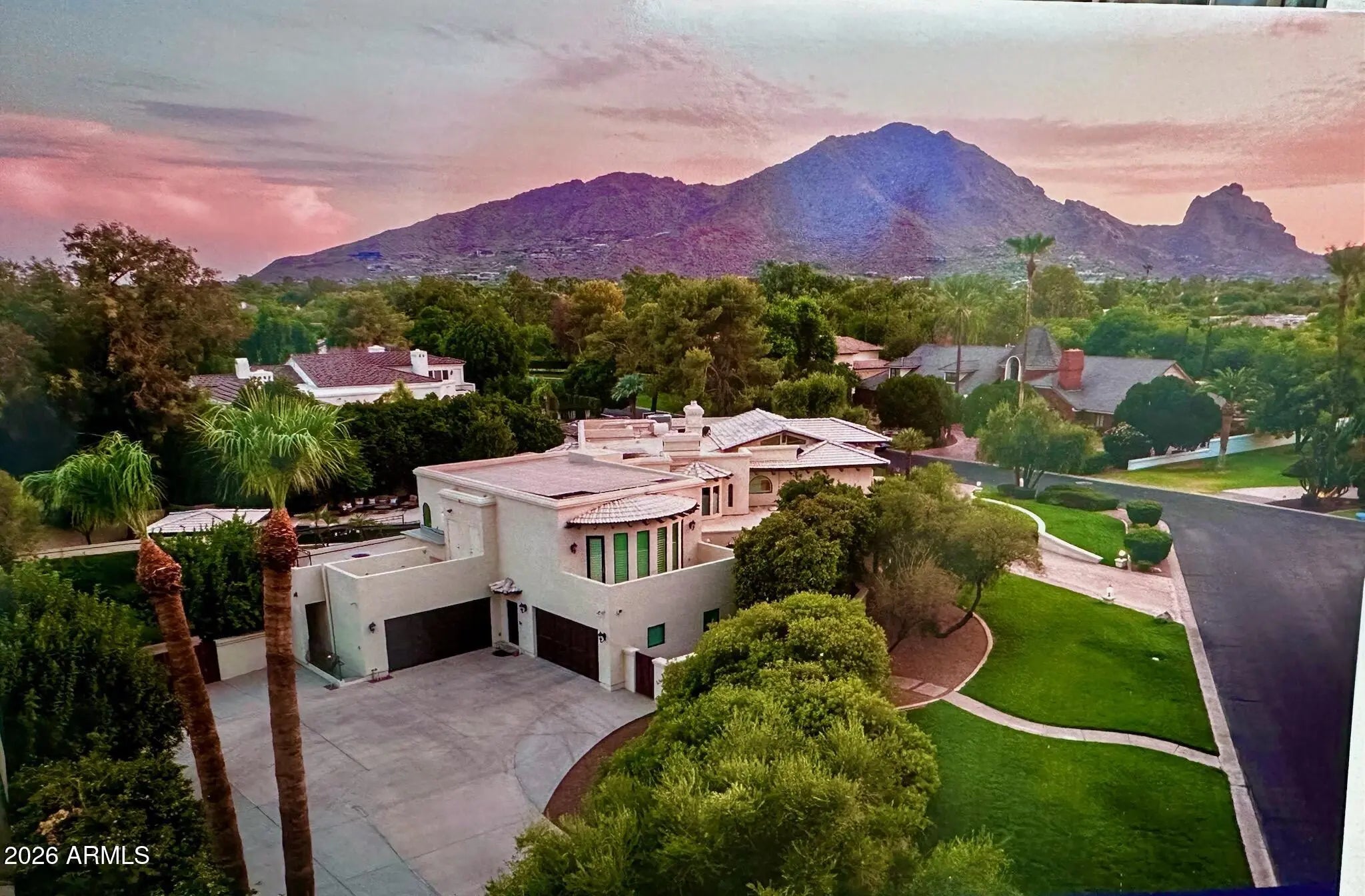 Tucked away in the quietest and most lush enclave of the exclusive La Place neighborhood in Paradise Valley, this extraordinary estate is a private sanctuary with breathtaking, unobstructed views of Mummy and Camelback Mountains. Spanning an impressive 12,021 square feet, the residence offers 6 bedrooms, 8 full bathrooms, and 3 powder rooms, seamlessly blending grand-scale luxury with thoughtful design for everyday living and entertaining. From the moment you arrive, the oversized circular driveway—ideal for hosting events or large gatherings—sets the tone, leading to separate attached garages. Enter through custom wrought iron doors and be immediately captivated by a dramatic two-story, double-sided gas fireplace. (CONTINUED) A whimsical chandelier draws your gaze upward from the elegant winding staircase to soaring, exposed beamed ceilings, creating a truly unforgettable first impression. Prefer not to take the stairs? An elevator effortlessly connects all levels of the home. The floor plan is both versatile and private, featuring three bedrooms on the upper level including the opulent primary quarters, and three additional bedrooms downstairs each with a private entrance and en suite bathroom perfect for guests or multi-generational living. Upstairs, multiple private balconies invite you to soak in the mountain views, including one with its own outdoor gas firepit. The primary retreat is nothing short of spectacular. The north section of the primary encompasses a full bathroom, expansive walk-in closet, private gym, and sauna. The opposite offers an additional full, spacious, spa like bathroom. Designed for both the discerning chef and the ultimate host, the gourmet kitchen features a Sub-Zero refrigerator, Viking range with prep sink, ice machine, large island, breakfast bar seating, and rich granite countertops. A fully equipped butler's pantry adds a second refrigerator, oven, microwave, dishwasher, and abundant storage to keep countertops pristine and entertaining effortless. The estate continues to impress with an enviable collection of lifestyle spaces, including an 850-bottle temperature-controlled wine cellar, a speakeasy-style bar with leather flooring, a private office, theater room, recording studio, billiards room, and two laundry rooms. Energy efficiency is thoughtfully addressed with owned solar, seven newer AC units (2023), and a new roof installed in 2023. Take the elevator down to the basement, where a unique room equipped with a lift to the garage awaits ideal for automobile or motorcycle enthusiasts, or easily reimagined as a golf simulator, batting cage, or custom recreational space. Outside, walls of sliding glass doors open to a tranquil backyard oasis with blood orange, lemon, orange and plums trees for your pleasure. Lush landscaping frames a calming fountain, inviting diving pool, ramada, and a fully equipped outdoor gas kitchen with marble countertops perfect for Arizona evenings under the stars. This is more than a home; it is a statement of refined living, privacy, and unparalleled luxury in one of Paradise Valley's most coveted neighborhoods.