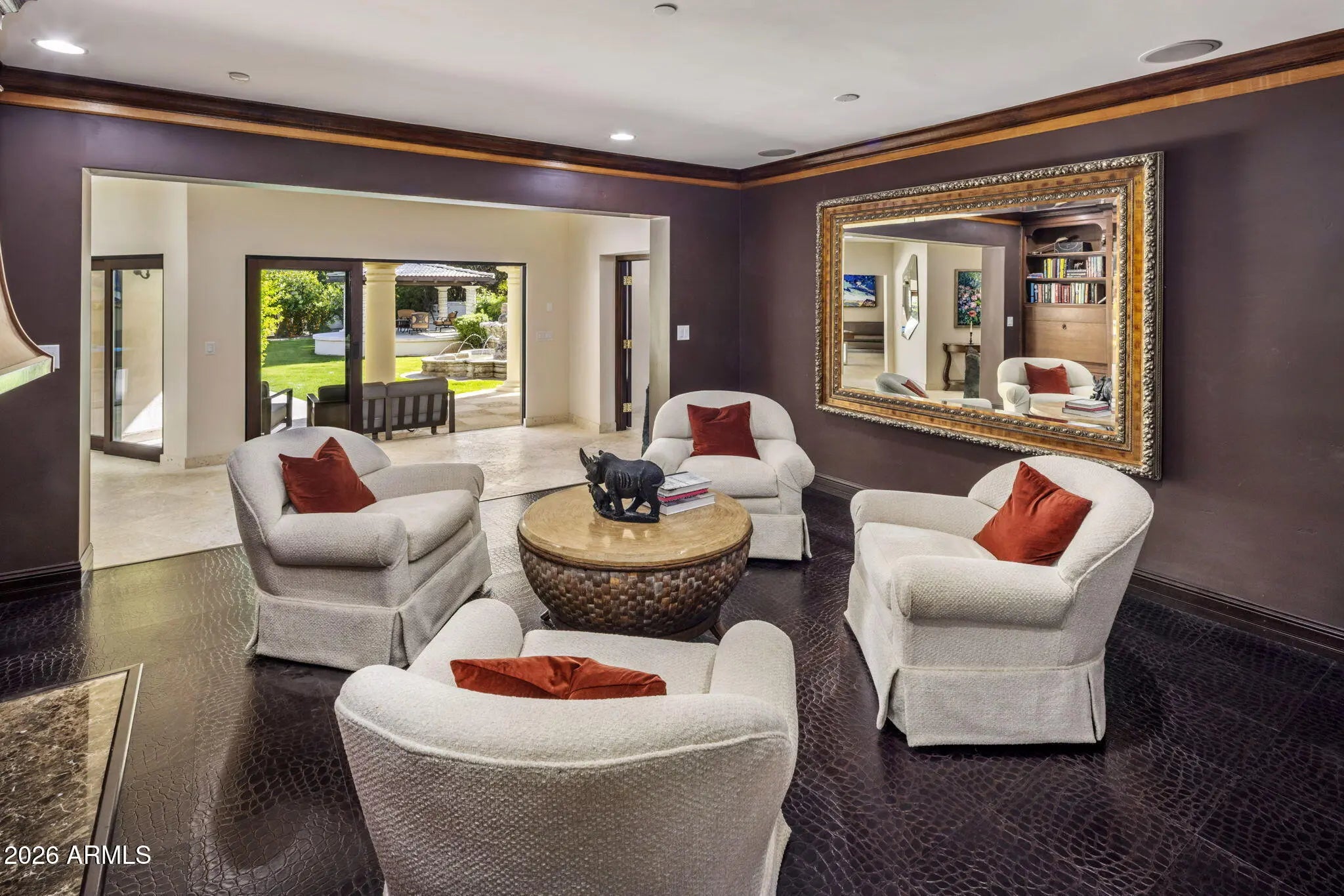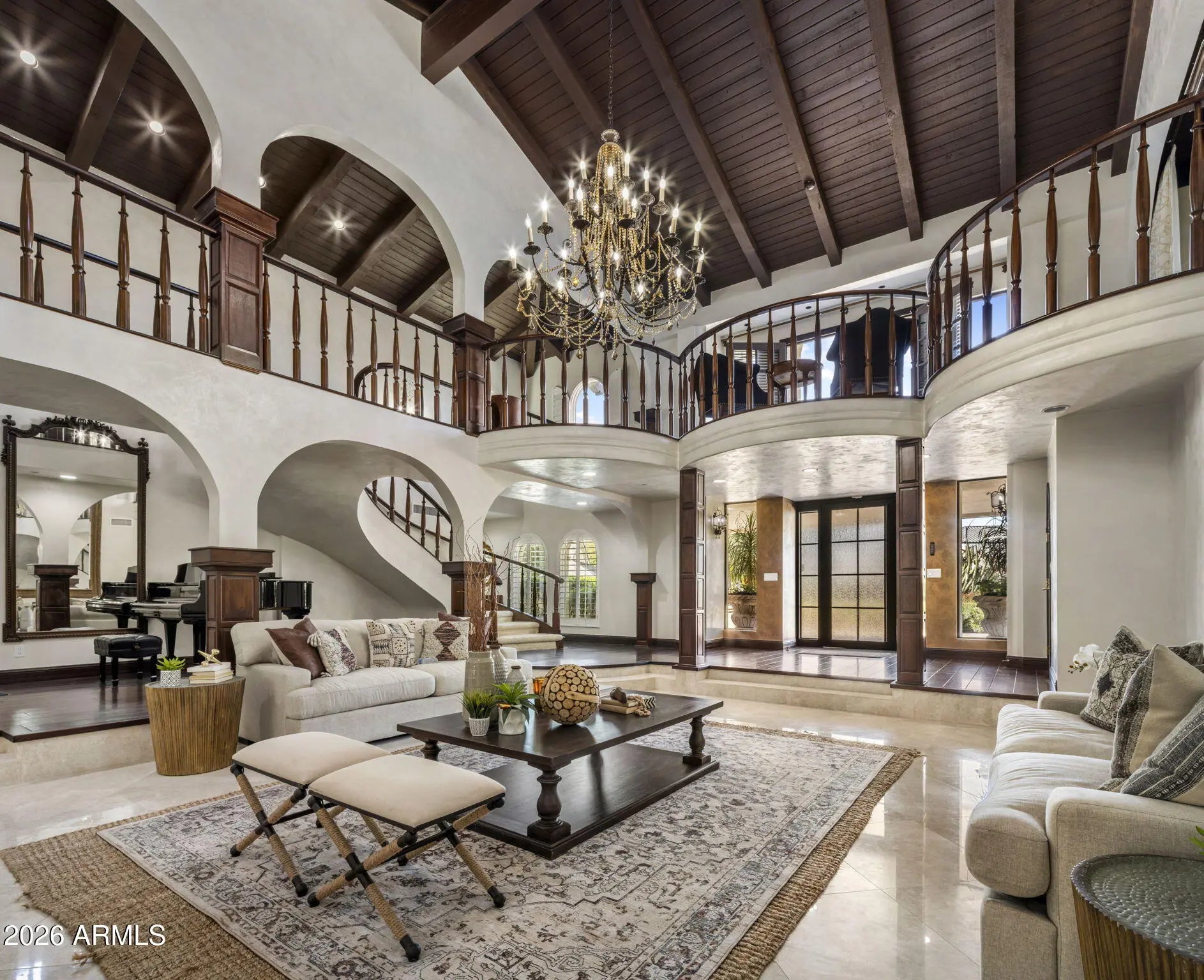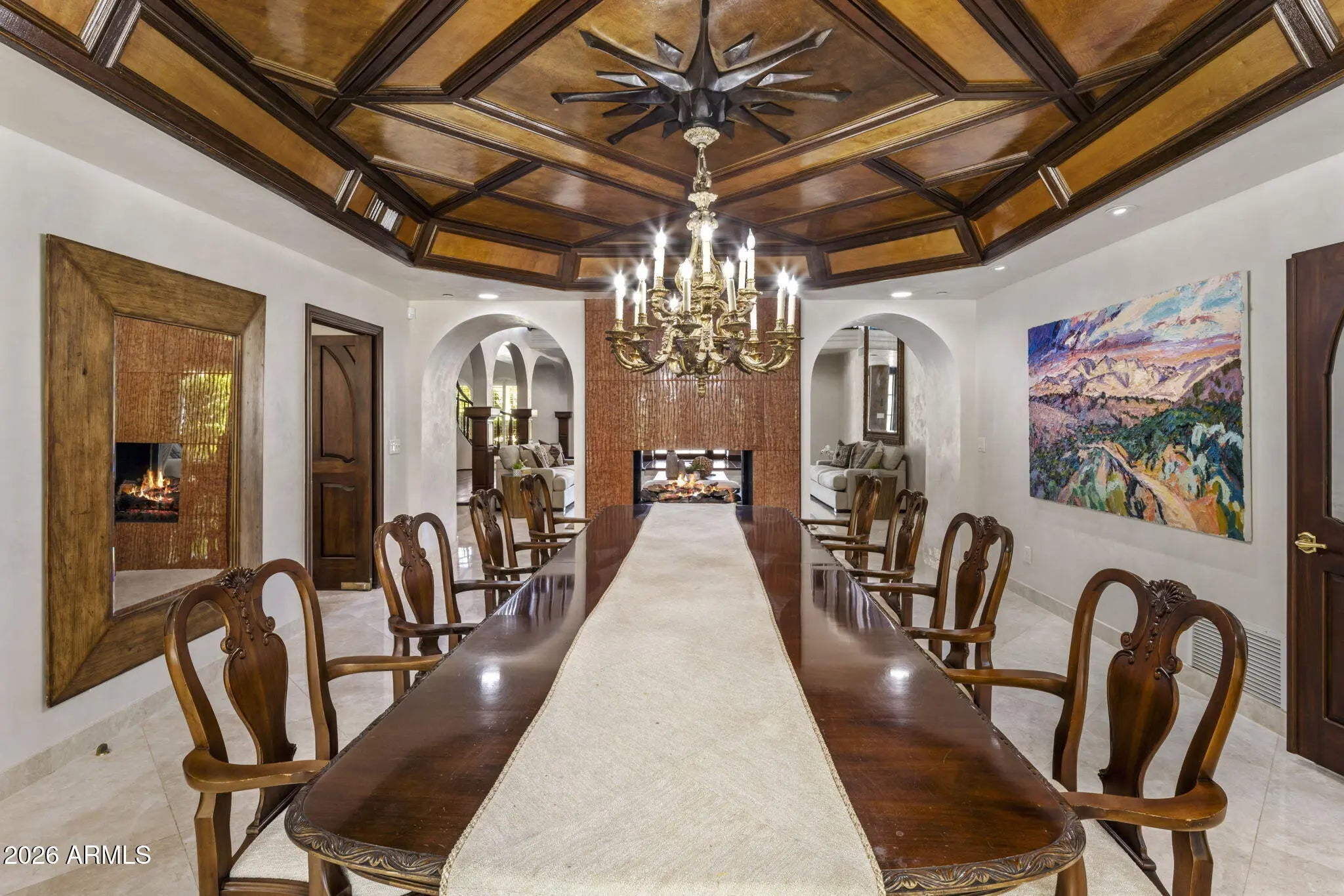 Tucked away in the quietest and most lush enclave of the exclusive La Place neighborhood in Paradise Valley, this extraordinary estate is a private sanctuary with breathtaking, unobstructed views of Mummy and Camelback Mountains. Spanning an impressive 12,021 square feet, the residence offers 6 bedrooms, 8 full bathrooms, and 3 powder rooms, seamlessly blending grand-scale luxury with thoughtful design for everyday living and entertaining. From the moment you arrive, the oversized circular driveway—ideal for hosting events or large gatherings—sets the tone, leading to separate attached garages. Enter through custom wrought iron doors and be immediately captivated by a dramatic two-story, double-sided gas fireplace. (CONTINUED) A whimsical chandelier draws your gaze upward from the elegant winding staircase to soaring, exposed beamed ceilings, creating a truly unforgettable first impression. Prefer not to take the stairs? An elevator effortlessly connects all levels of the home. The floor plan is both versatile and private, featuring three bedrooms on the upper level including the opulent primary quarters, and three additional bedrooms downstairs each with a private entrance and en suite bathroom perfect for guests or multi-generational living. Upstairs, multiple private balconies invite you to soak in the mountain views, including one with its own outdoor gas firepit. The primary retreat is nothing short of spectacular. The north section of the primary encompasses a full bathroom, expansive walk-in closet, private gym, and sauna. The opposite offers an additional full, spacious, spa like bathroom. Designed for both the discerning chef and the ultimate host, the gourmet kitchen features a Sub-Zero refrigerator, Viking range with prep sink, ice machine, large island, breakfast bar seating, and rich granite countertops. A fully equipped butler's pantry adds a second refrigerator, oven, microwave, dishwasher, and abundant storage to keep countertops pristine and entertaining effortless. The estate continues to impress with an enviable collection of lifestyle spaces, including an 850-bottle temperature-controlled wine cellar, a speakeasy-style bar with leather flooring, a private office, theater room, recording studio, billiards room, and two laundry rooms. Energy efficiency is thoughtfully addressed with owned solar, seven newer AC units (2023), and a new roof installed in 2023. Take the elevator down to the basement, where a unique room equipped with a lift to the garage awaits ideal for automobile or motorcycle enthusiasts, or easily reimagined as a golf simulator, batting cage, or custom recreational space. Outside, walls of sliding glass doors open to a tranquil backyard oasis with blood orange, lemon, orange and plums trees for your pleasure. Lush landscaping frames a calming fountain, inviting diving pool, ramada, and a fully equipped outdoor gas kitchen with marble countertops perfect for Arizona evenings under the stars. This is more than a home; it is a statement of refined living, privacy, and unparalleled luxury in one of Paradise Valley's most coveted neighborhoods.