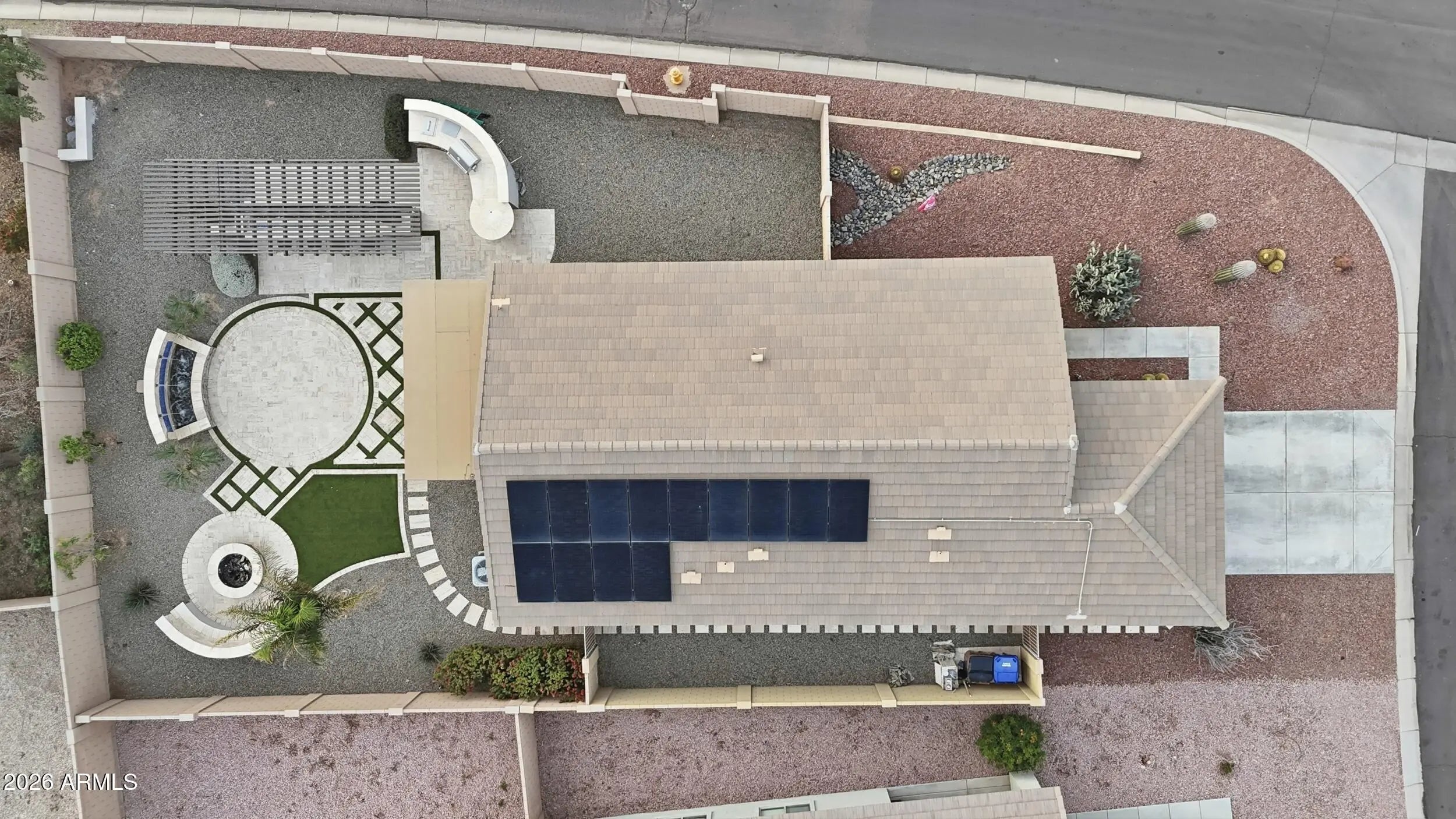 Charming home offering 2 bd/2 ba and versatile den off the main living area. The layout is open, functional and ideal for both everyday living and entertaining. The outdoor resort-style living space truly stands apart. Featuring a soothing water feature, custom pergola with bar seating, and sleek oblong gas fire insert with reflective fire glass. An outdoor kitchen, expansive paver patios, ambient landscape lighting, and multiple gathering areas create the perfect setting for hosting or unwinding. Turf accents and curved hardscape details add visual interest while keeping maintenance low. Designed for year-round enjoyment, this backyard is perfect for sunset dinners, weekend gatherings, or quiet evenings under the stars.