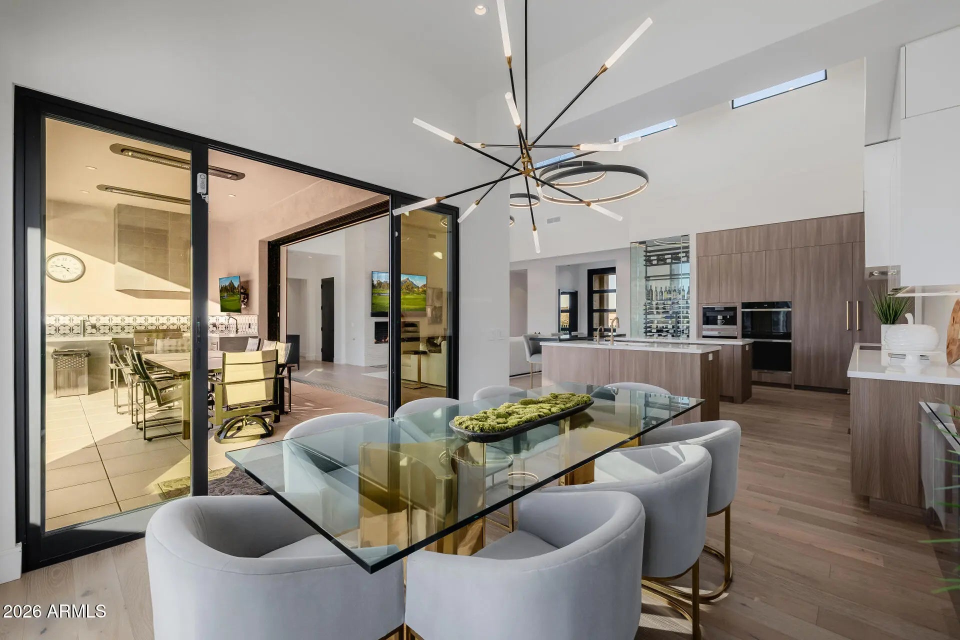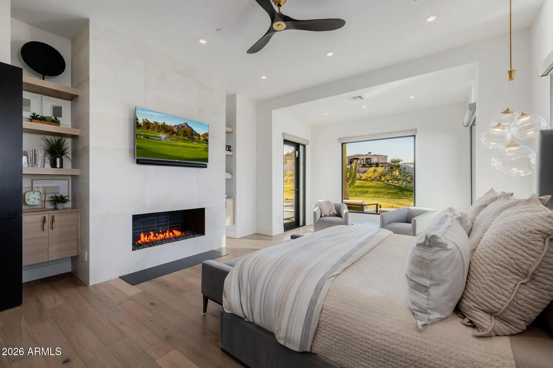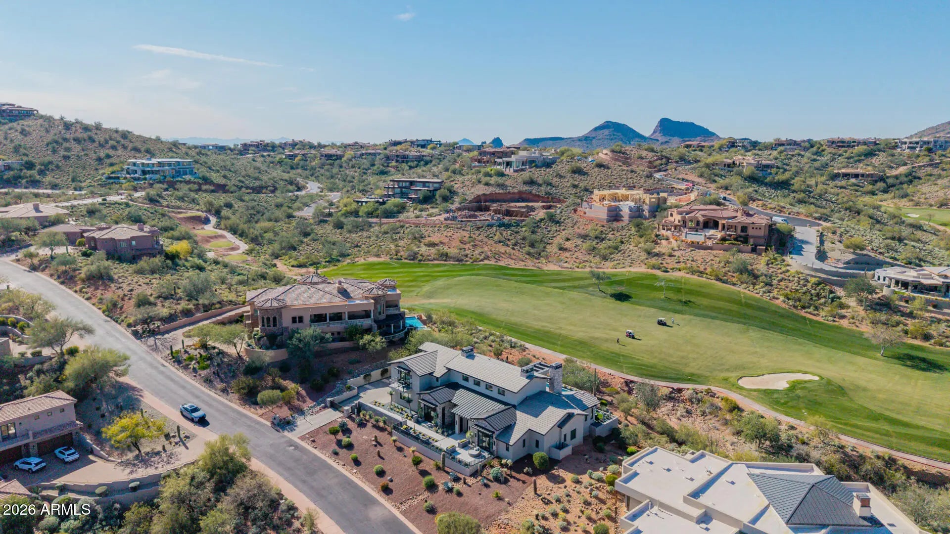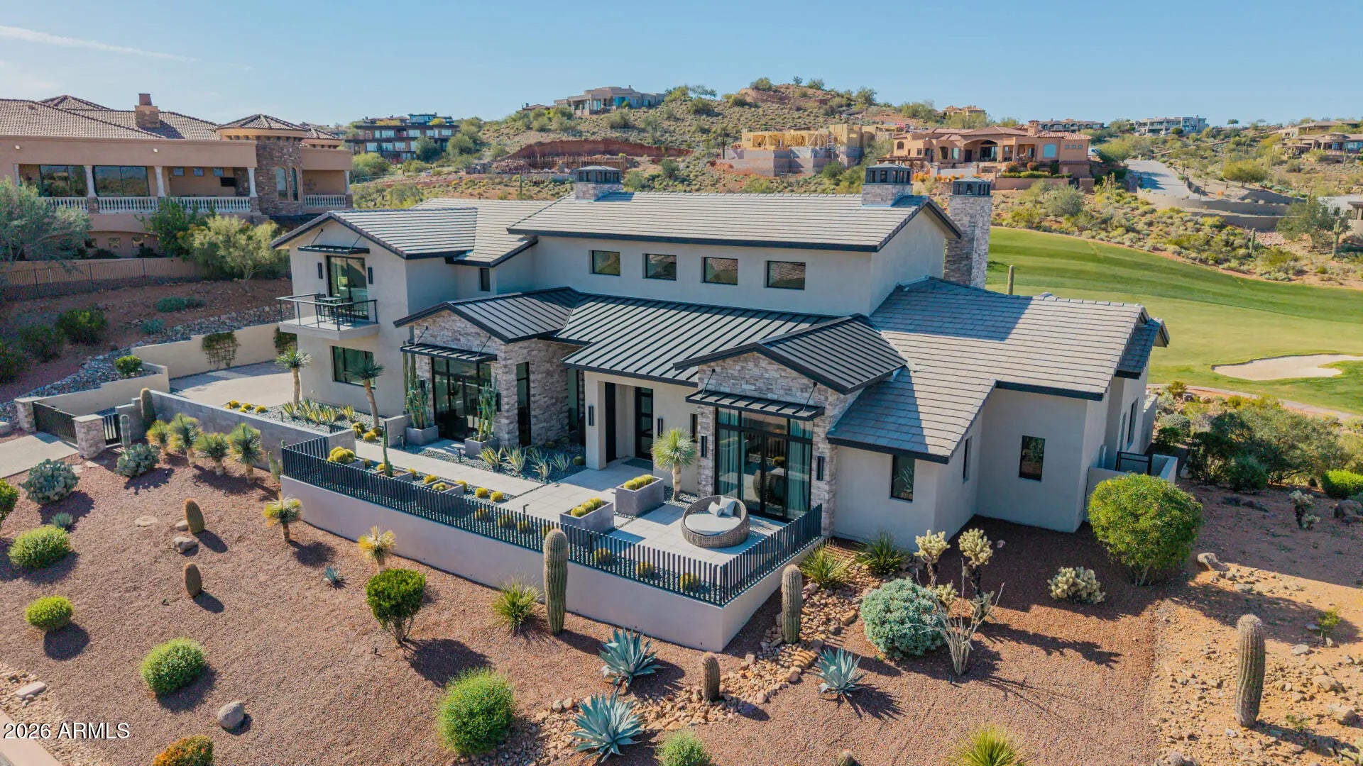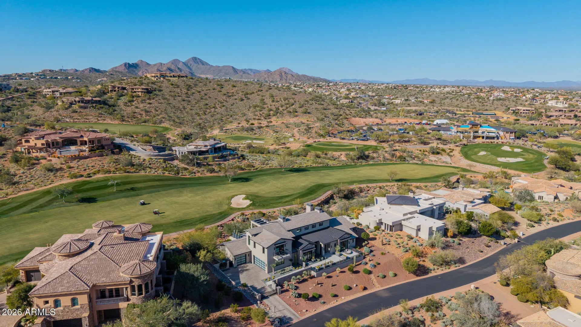 Rare opportunity to purchase this stunning 2021 Mark Candelaria designed custom home at Firerock Country Club. The home has an open floor plan with a panoramic view over the 18th hole with mountain & sunset views. A split floor plan with all of the bedrooms and main living areas on the first floor with no interior steps. The upstairs retreat has a bar & entertainment/game area and a spacious Trackman golf simulator bay. The outdoor entertainment area has a generous covered patio with built-in heaters, a great outdoor kitchen setup with multiple cooking options and a kegerator that overlooks the resort style pool with a magnificent water feature. Very high end finishes from top to bottom with Wolf & Subzero appliance package, Savant smart home technology , private gate and so much more!