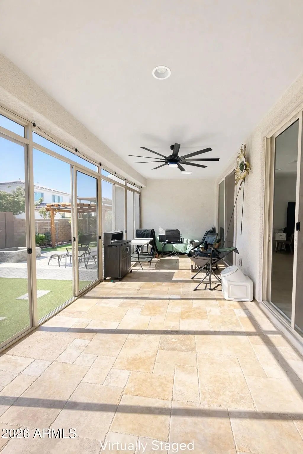 Better than new with tens of thousands in upgrades, this beautifully enhanced 2022-built home in Estrella Mountain Ranch features a professionally designed backyard oasis already completed for you. The outdoor space includes a screened-in Arizona room, custom pergola, paver patio, firepit area, and thoughtfully designed desert landscaping--perfect for relaxing or entertaining year-round. Inside, the open-concept layout offers high ceilings, abundant natural light, and modern finishes throughout. The kitchen features quartz countertops, stainless steel appliances, upgraded cabinetry, tile backsplash, center island, and walk-in pantry. The spacious primary suite includes a dual-sink vanity and oversized walk-in closet with direct access to the laundry room. Located in the award-winning Estrella Mountain Ranch community offering resort-style amenities including lakes for kayaking and fishing, golf, pools, fitness centers, pickleball, tennis courts, parks, and over 65 miles of hiking and biking trails. Also listed for Rent at $2500/month