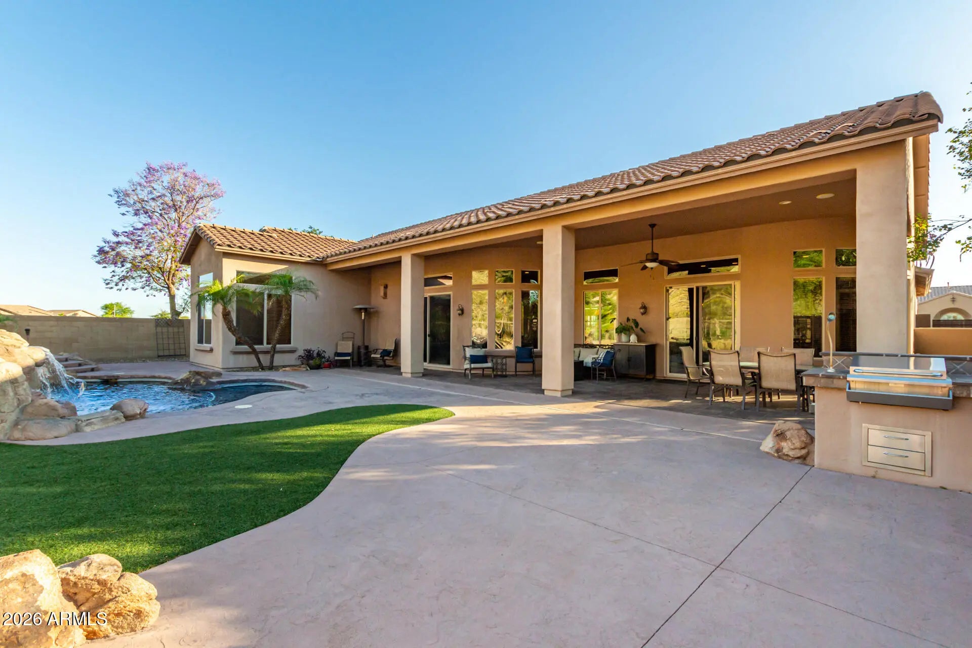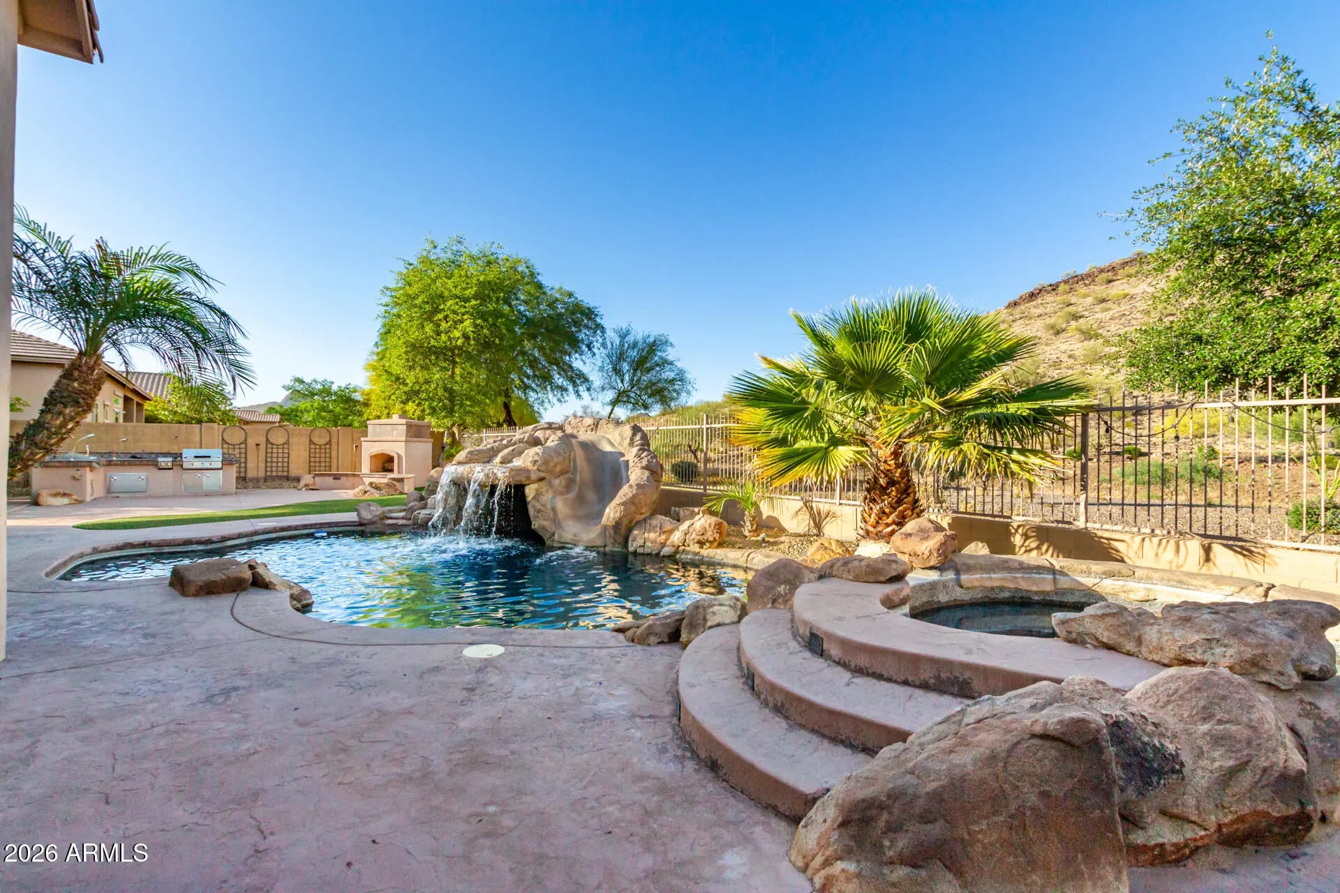 Executive Single-Story Residence in Stetson Valley - Corporate & Relocation Lease Welcome. This expansive luxury home offers nearly 4,000 square feet of living space, privately situated on a quiet cul-de-sac and backing to greenbelt open space for enhanced privacy. The interior opens through a grand foyer into the living and entertaining spaces. The chef-style kitchen includes gas cooktop, double ovens, stainless steel appliances, a large walk-in pantry and abundant counter and storage space, suitable for both everyday living and entertaining. The primary suite serves as a private retreat with an oversized bedroom, expansive walk-in closet and a spa-style shower. The residence offers four additional spacious bedroom suites, each with a full private bathroom and walk-in closet. Designed for elevated indoor-outdoor living, the home features an expansive courtyard and resort style backyard with mountain views, a sparkling pool and spa, water features, slide, grotto and multiple outdoor living areas. A built-in BBQ, gas fireplace, covered patio and professionally designed outdoor spaces create an ideal setting for relaxation or hosting guests. Additional executive level features include 12-foot ceilings, surround sound, projector and media wiring, RV gate, artificial turf, a private putting green and direct access to Deem Hills Park hiking trails from the backyard. This unfurnished executive residence is well-suited for corporate, relocation or long-term professionals with proximity to major employment corridors including the North Phoenix / semiconductor and technology campuses. Landscaping and pool service may be included depending on lease terms. Long-term tenancy preferred.