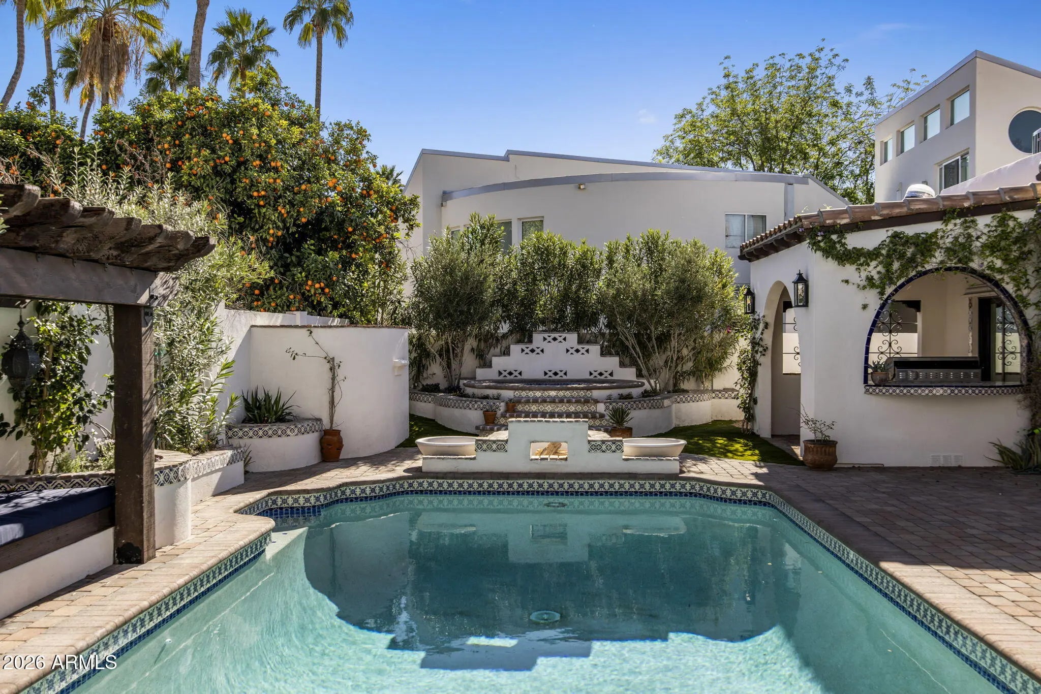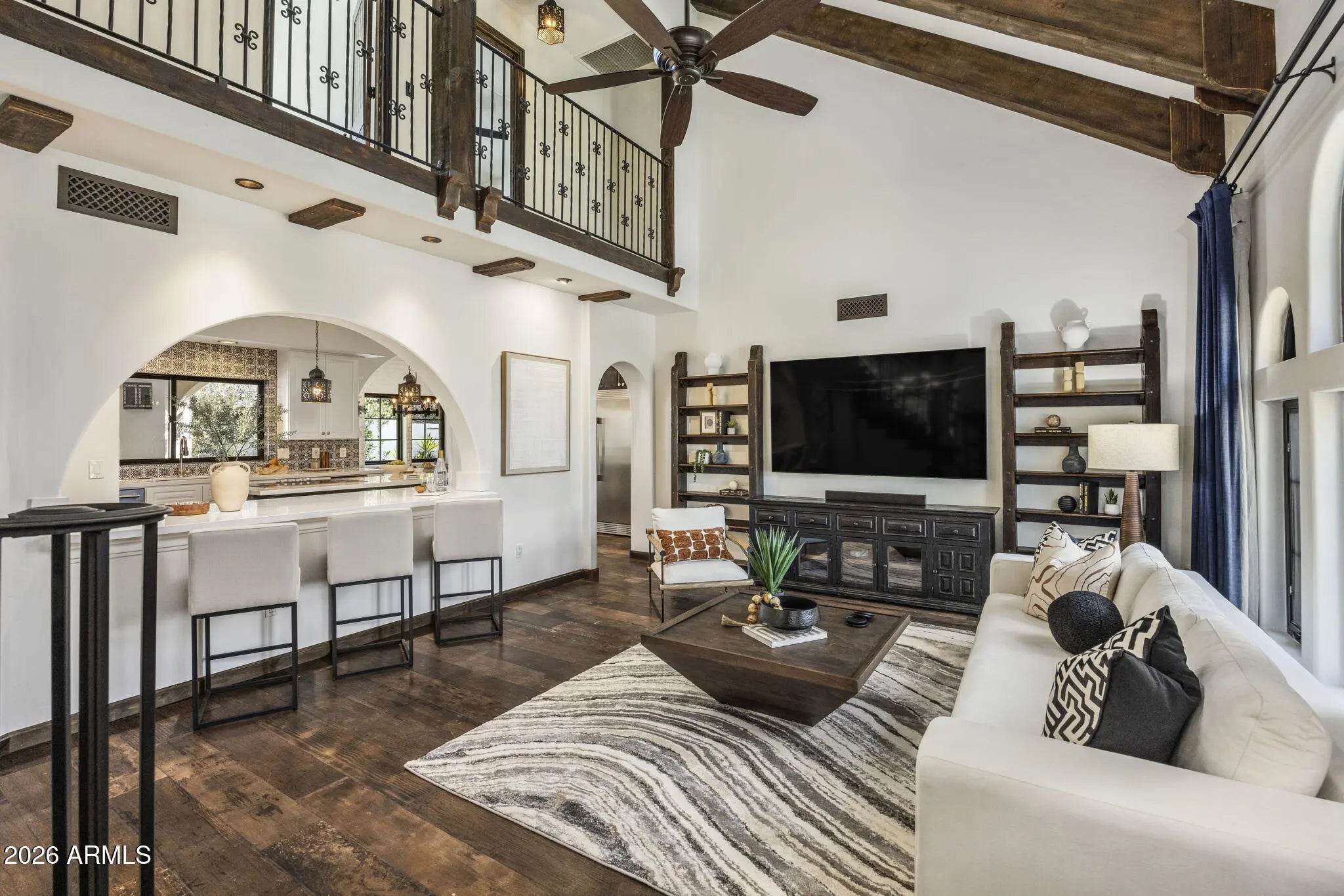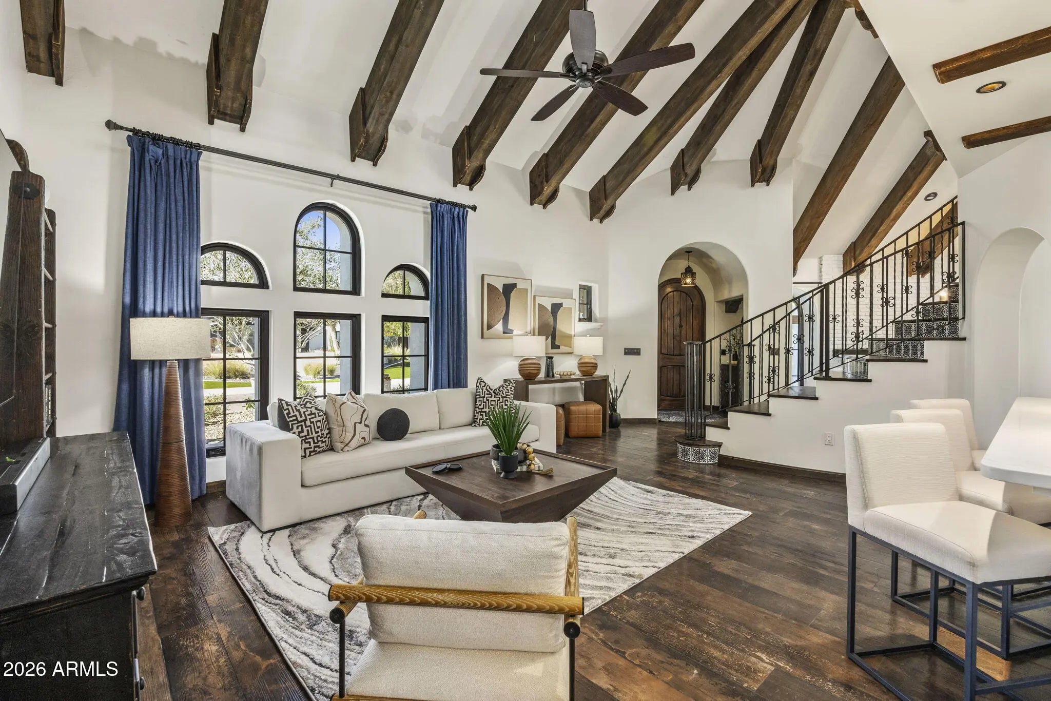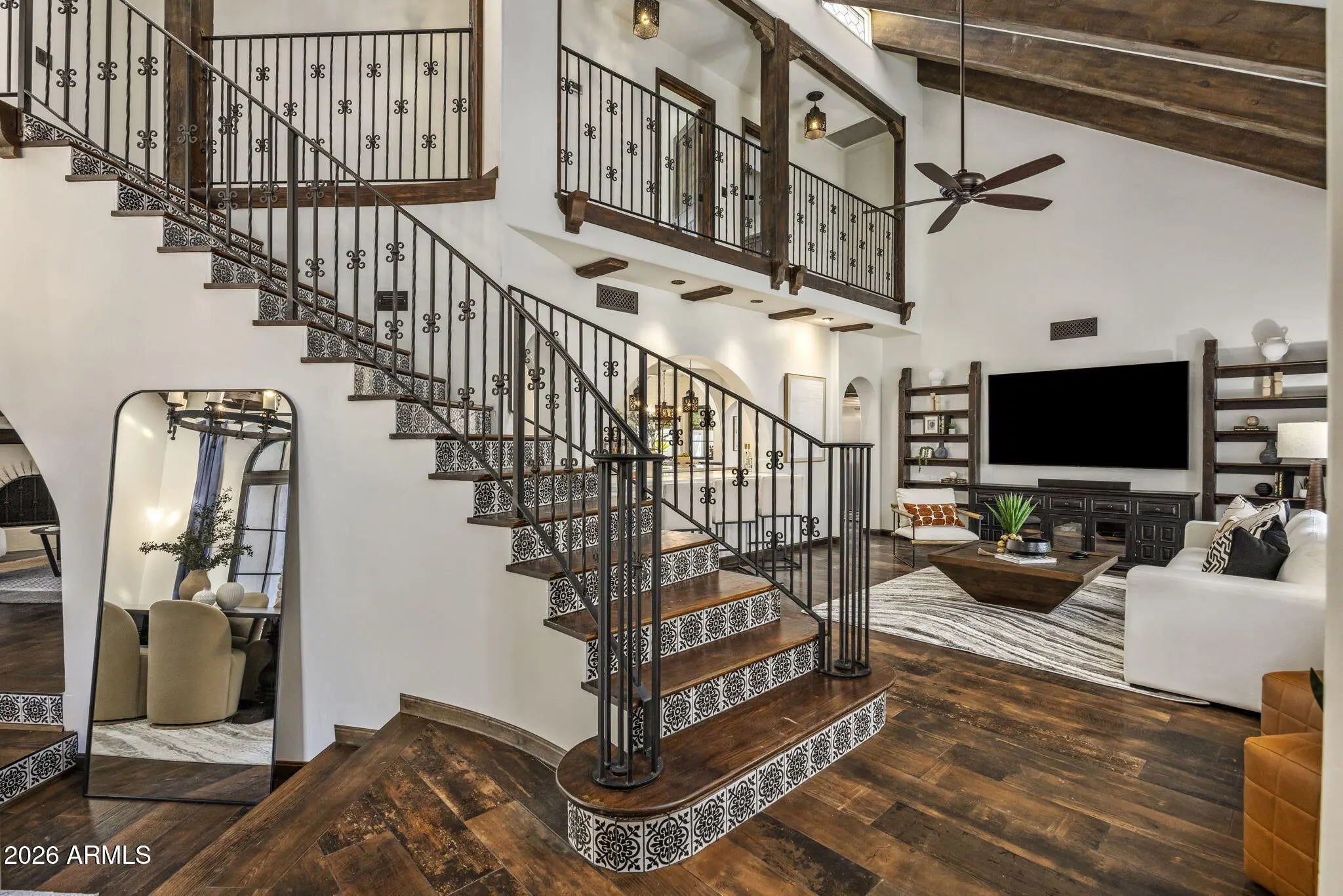 A true Jewel Box in McCormick Ranch, this fully reimagined Santa Barbara-inspired estate blends timeless architecture with refined modern luxury. Rich wood-like floors, exposed beams, arched passageways, and custom built-ins frame light-filled living spaces and an elegant chef's kitchen overlooking the great room. The 4-bed, 3-bath layout spans 3,639SF with main living on the first level and guest quarters above. Outdoors, a resort-style courtyard showcases a sparkling pool, fire feature, spa with cold plunge, and lush desert landscaping. Ideally located in the heart of McCormick Ranch, moments from premier dining, golf, hiking trails, shopping, and the scenic greenbelt, this residence offers an exceptional blend of charm, sophistication, and lifestyle. See document tab for features list
