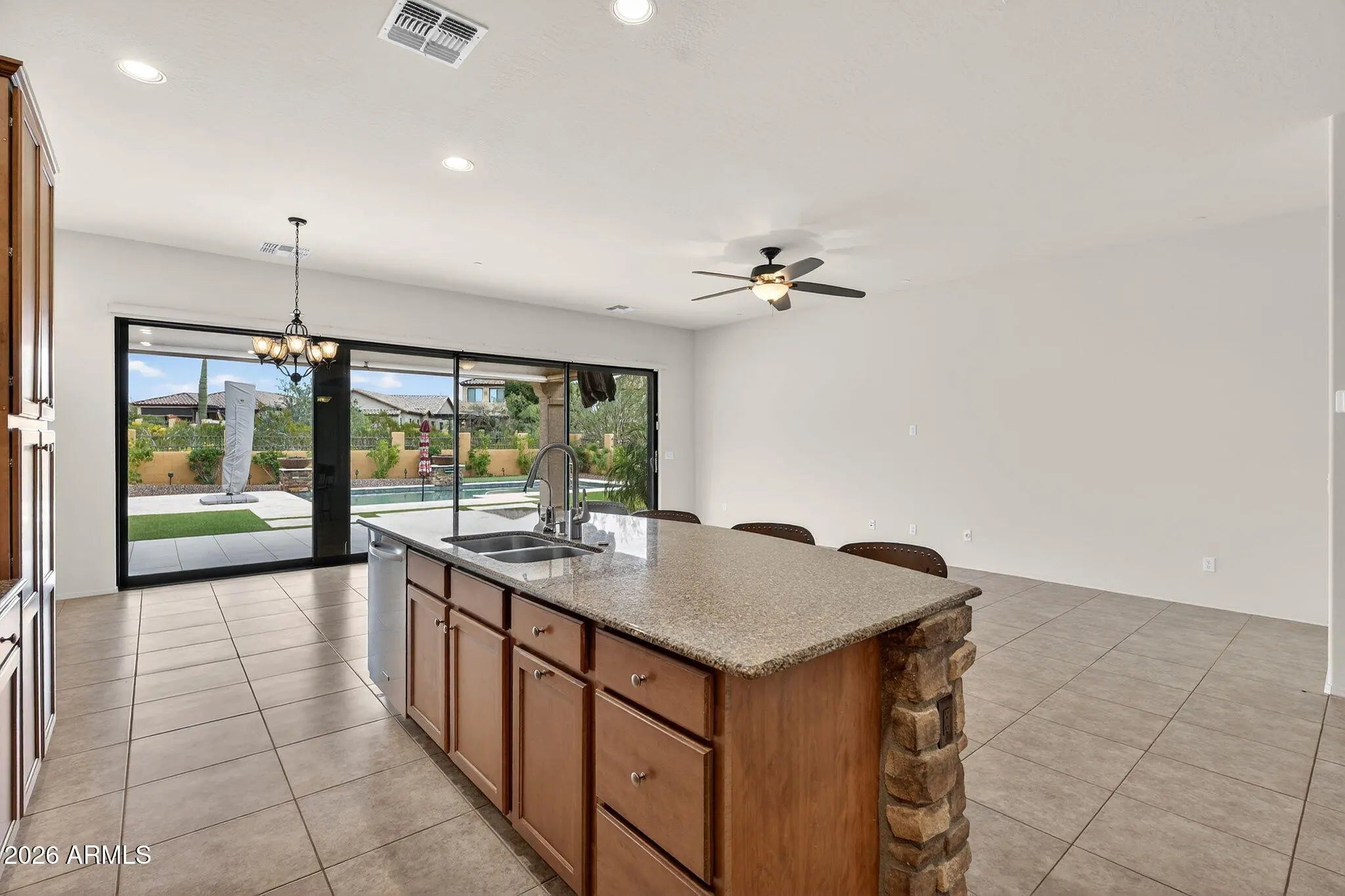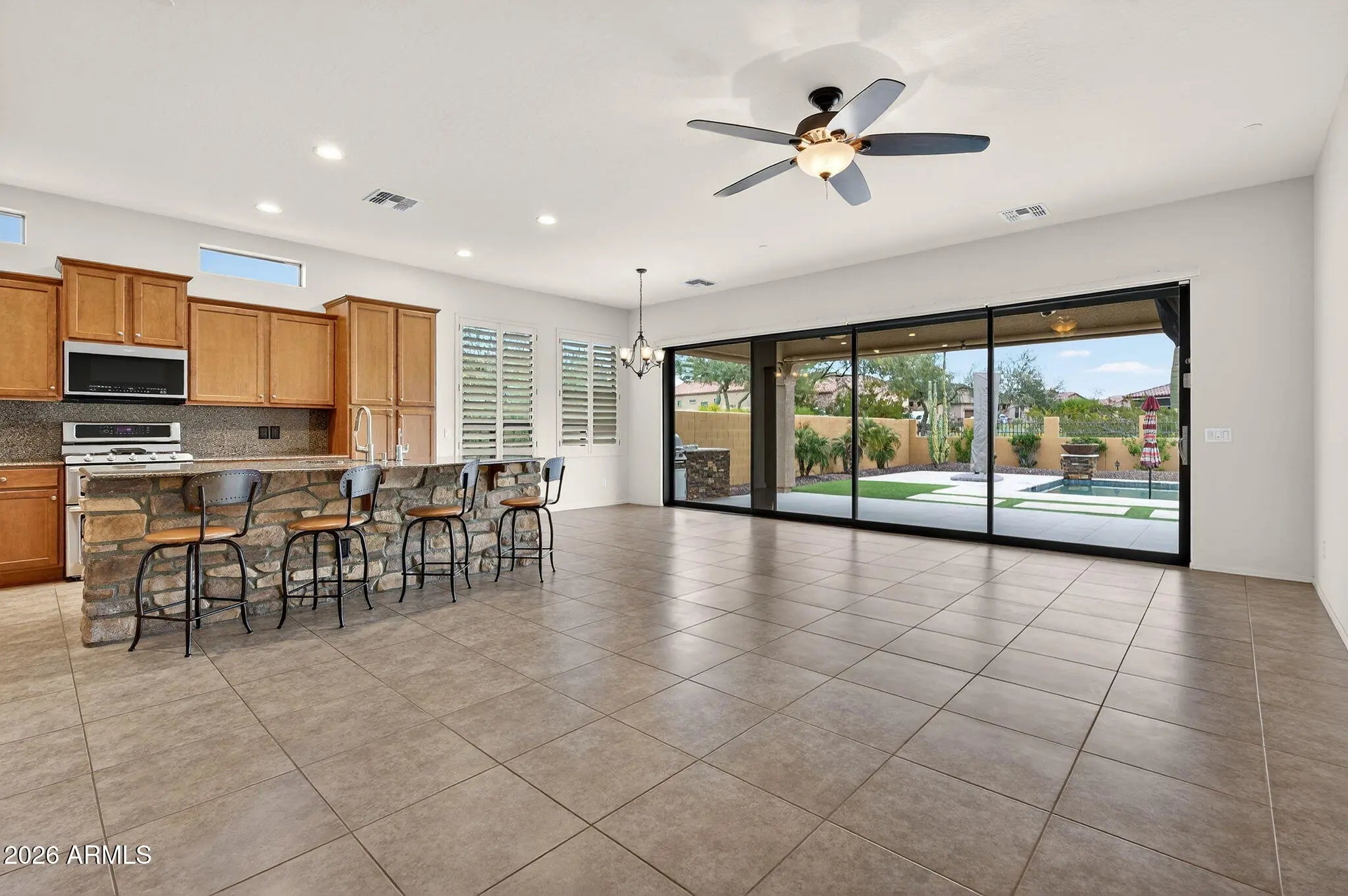 Welcome to your new AZ home in one of Mesa's most sought after GATED RESORT STYLE community of MOUNTAIN BRIDGE. This meticulously maintained 3-bedroom, 3-bathroom SINGLE LEVEL home. Inside, you'll find a flowing SUN FILLED OPEN STYLE layout, anchored by a GOURMET KITCHEN with GRANITE COUNTERTOPS, a OVERSIZED ISLAND wrapped in stone, and STAINLESS STEEL APPLIANCES. The showstopper? A 25-FT SLIDING GLASS WALL that opens up completely to the backyard — creating an effortless INDOOR-OUTDOOR LIVING experience. Step outside into your private retreat featuring a CUSTOM HEATED POOL (Solar Tubes on Roof & Gas Heater), BUILT IN BBQ, LOW MAINTENANCE YARDS. With NO HOMES BEHIND and a PREMIUM CORNER LOT, privacy and tranquility are built in. NEW HVAC UNITS, POOL PUMP & EXTERIOR PAINT!