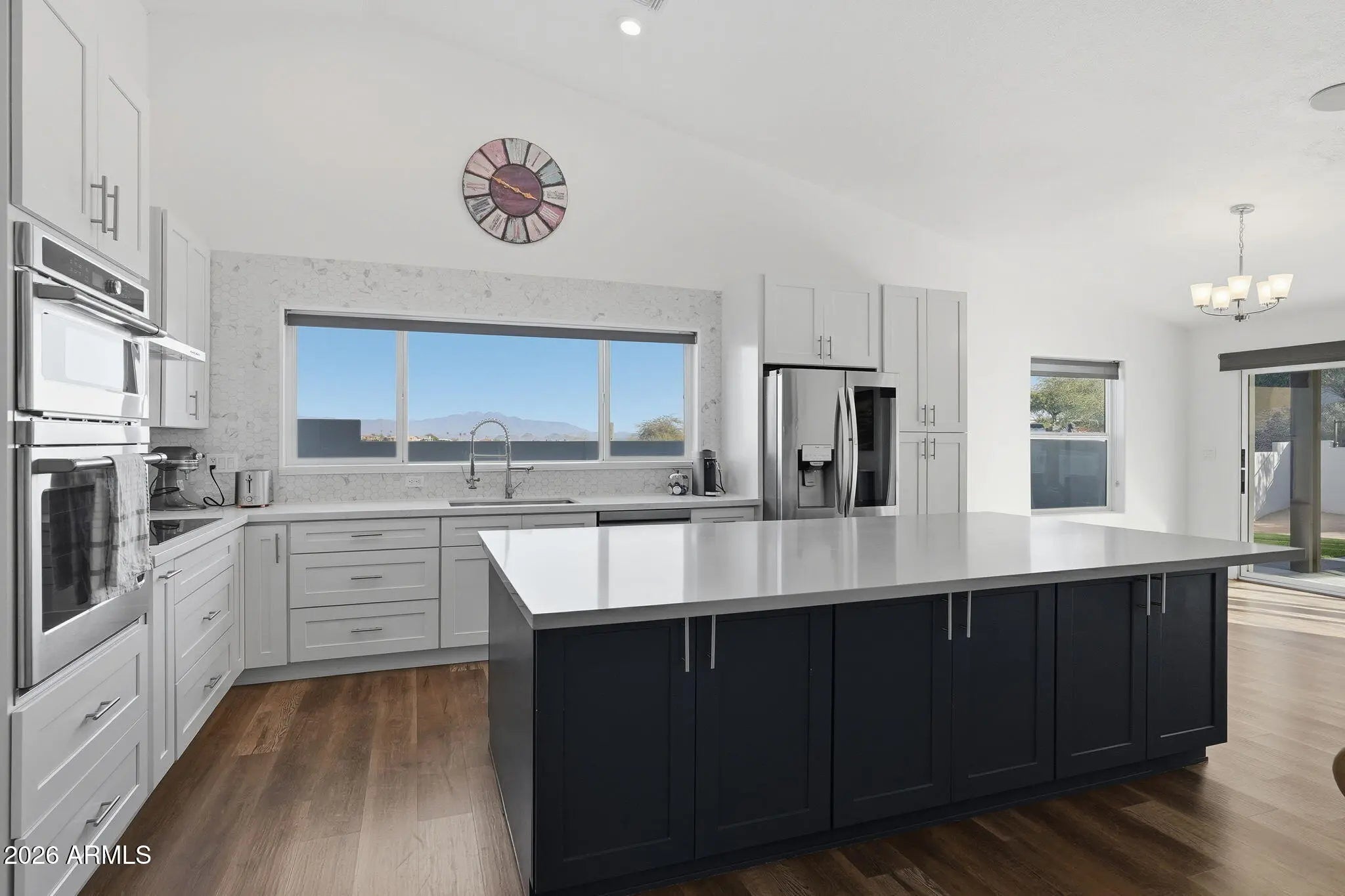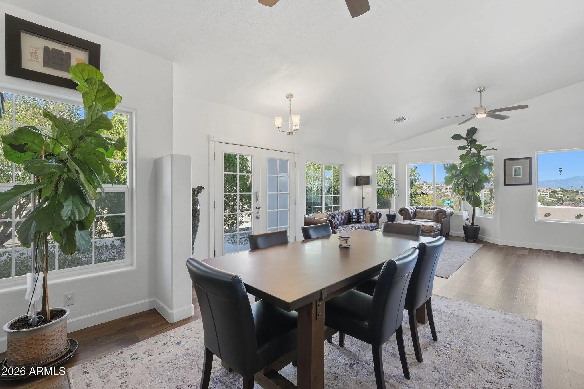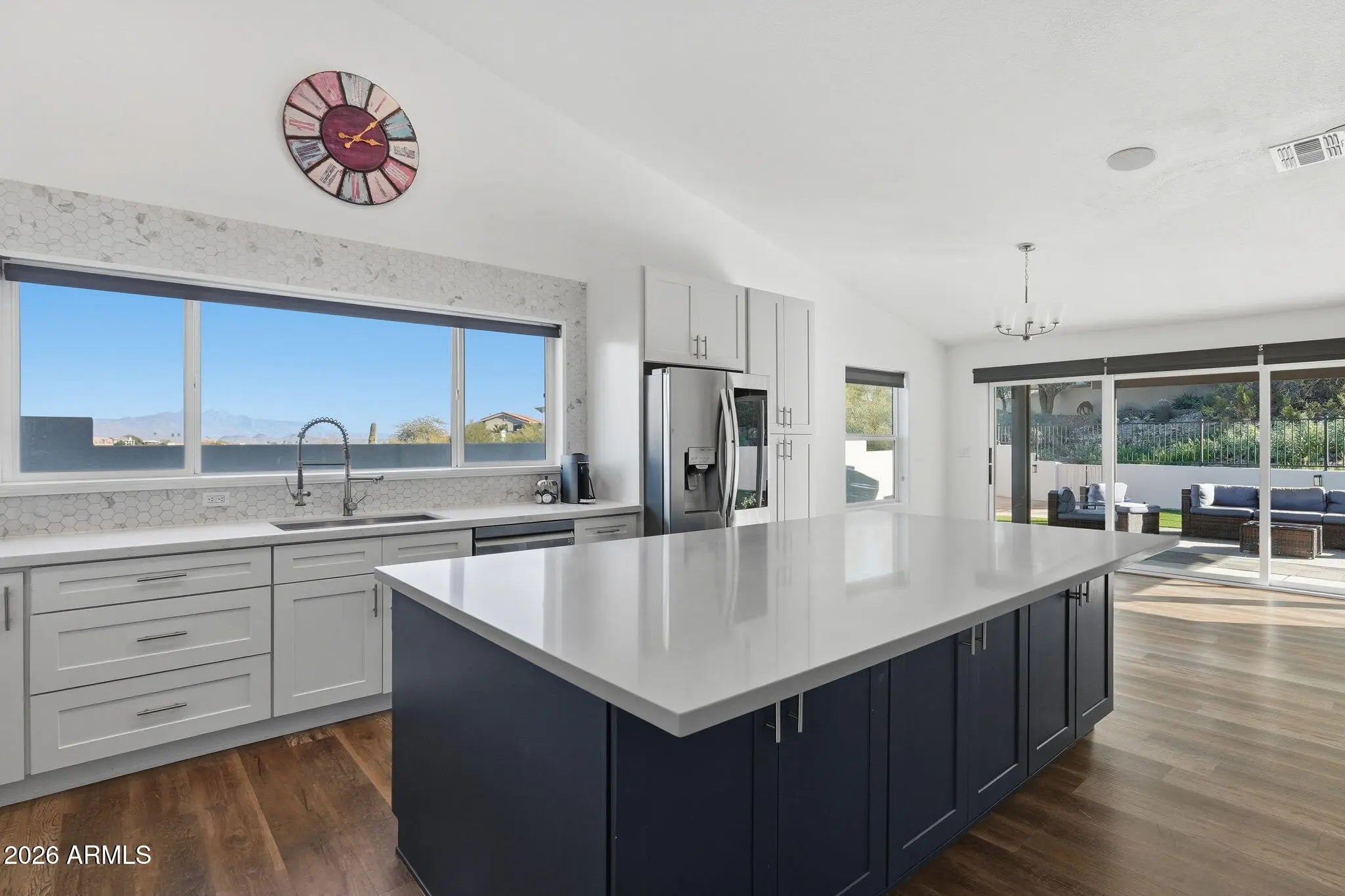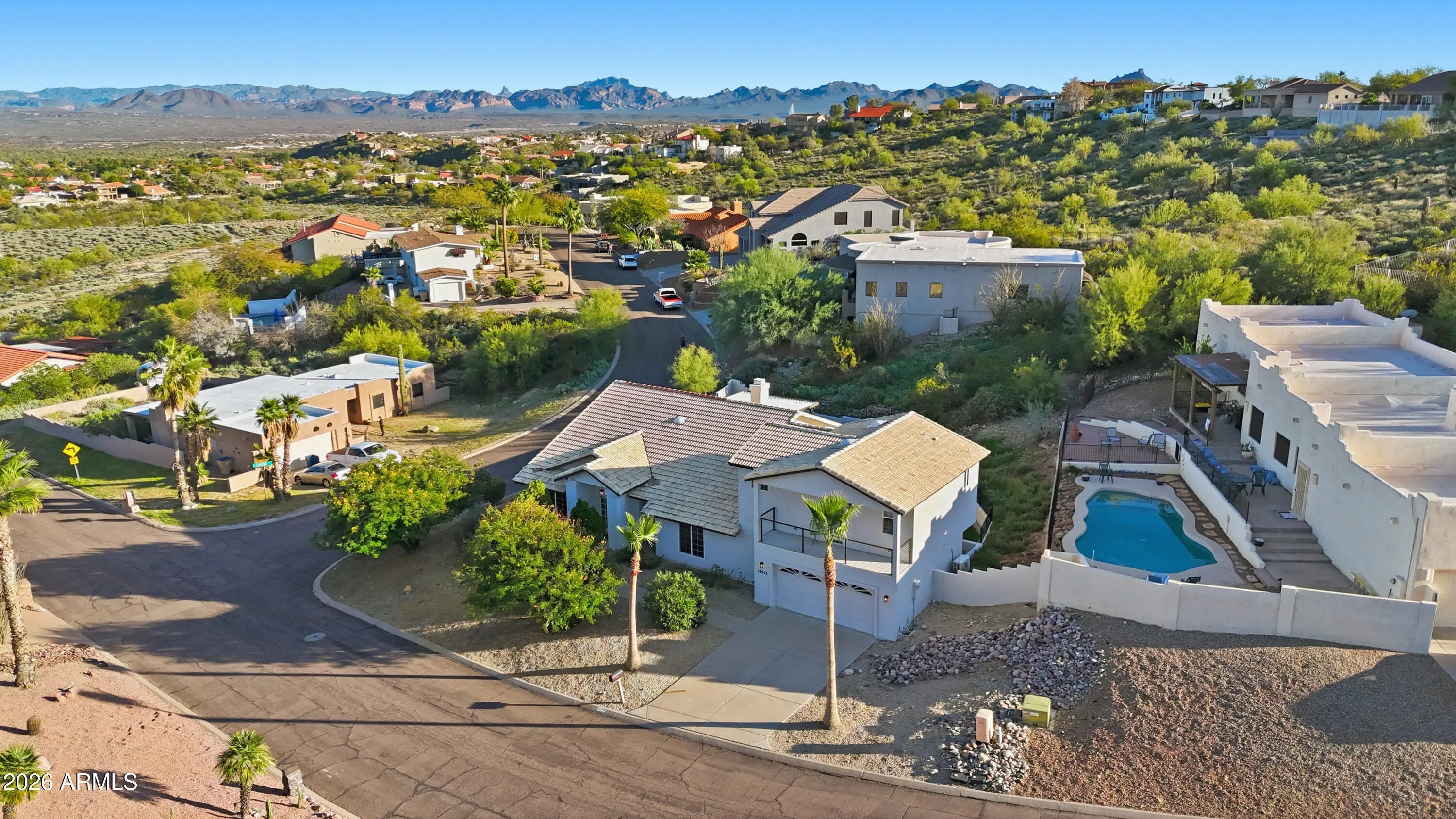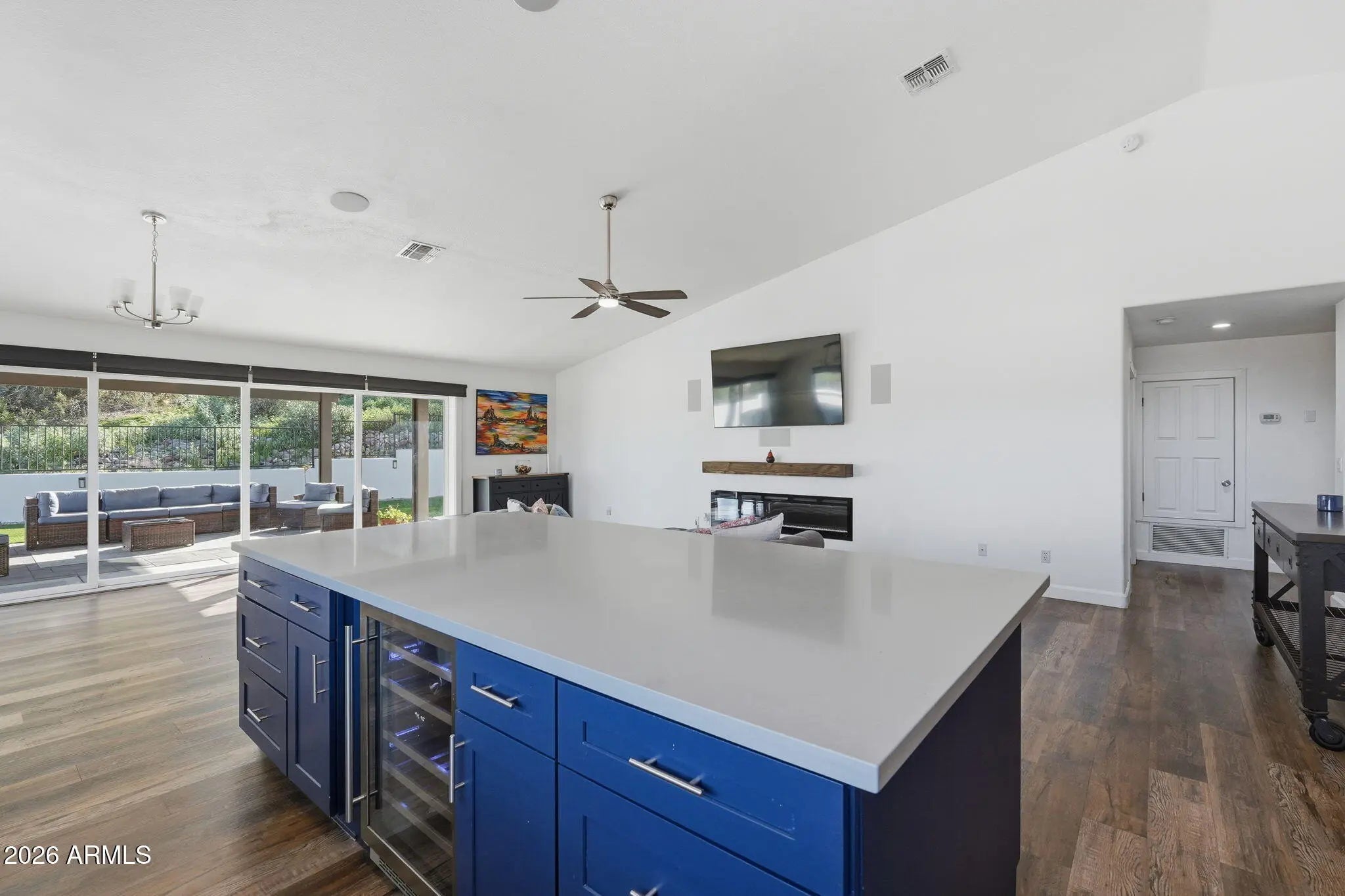 Breathtaking Four Peaks views take center stage in this fully renovated Fountain Hills home, thoughtfully updated in 2023, featuring a single-level main residence with an attached guest casita for added flexibility. At the heart of the home is a bright, open kitchen featuring an oversized island, modern cabinetry, and stylish finishes—perfectly positioned to enjoy the scenery while cooking, gathering, or entertaining. Designed for seamless indoor-outdoor living, floor-to-ceiling glass walls slide open to create a true resort-style experience, effortlessly connecting the contemporary chef's kitchen to the expansive, low-maintenance backyard, updated in 2025 with turf, pavers, a pergola, and fresh landscaping. The spacious layout offers two distinct living areas, dedicated dining space, and a sleek electric fireplace that adds warmth and modern appeal. The expansive primary suite completes the retreat with a generous bedroom and a beautifully updated bath. The attached casita completed in 2024offers ideal accommodations for guests or multi-generational living. Totaling 2,932 square feet (per appraiser), the property includes a 3-bedroom, 2-bath main home (2,360 sq ft) plus a 1-bedroom, 1-bath guest suite (572 sq ft) with kitchenette, separate entrance, and its own view patio.