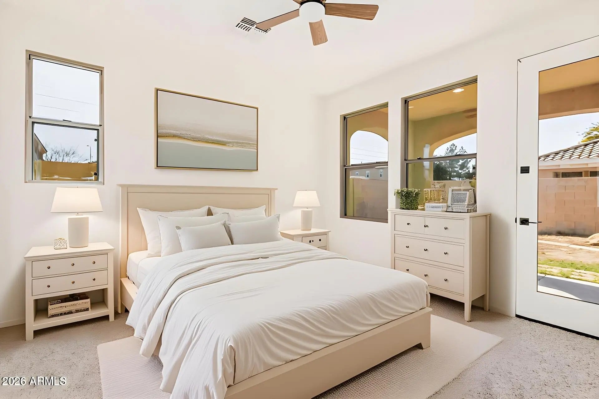 Welcome to this charming single-level home in Chandler Village! Nestled on a prime corner lot, it offers 3 beds, 2 baths, and a 2-car garage. The immaculate freshly painted interior showcases abundant natural light, a neutral palette, tile flooring in common areas, and new carpet in bedrooms. You'll love the large living room with surround-sound. The spotless kitchen boasts SS appliances, quartz counters, recessed lighting, and ample white cabinetry w/crown molding. Enter the main bedroom to find outdoor access and a private bathroom w/dual sinks. The backyard, with a covered patio, is the ideal spot to relax or enjoy BBQ! With your creative ideas, you can make it a complete outdoor living space.