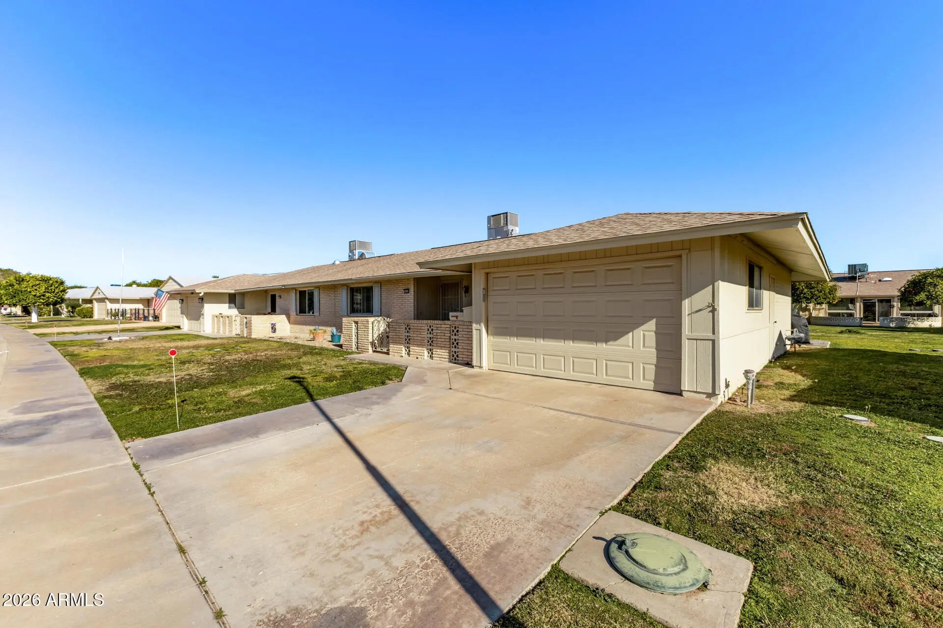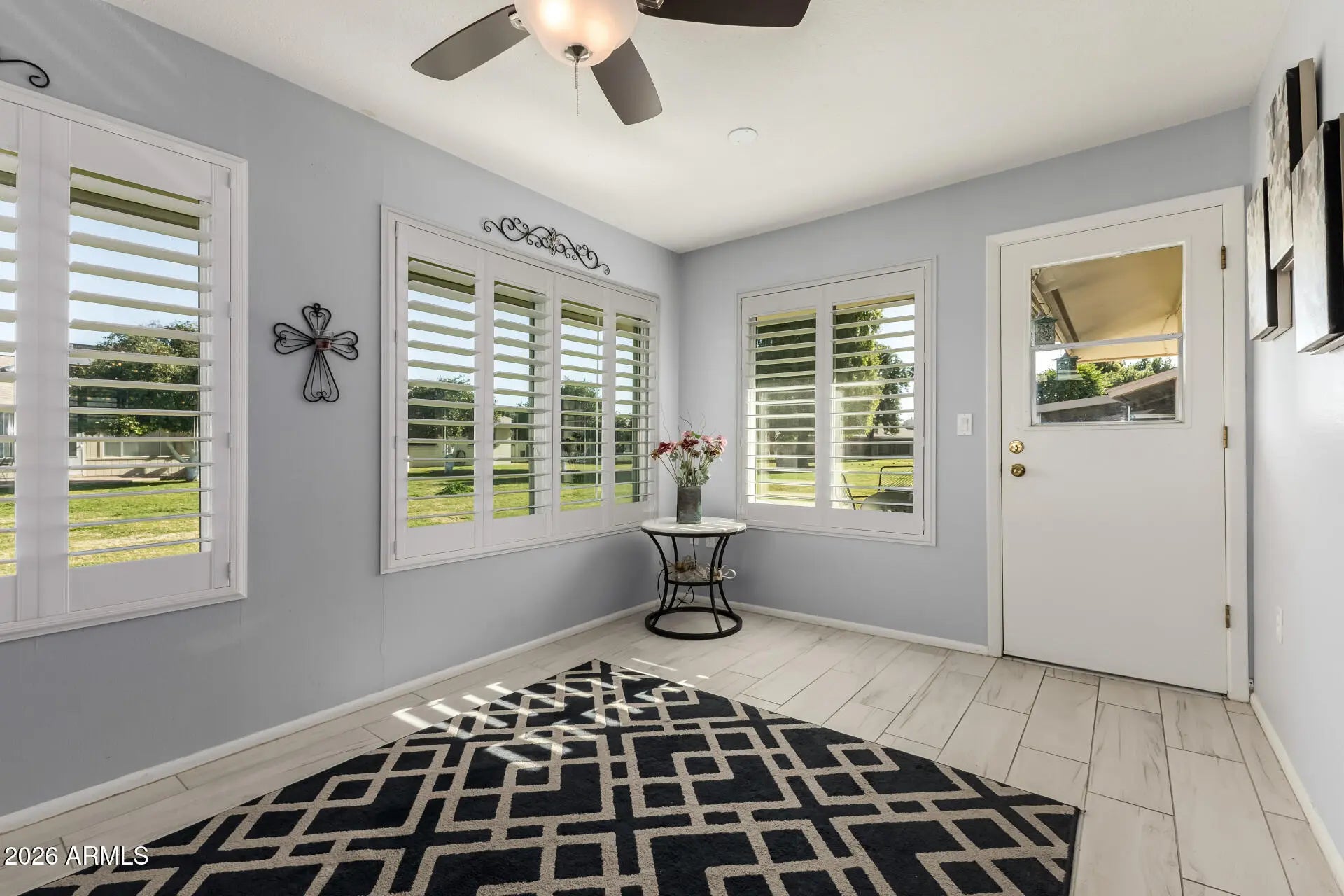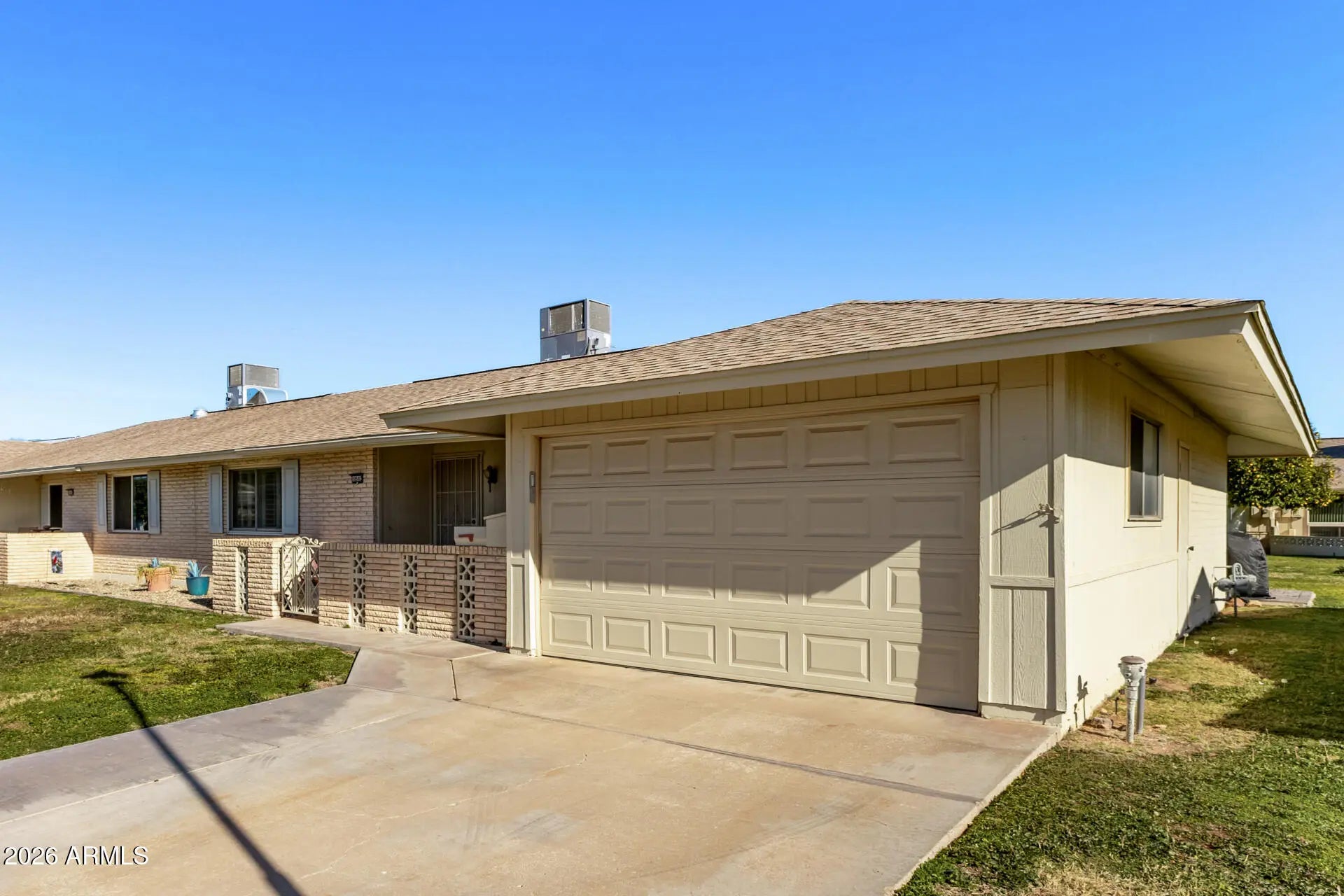 Beautifully Remodeled Sun City Gemini/Twin Home. This move-in ready 2-bedroom, 2-bath home blends modern upgrades with the easy, low-maintenance lifestyle Sun City is famous for. Enjoy Anderson windows, plantation shutters, fresh custom paint, smooth ceilings (no popcorn), and updated flooring throughout. The stunning kitchen features quartz countertops, a farmhouse sink, updated appliances, and convenient pull-out pantry shelving. Both bathrooms have been tastefully remodeled with elegant custom vanities. Major system upgrades include a new HVAC, tankless water heater, and electrical improvements, giving peace of mind along with style. A rare opportunity to own a highly upgraded home in one of Arizona's most sought-after active adult communities.