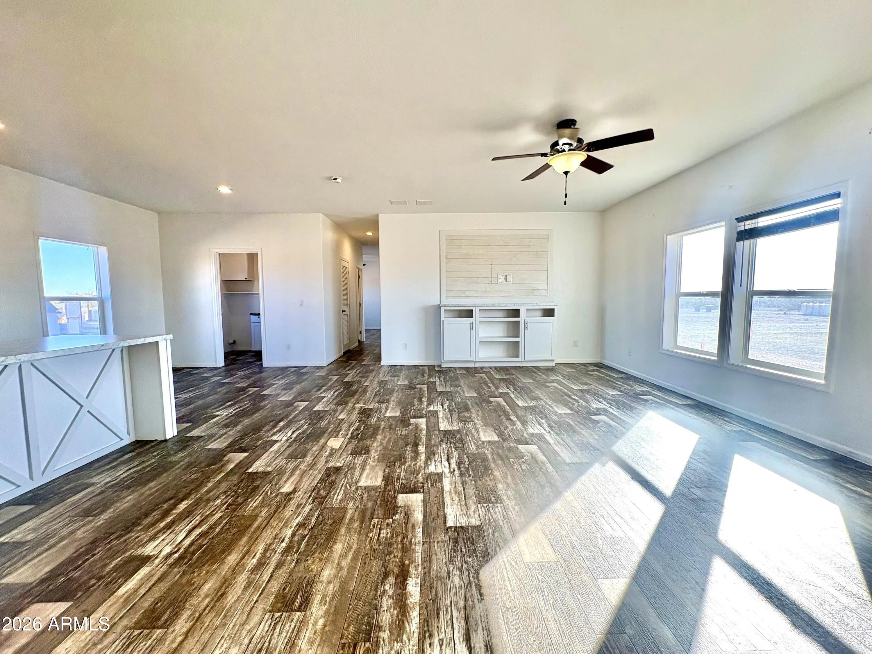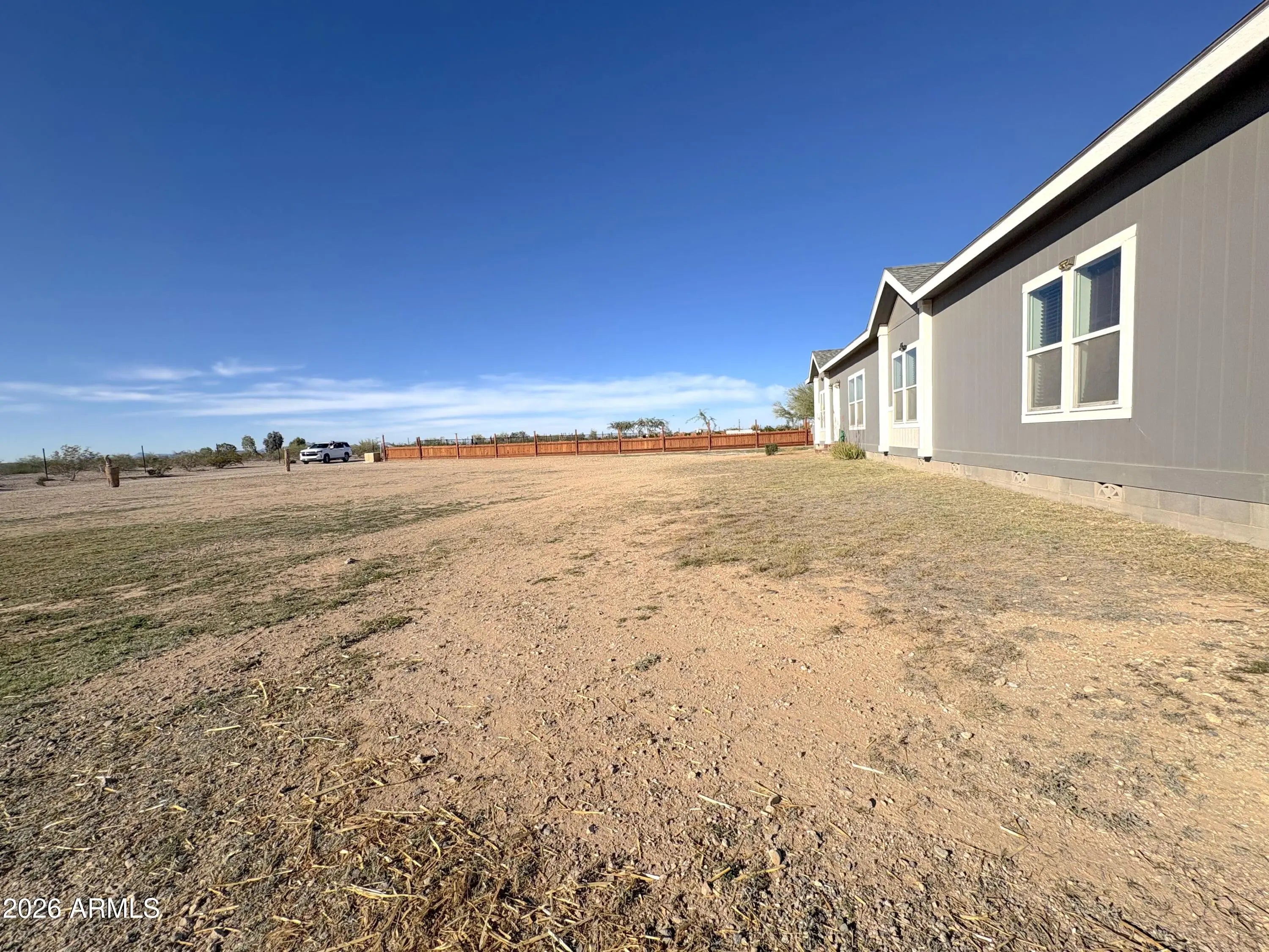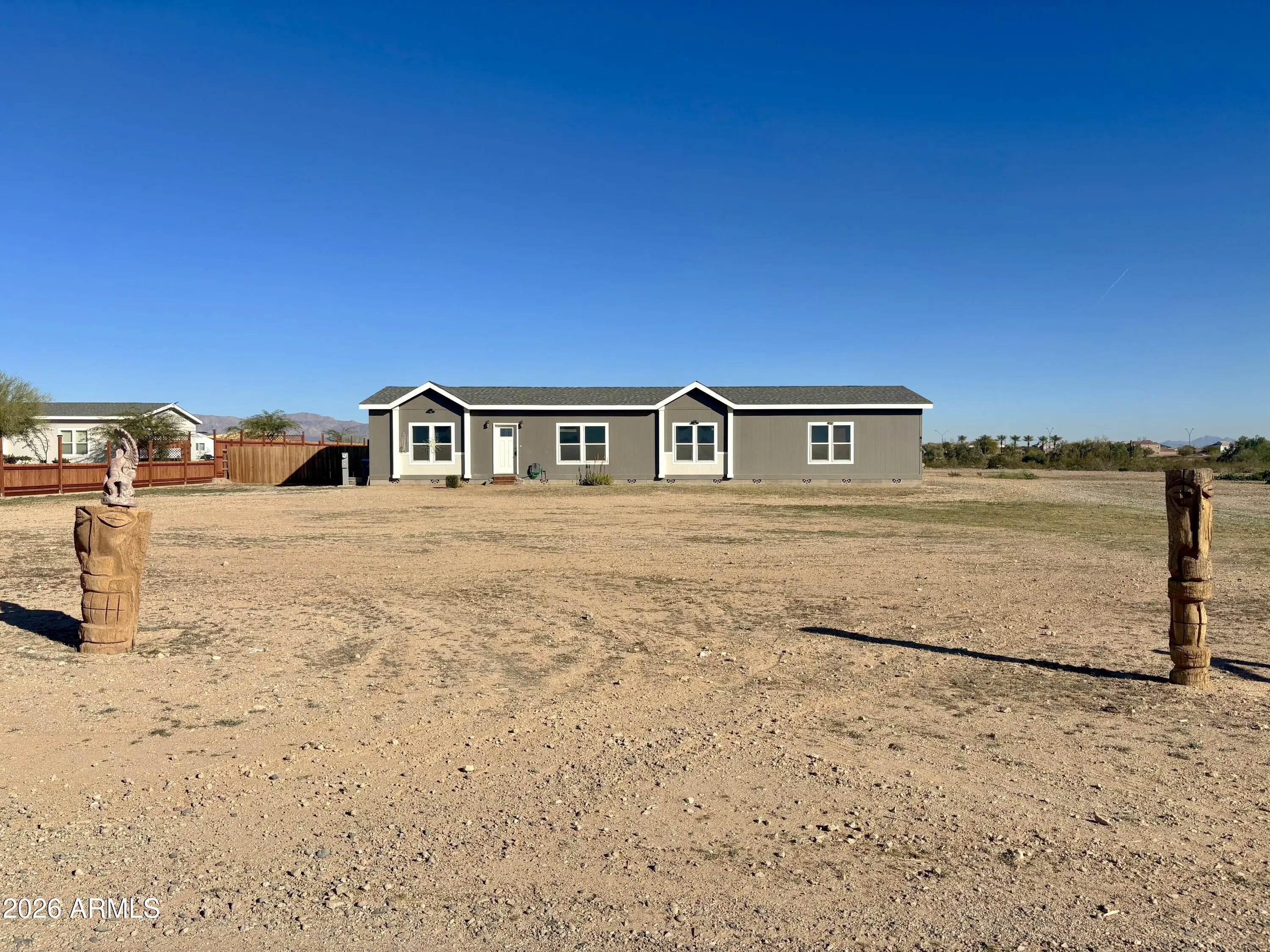 Move-in READY MODERN FARM HOME! Horse Property! NO HOA-Over an Acre lot! Bring your horses and toys. The property includes partial fencing and a chicken coop for your EGGS. The property has a 4-way shared well with low water bills. 2022 manufactured home- tile in walking areas, & carpeting in the rooms. Featuring A split master bedroom with a relaxing spa-like shower and bath. Large open Living room, eat in the kitchen that includes a refrigerator, beautiful subway backsplash tile, & a farm sink. A neutral paint palette, ready to add your decor & a laundry room complete with custom clothing storage. Next, if you work from home, there is a flex room or office space ready! Step outside to your relaxing acre+ BACKYARD surrounded by mountain views and the Gorgeous Arizona sunrise or sunsets
