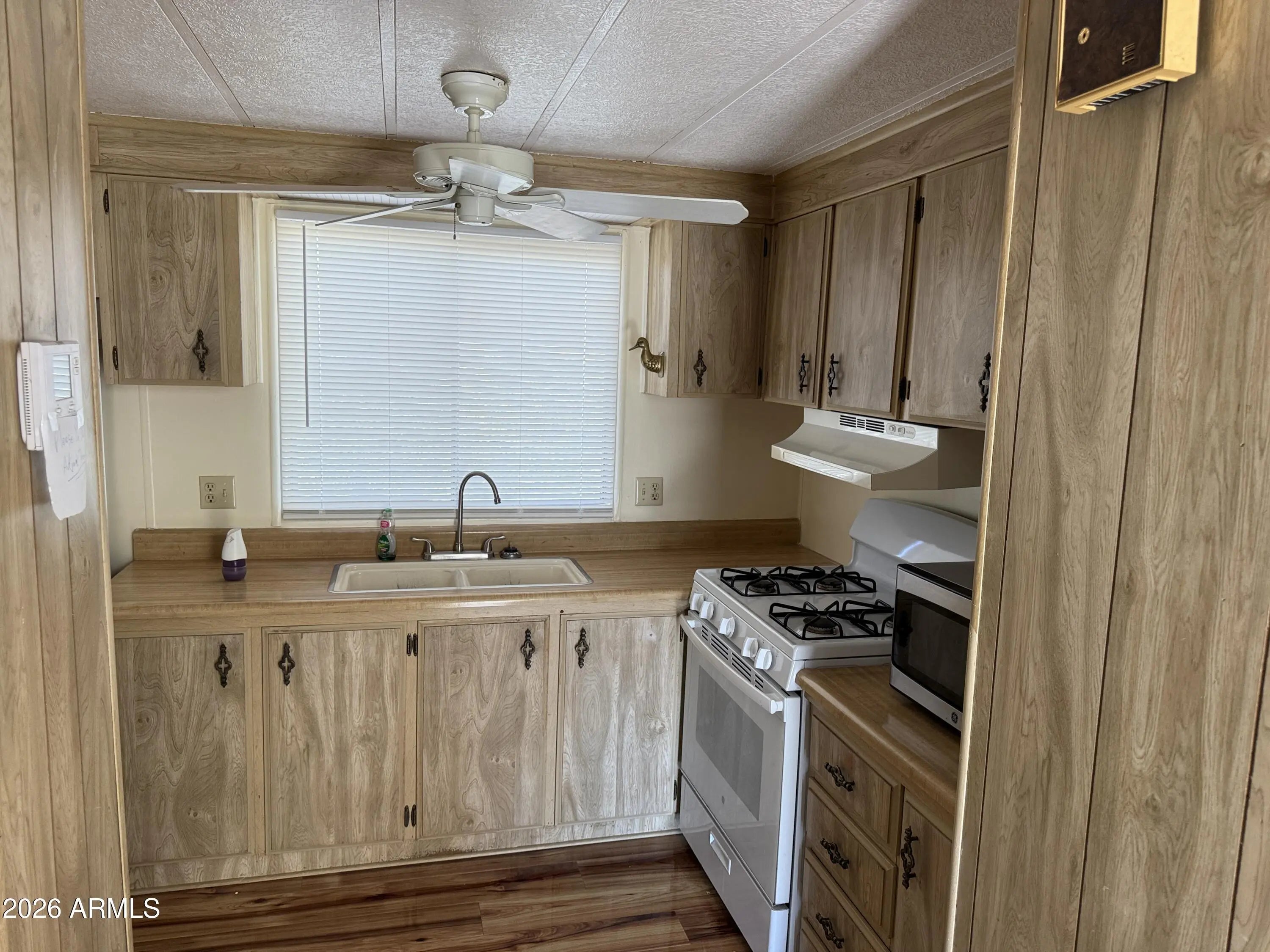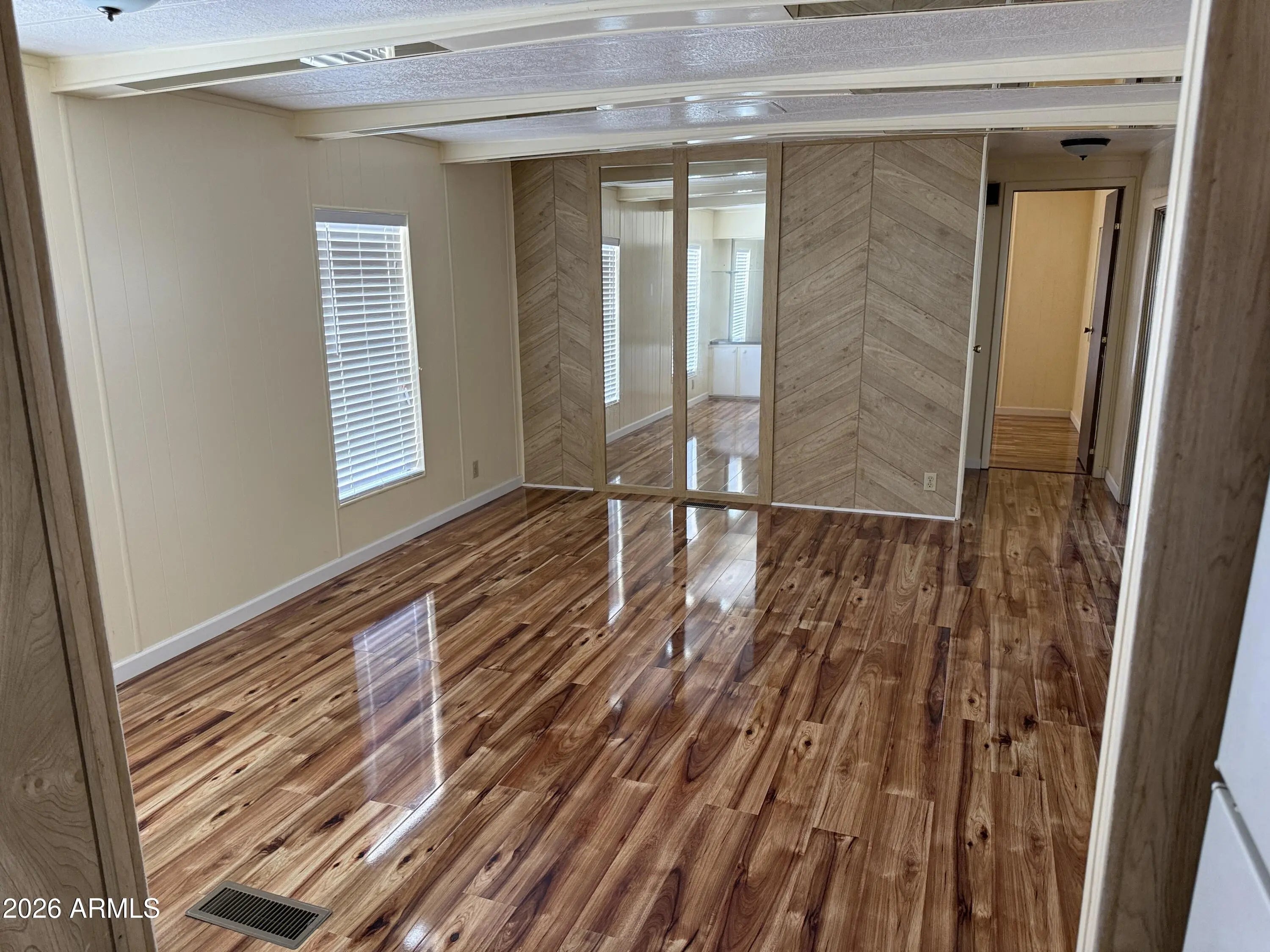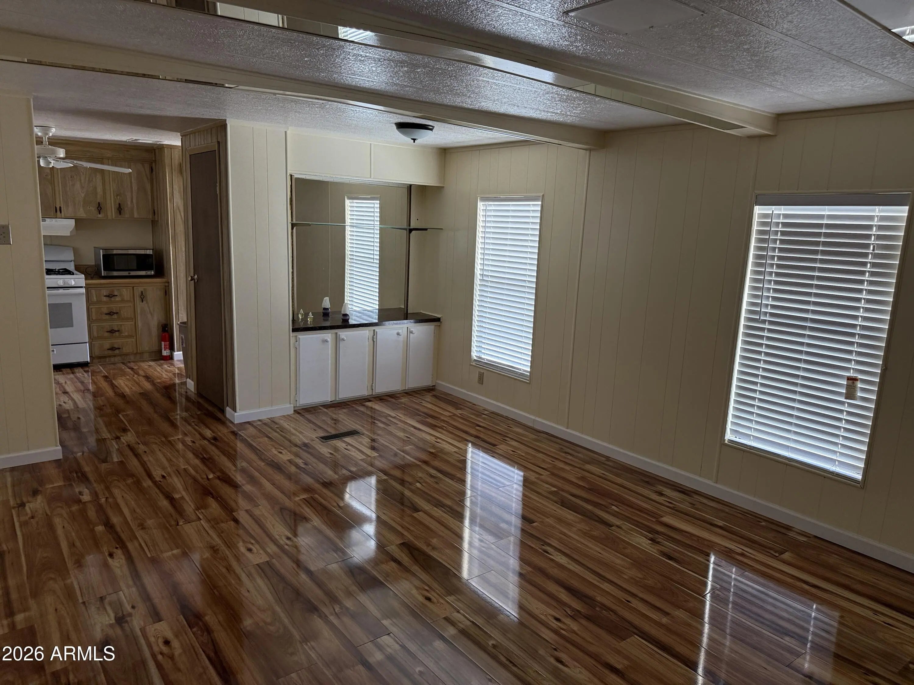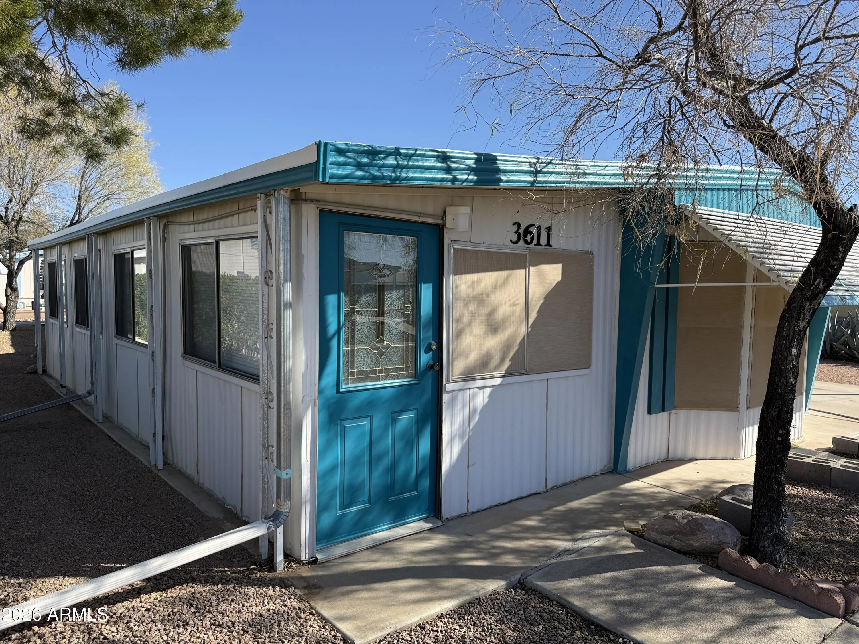 This is a 2 bedroom, 2 bath home that has an Arizona room, possibly as much as 300 sg ft of additional living space. (not added into the square footage) for nice area to entertain or hobby room. New wood laminate flooring in the living room,. New tile tub and shower in the primary bedroom. New carpeting in the Primary Bedroom. New Birchwood paneling in the primary bedroom. Both Bathrooms are fully remodel. Built in China hutch in living room. The Arizona Room has a new roof, as well as a large portion of the main house done in January 2026. This is a cute lot and a wonderful subdivision where you own the land, low HOA fees for lots of fun activities: golf, heated pools, spas, pickle ball courts, horseshoes, billiards hall, clubhouse with craft rooms, exercise area and Library.