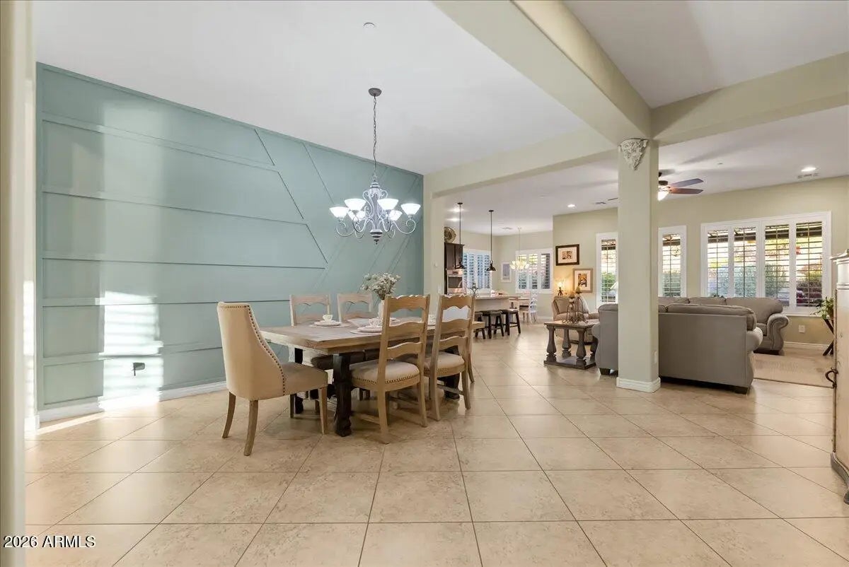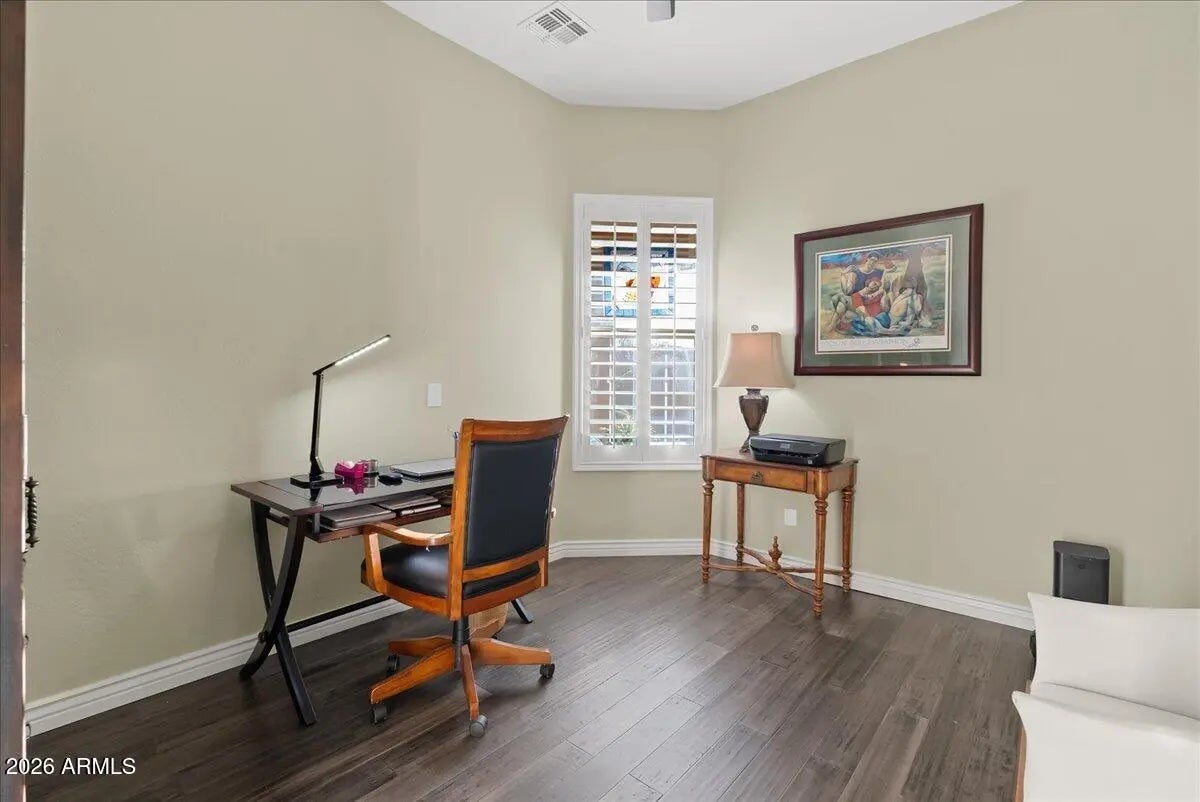 Single-level Adelaide model by Taylor Morrison featuring 4 bedrooms, 3 baths, plus a private den/office, offering 2,478 sq ft of living space and built in 2013. This home features a three-car garage, 10-foot ceilings, plantation shutters (2018), and a formal dining area with a custom accent wall. The kitchen includes granite countertops, gas cooktop, multiple ovens, dishwasher (2020), microwave (2023), and gas plumbing in place for an outdoor barbecue or fire pit. Wood flooring enhances the office, and custom cabinetry is featured in the laundry room. The primary suite offers a walk-in shower with a dedicated dry-off area. Bedrooms 2 and 3 include walk-in closets, and a modular closet system is installed. Recent system updates include HVAC replacement in 2025, water heater (2021), ...water heater (2021), water softener (2021), and updated irrigation. The backyard showcases synthetic turf, retaining wall, travertine paver patio with arbor, and professionally selected landscaping by Moon Valley Nursery. Artificial turf and low-maintenance design complete the outdoor space. Home includes a one-year home warranty.