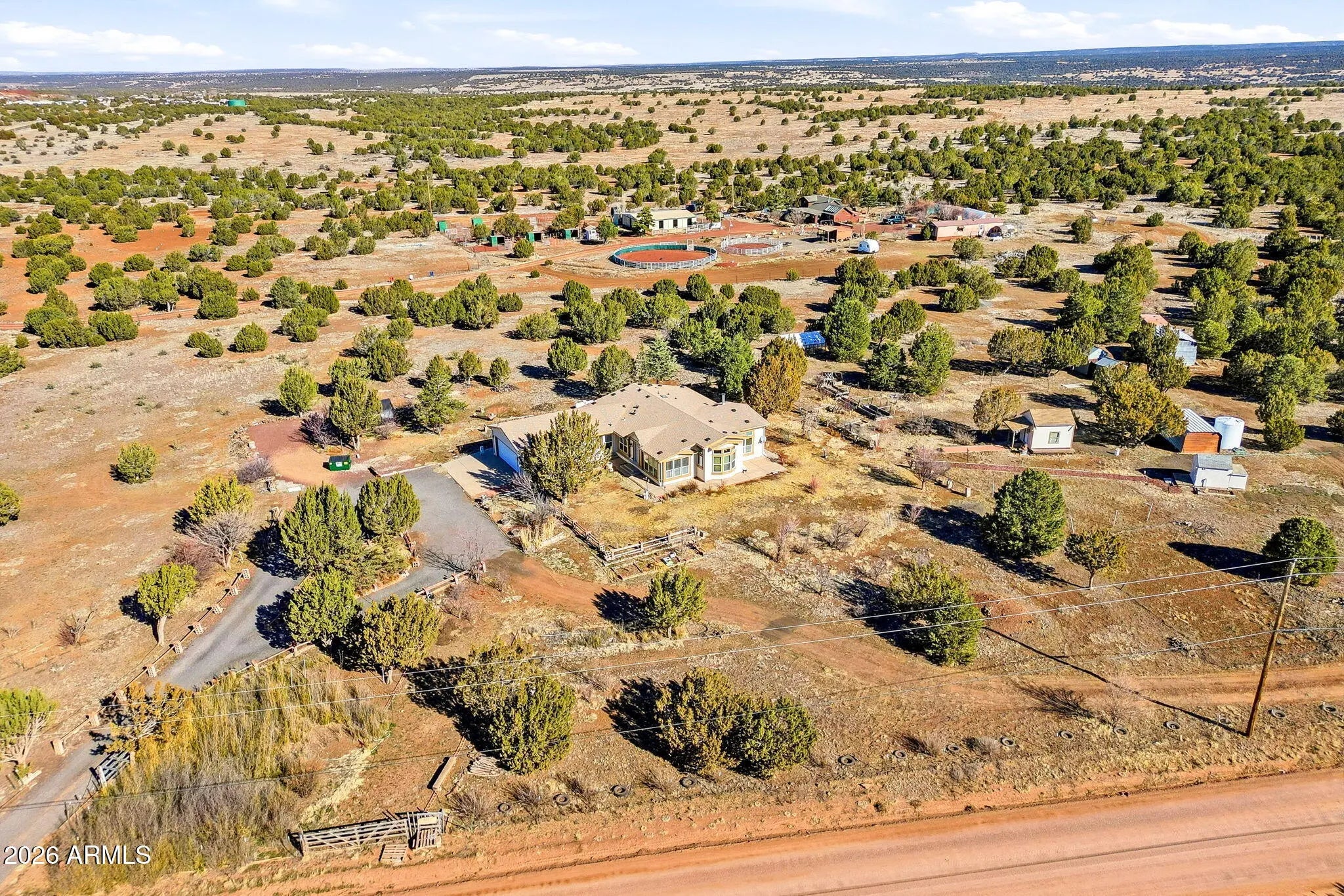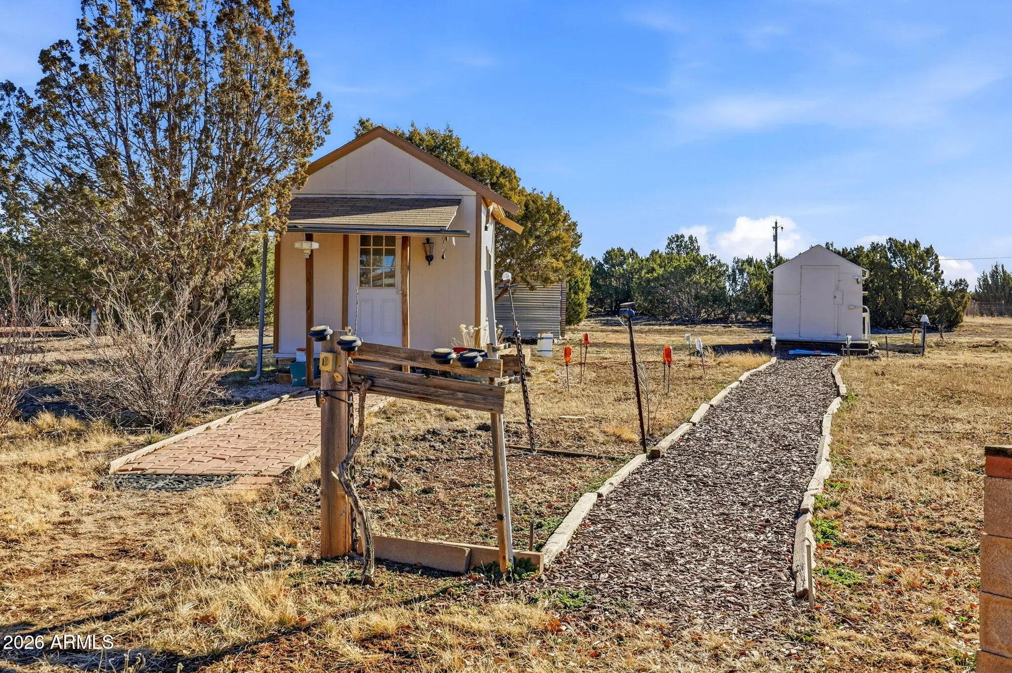 Come explore this spacious 3 bed, 2 bath, Silvercrest triple-wide, where 2,310 sq. ft. of comfortable living meets a wealth of outdoor possibilities. Featuring dual living areas, engineered wood flooring, a formal dining room, and a breakfast nook, the home's layout is designed for both relaxation and functionality. A soapstone woodstove offers efficient, cozy warmth. The enclosed Arizona Room provides a protected connection between the home and the 2-car garage. The exterior is a gardener's retreat, featuring established fruit trees, bamboo, flower plants, rose bushes, along with native trees. Extensive outbuildings include a detached studio (formerly an art room), a dedicated well house, storage buildings, canopy shelters, and two Conex units. Set up for self-sufficient living this property features a private well, a second power pole at the east end, and a secondary, unused septic system also on the east end of the property. These amenities offer significant infrastructure for future projects (buyer to verify all zoning/permit requirements). Fruit trees include apple, apricot, jujube, cherry and asian pear. Located next to a paved road with easy access to shopping, dining, medical, and local lakes/hiking.