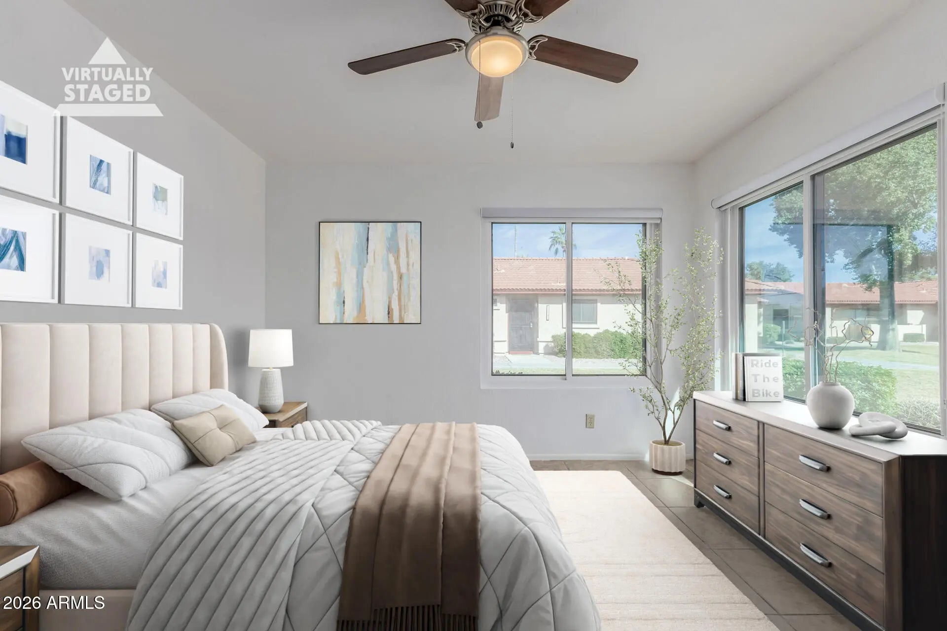 Welcome to Campo Bello Gardens! This beautifully updated single-level 2 bedroom, 2 bath condo is located in a gorgeous community near Bell Rd & 16th St. and offers easy, low-maintenance living in one of North Phoenix's most convenient locations. Inside this 848 sq ft home, you're greeted by a spacious great room filled with natural light and finished with neutral tile flooring throughout — no carpet anywhere. All popcorn ceilings have been removed, and the home features brand-new windows with custom window treatments, & new slider,creating a fresh, modern feel. The primary bathroom has been recently custom renovated, showcasing a beautifully tiled walk-in shower with niche shelving, new vanity, mirror, and toilet. The primary bedroom also features a custom closet system with shelving, drawers, and double hanging rods for excellent organization. 2nd bedroom offers lots of space for home office or guest bedroom and large double door closet. The kitchen offers neutral brown cabinetry, laminate countertops, and all stainless-steel appliances replaced within the last two years, including refrigerator, dishwasher, electric range/oven, and hood. An eat-in kitchen area adds charm and functionality. A hallway linen closet sits across from the full-size LG stackable washer and dryer, adding everyday convenience. Step outside to a private, block-fenced patio with a locked gate perfect for enjoying Arizona's cooler seasons with coffee, tea, patio furniture, or container gardening. The storage room off the patio provides ample space and houses the newer hot water heater. This unit includes one covered parking space plus one slab parking space. The community features attractive sand-colored stucco, red tile roofs, and a sparkling pool. =Í Prime Location: Close to elementary, middle, and high schools, plus abundant shopping, dining, gas stations, medical offices, and major hospitals including St. Joseph's, Mayo Clinic, Abrazo, and Banner. Convenient access to SR-51 and Loop 101, with an easy 15-minute drive to Downtown Phoenix or northeast to Desert Ridge, JW Marriott Resort, golf, and entertainment. =° Low property taxes at approximately $448/year. The seller has loved living here for over three years, but is relocating to the East Valley. Motivated seller bring your offer today!