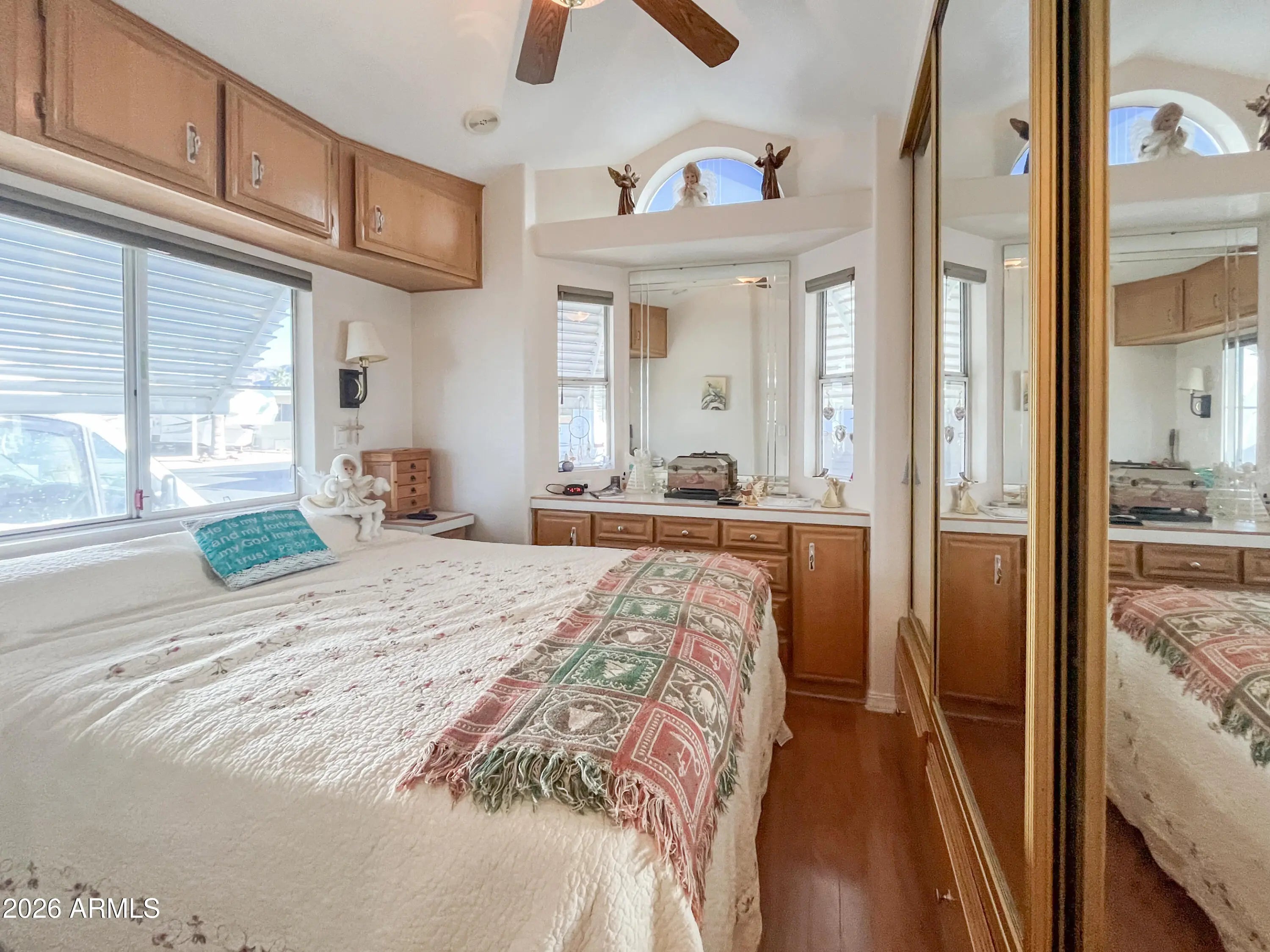 Welcome to this stunning home in the highly desirable Golden Vista Resort offering quality upgrades, privacy, mountain views, in a very active resort. As you step inside you will notice the high ceilings, abundant natural light from numerous windows, tape & textured drywall throughout, & real hardwood flooring complemented by upgraded window coverings. The updated kitchen features Corian countertops, stainless steel appliances, real wood cabinetry, & a reverse osmosis system creating a functional & inviting space. The bathroom offers a walk-in shower, while the spacious bedroom includes a queen-sized bed, built-in dresser storage, & large mirrored closet doors providing excellent storage & room to move. Major updates include a roof approximately 6 years old & an air conditioning system approximately 7 years old. Outside, the expansive Trex deck provides generous outdoor seating, perfect for enjoying your morning coffee while taking in beautiful Superstition Mountain views. The raised additional storage or office/laundry room is fully finished with a full-size washer & dryer & ample extra storage space. This home backs to the exterior of the community, meaning no immediate neighbors behind you for added privacy. Golden Vista offers a vibrant lifestyle with activities available every day including pickleball, tennis, hiking, softball, sewing rooms with long-arm quilting, stained glass, pottery, & endless opportunities to enjoy.
