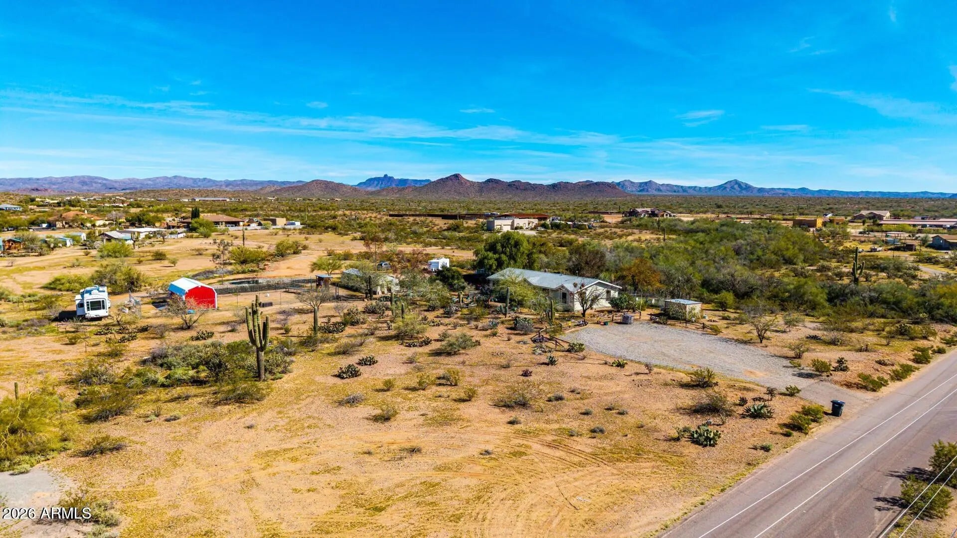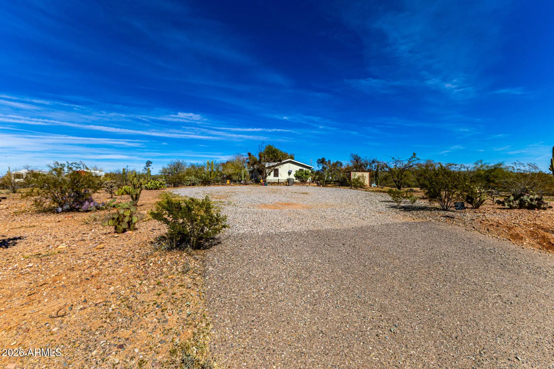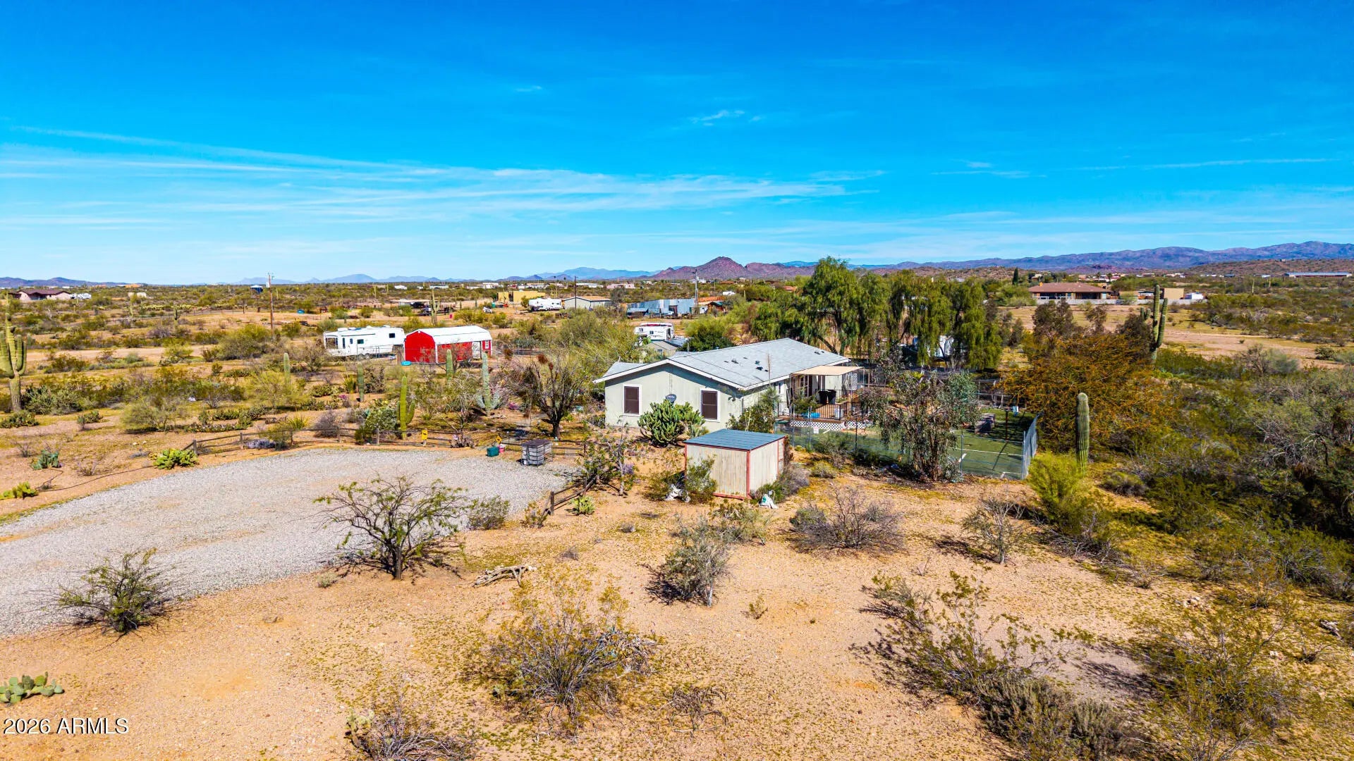 Abundant potential awaits on this expansive 5.6-acre property! The 700 sq ft, heated & cooled greenhouse, is perfect for growing your own food 365 days a year. With a little cosmetic TLC, this charming residence is waiting for you to make it your own. Three generously sized bedrooms, including a split and secluded master suite featuring ''Jack and Jill'' bathrooms, provide ample living space. The kitchen boasts extensive storage, loads of counter space and a large island. Energy-efficiency updates include a newer (March 2025) 5 ton HVAC unit, water heater, and solar screens on all windows. The property is on a shared well with a neighboring parcel (75% ownership). Enjoy instant passive income from the 3 currently rented RV spots that have water access & electric hookup and are sub-metered for electricity. Unwind on the covered deck and take in the breathtaking desert vistas and stunning sunrises. Bring your horses, there is plenty of room for stalls and an arena! Add on to all of the above, there is extensive irrigation as this property was a former wholesale nursery. This residence is a true gem in the desert! With its rural setting and proximity to retail and entertainment options, this property is perfect for those seeking a peaceful lifestyle with convenient access to amenities. Asante Trails, a planned retail development off 163rd & Grand, will feature various shops and services. Wickenburg, located just a short drive west, offers shopping, entertainment, and dining options. * Located within one mile of US Hwy 60 and US Hwy 74* * APS Electric with many plans to save $ on electric* * 40' x 90' fenced area with chain link, snake fencing and barbed wire with a 14' x 34' "shed with shelves and two lofts" inside the fenced area. Already has electricity* * One tough shed and one additional storage shed* * Abundant parking in front and back of property)*