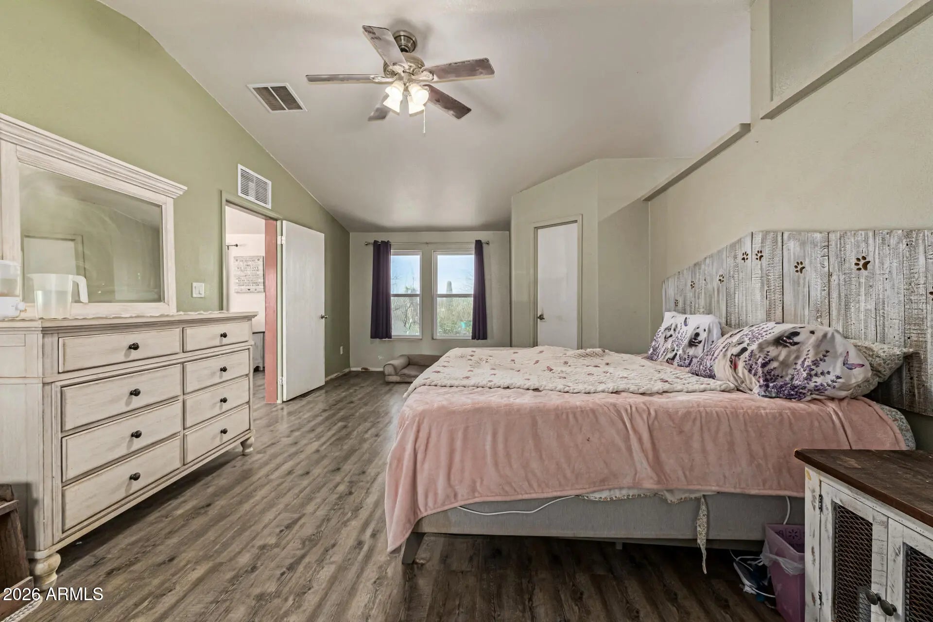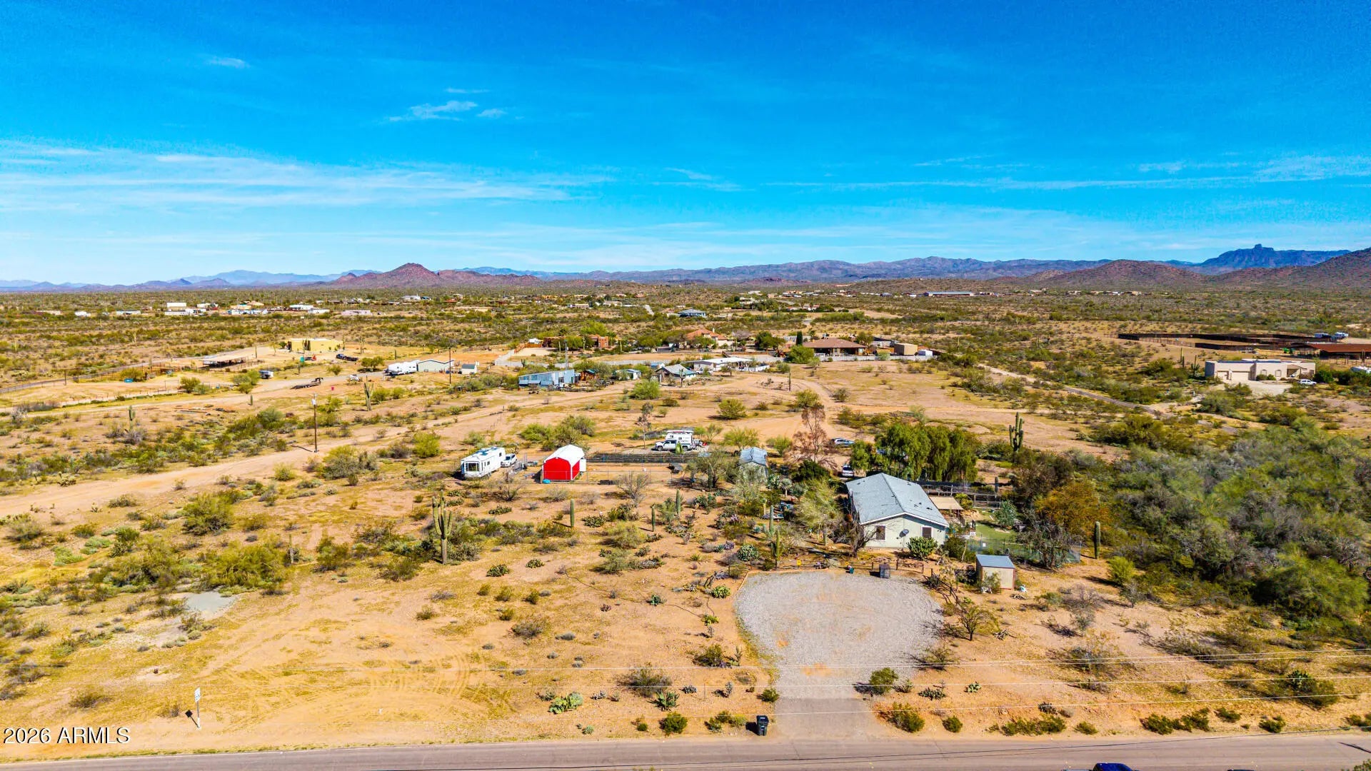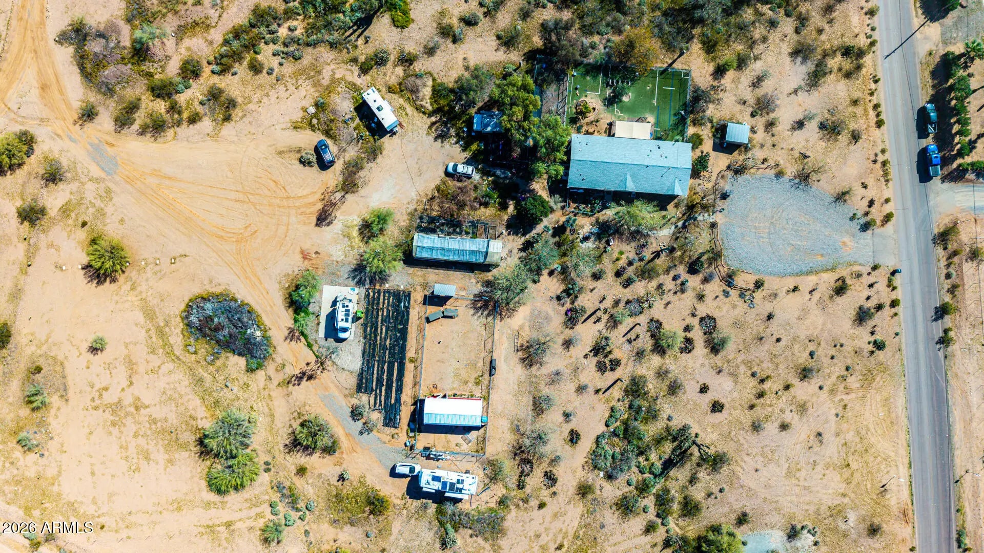 Abundant potential awaits on this expansive 5.6-acre property! The 700 sq ft, heated & cooled greenhouse, is perfect for growing your own food 365 days a year. With a little cosmetic TLC, this charming residence is waiting for you to make it your own. Three generously sized bedrooms, including a split and secluded master suite featuring ''Jack and Jill'' bathrooms, provide ample living space. The kitchen boasts extensive storage, loads of counter space and a large island. Energy-efficiency updates include a newer (March 2025) 5 ton HVAC unit, water heater, and solar screens on all windows. The property is on a shared well with a neighboring parcel (75% ownership). Enjoy instant passive income from the 3 currently rented RV spots that have water access & electric hookup and are sub-metered for electricity. Unwind on the covered deck and take in the breathtaking desert vistas and stunning sunrises. Bring your horses, there is plenty of room for stalls and an arena! Add on to all of the above, there is extensive irrigation as this property was a former wholesale nursery. This residence is a true gem in the desert! With its rural setting and proximity to retail and entertainment options, this property is perfect for those seeking a peaceful lifestyle with convenient access to amenities. Asante Trails, a planned retail development off 163rd & Grand, will feature various shops and services. Wickenburg, located just a short drive west, offers shopping, entertainment, and dining options. * Located within one mile of US Hwy 60 and US Hwy 74* * APS Electric with many plans to save $ on electric* * 40' x 90' fenced area with chain link, snake fencing and barbed wire with a 14' x 34' "shed with shelves and two lofts" inside the fenced area. Already has electricity* * One tough shed and one additional storage shed* * Abundant parking in front and back of property)*