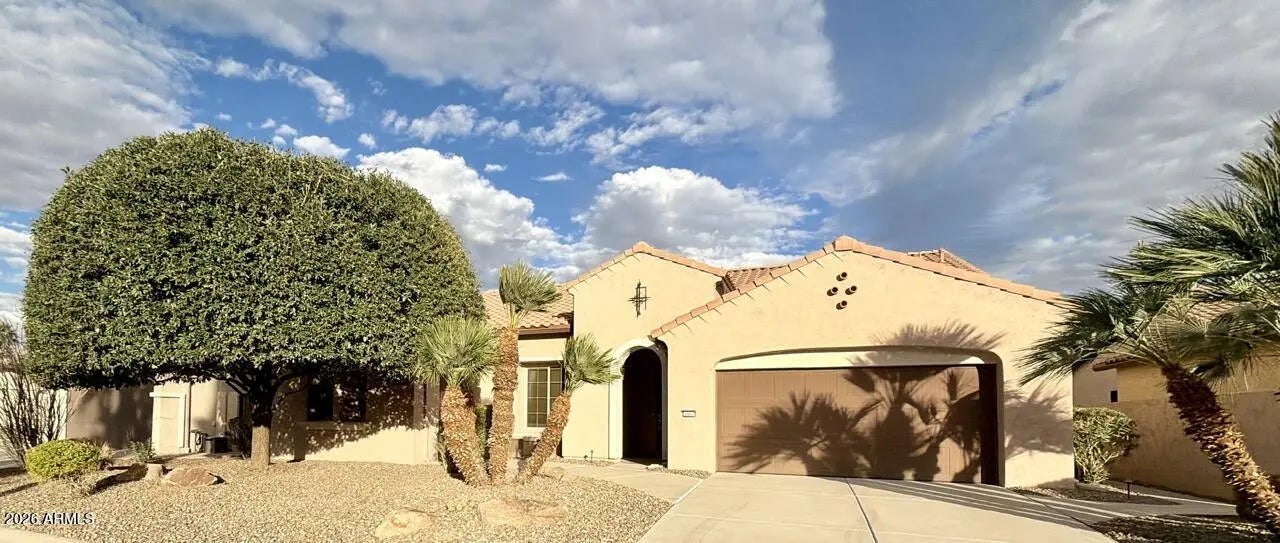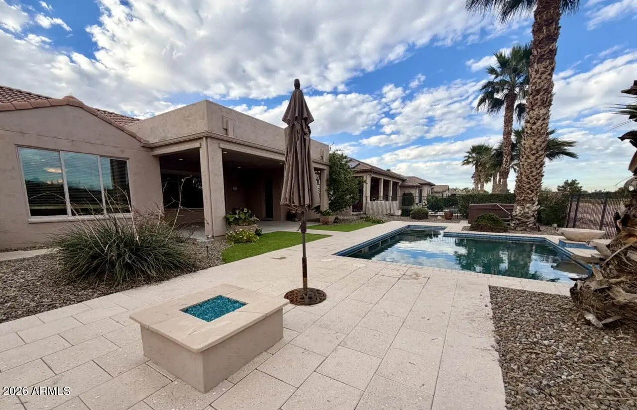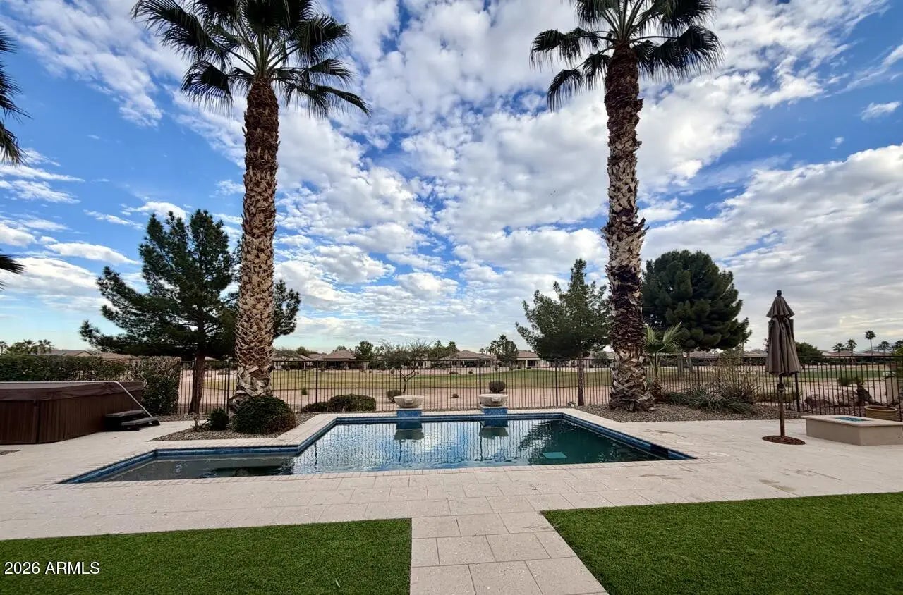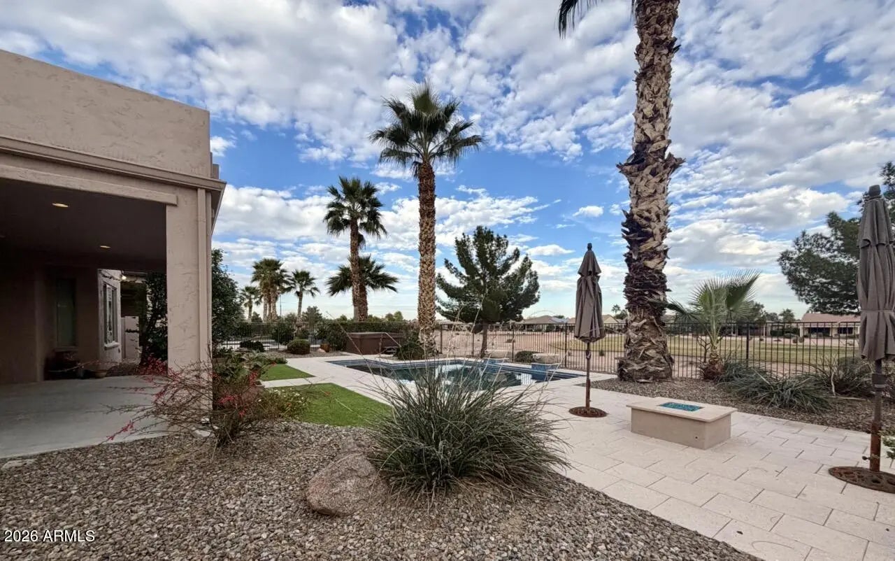 Held within the prestigious, age-restricted Robson community of PebbleCreek, this exceptional 2-bedroom, 2.5-bath residence with a private study offers elevated resort living at its finest. The primary suite is a true retreat, featuring a fully remodeled, spa-inspired bath with artfully crafted tilework, walk-in shower with bench, dual vanities, and granite countertops. The secondary bedroom functions as a private junior suite with a full bath showcasing upgraded tile surrounds and a soaking tub. Upgraded plank-style flooring flows throughout the home. Perfectly positioned on the golf course, the backyard rivals a luxury resort with a pool and hot tub, gas fire pit, and built-in BBQ. World-class PebbleCreek amenities and a 2-car garage plus golf cart garage complete refined AZ retreat.