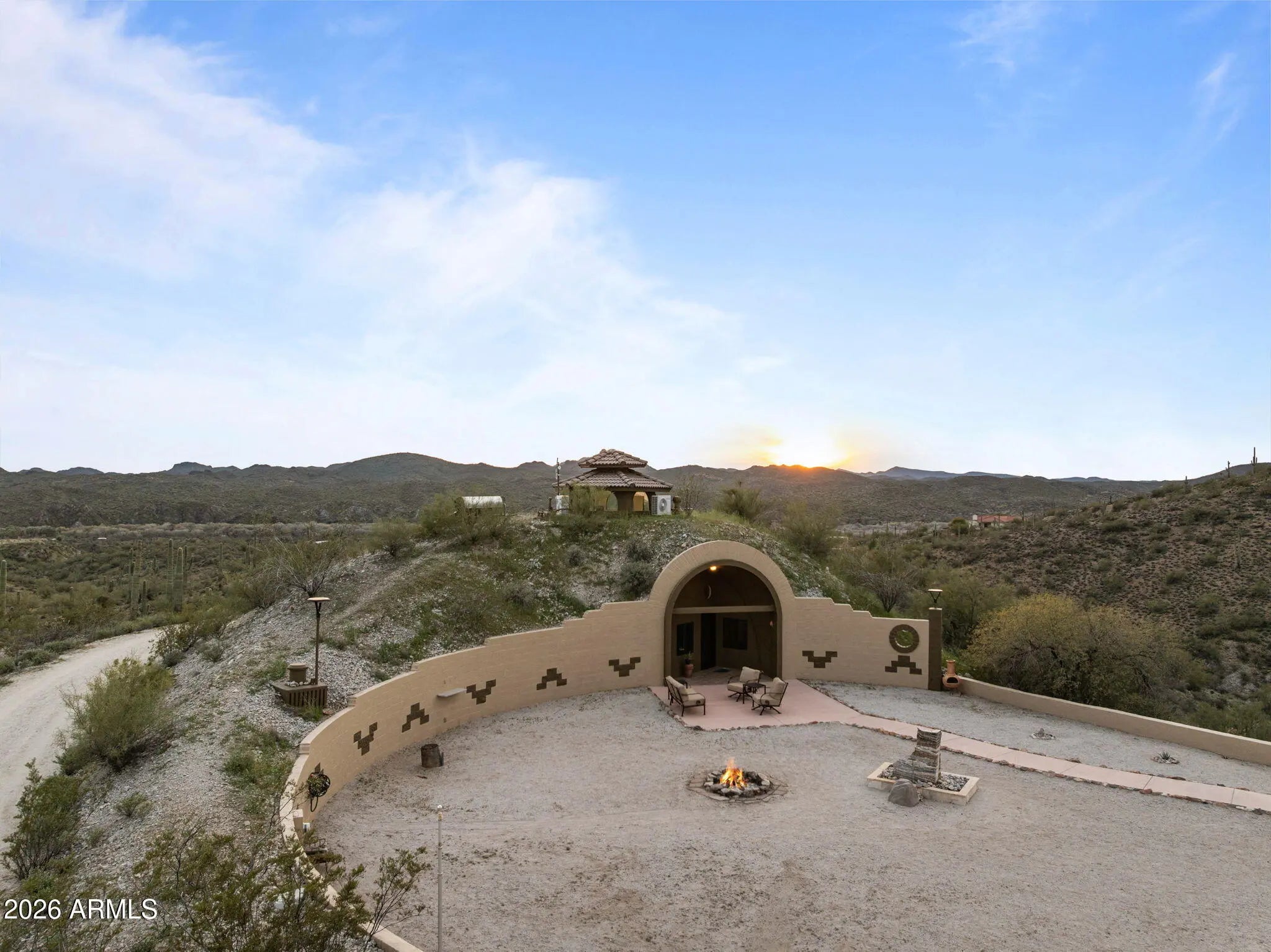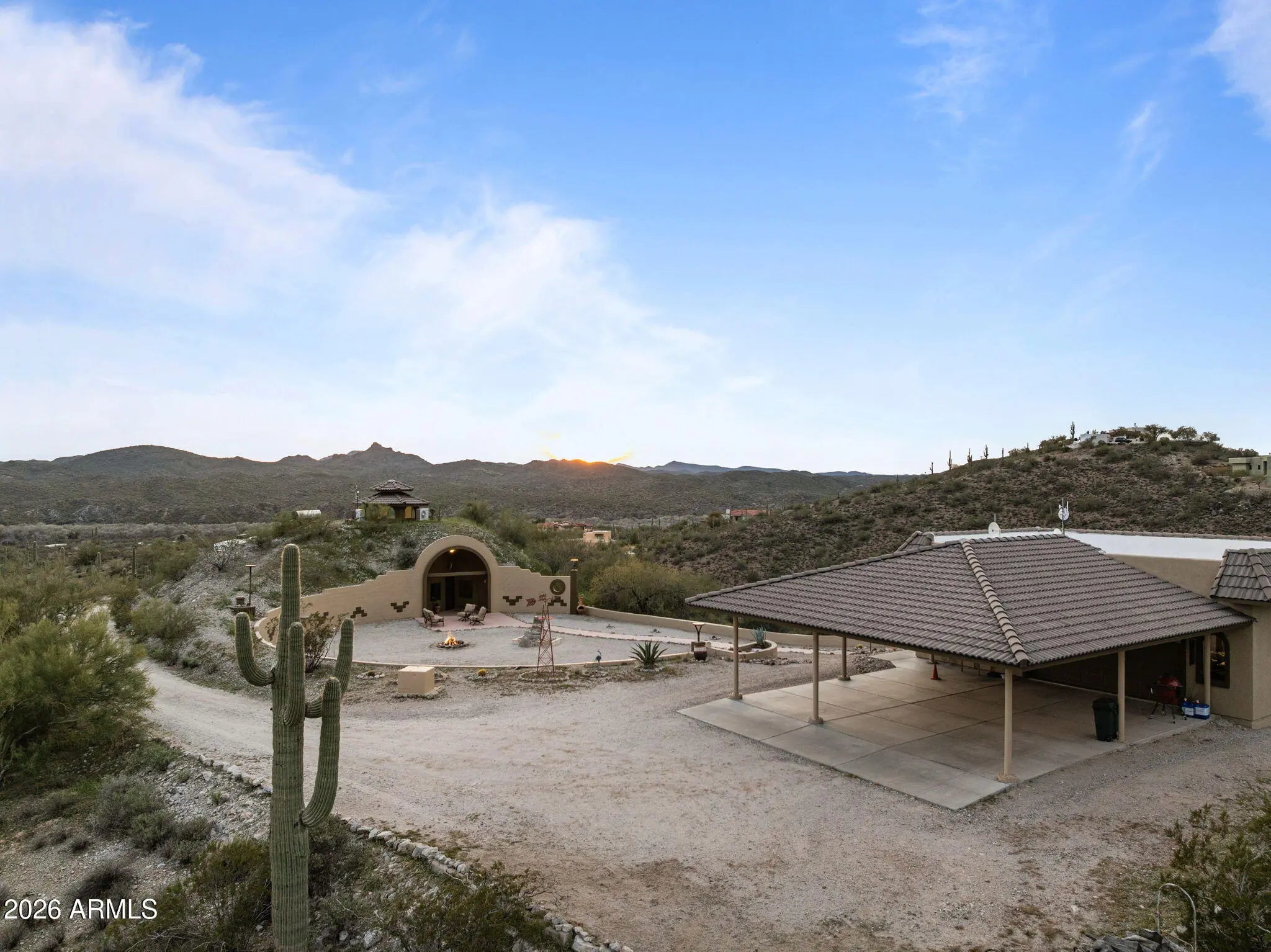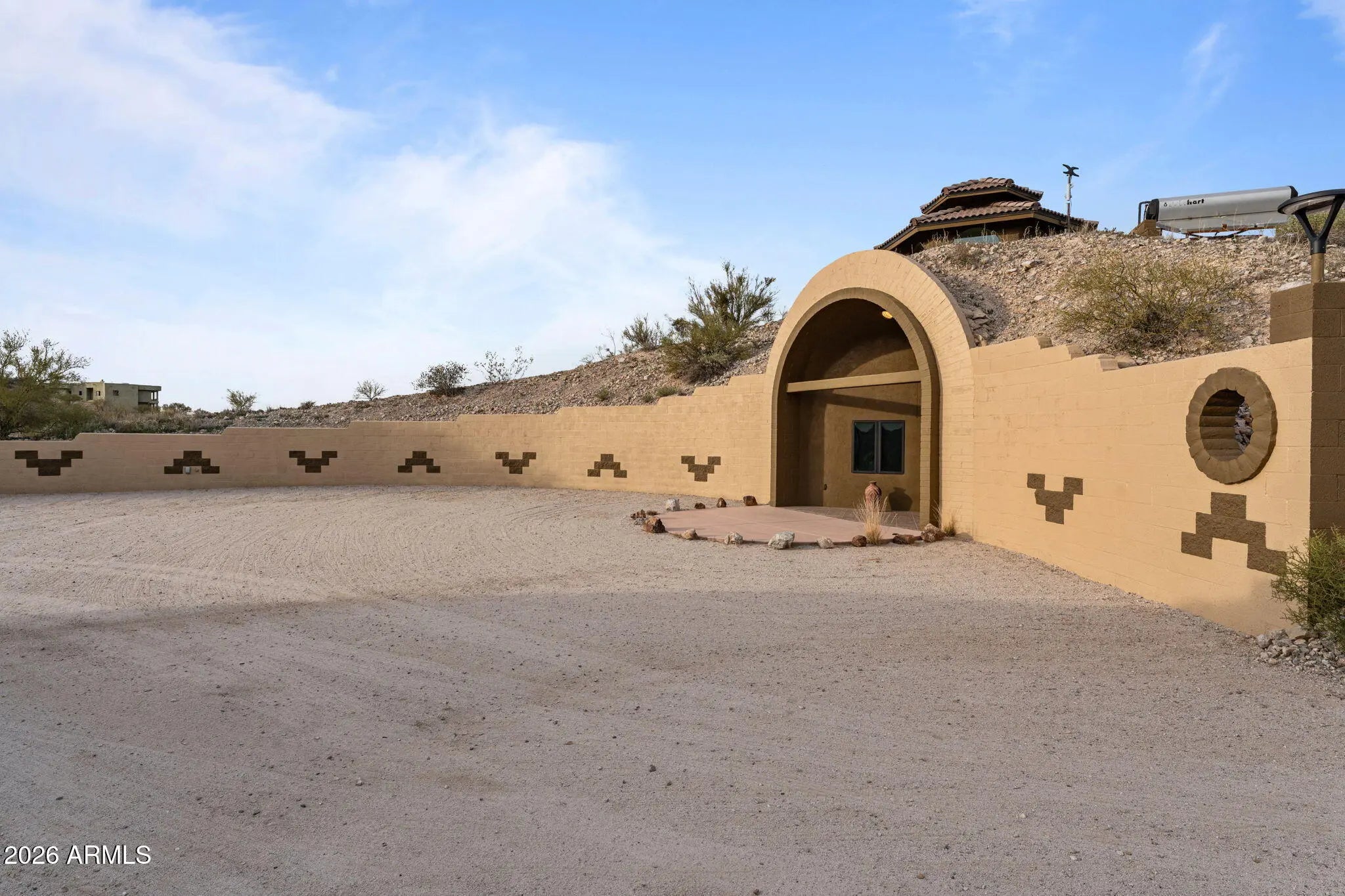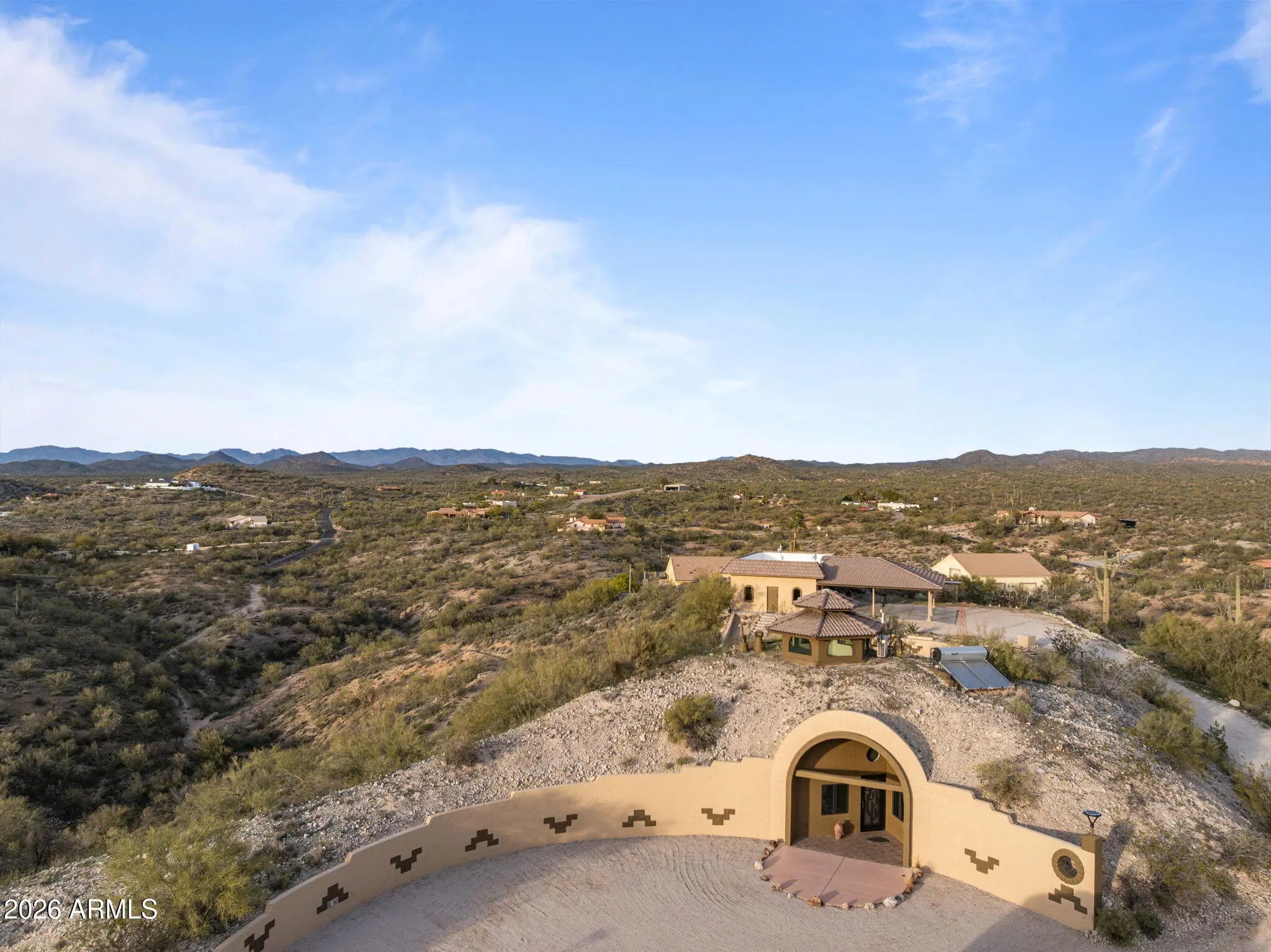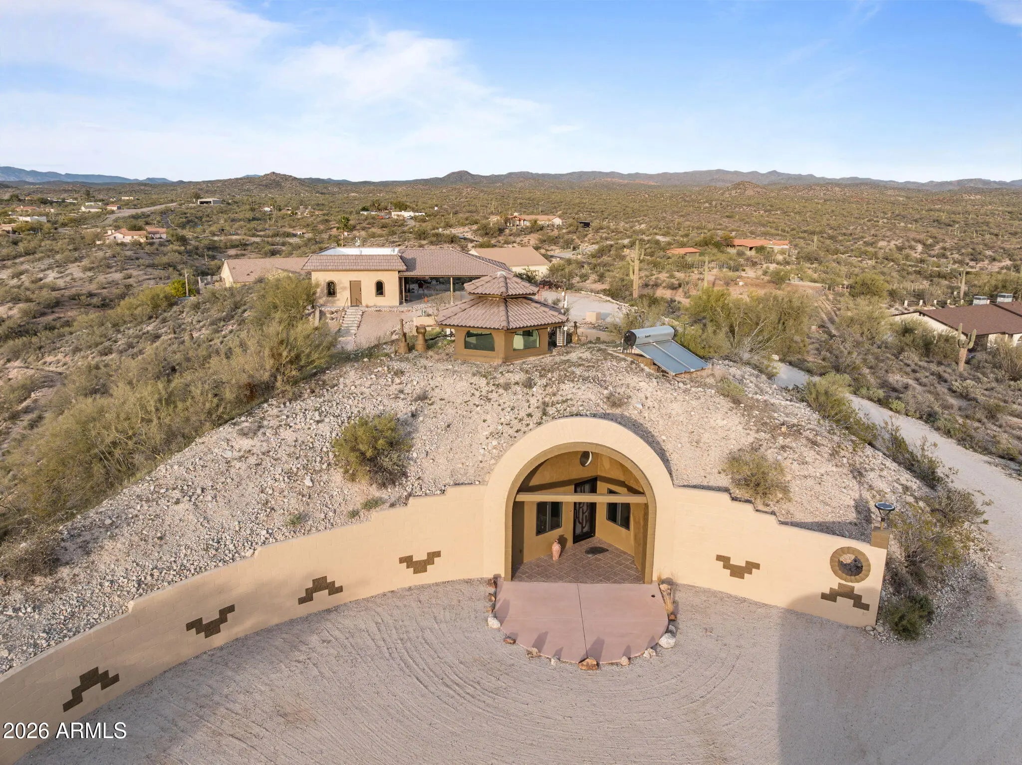 The approach is gradual. The road rises, the land opens, and the hill feels deliberate long before the home comes into view. Built into the hillside, the dome sits grounded and settled, with both the front and back doors meeting the land naturally. Iron doors anchor each entry, while front and rear patios extend the living space outward, offering places to pause, take in the views, and move easily between inside and out. A paved driveway leads the way up, reinforcing the sense that the property has been thoughtfully established rather than improvised. Inside, the curve of the enclosure is stable and quiet, holding the main living spaces in a way that feels calm and grounded. The kitchen and living room sit comfortably within the structure, creating space to cook, gather, or relax without excess. Leathered granite surfaces carry through the kitchen and bathrooms, adding a tactile, durable finish that fits the character of the home. The two bedrooms are positioned on opposite ends of the home, giving each its own sense of separation and privacy, with two bathrooms integrated naturally into the layout. Above it all, the loft rises into the center of the dome, where natural light filters down from the windows overhead and shifts throughout the day. The home has been updated with performance in mind. A heat pump and AC system were replaced in 2022, along with all windows, which were upgraded and tinted with argon gas for heat resistance. The tile roof on both the home and detached garage was replaced with a 30-year underlayment, while the flat roof on the garage was updated more recently. The exterior paint on both the home and the detached garage was refreshed within the last two years, maintaining a clean, cohesive presence across the property. Set apart from the main living space, the detached garage and carport keep vehicles and storage out of the daily flow of the home. Adjacent to them is a fully enclosed, climate-controlled room that is already plumbed, creating a rare opportunity to decide what comes next. Whether finished as a studio, workspace, wellness room, guest suite, or expanded utility space, the infrastructure is already in place, allowing the next chapter to be shaped over time rather than rushed. Behind the scenes, the essentials have been addressed. The well system was fully updated in 2025, including the pump, motor, tanks, and electrical components. The septic system has been serviced and updated. A Solahart solar hot water system, water softener and conditioner, and new outdoor solar lighting support a property designed to operate efficiently and quietly. This home doesn't announce itself. It reveals itself. For someone who pays attention to how a place is built, how it functions, and how it feels to live within it, this one makes sense the moment you arrive.