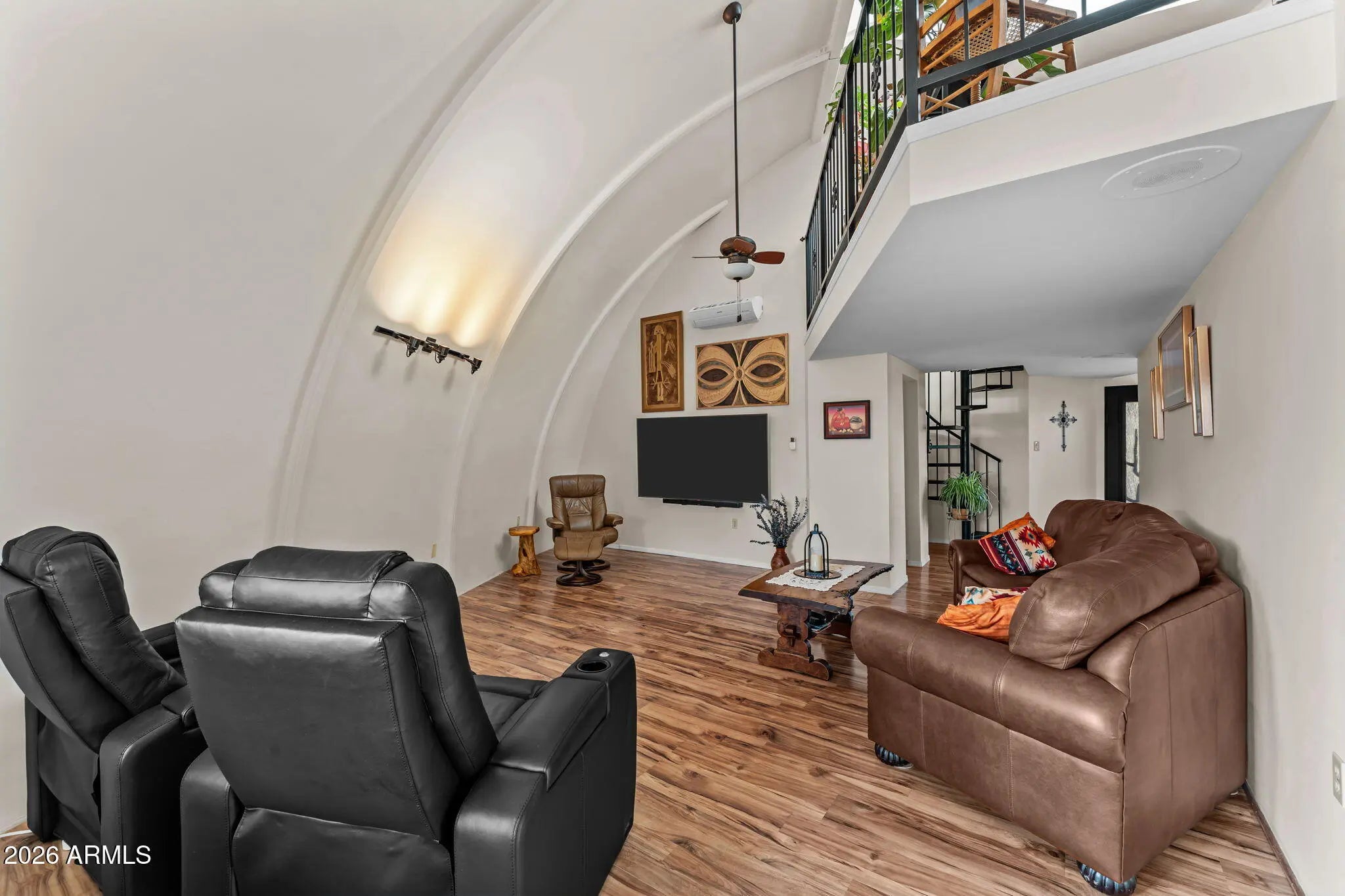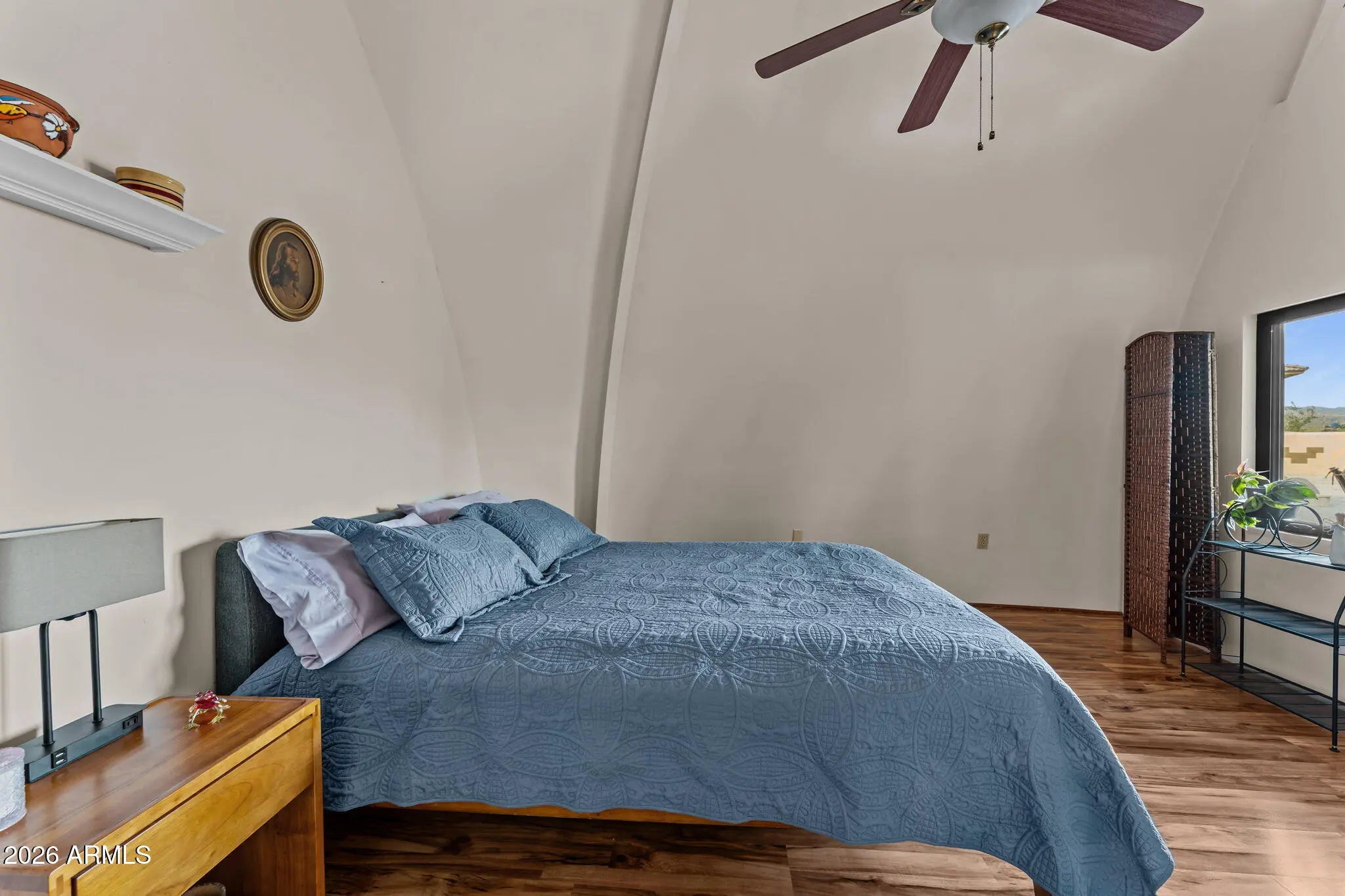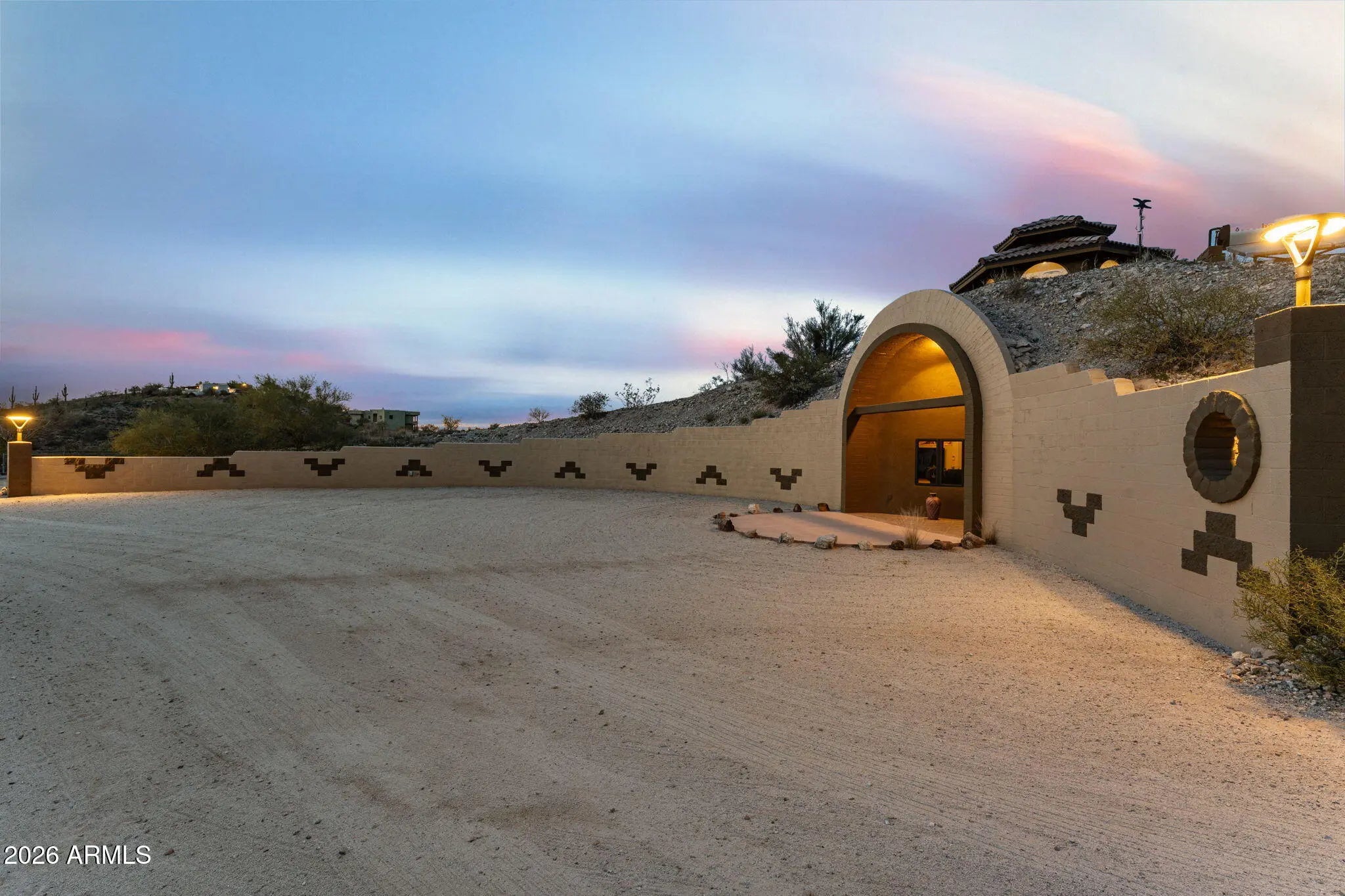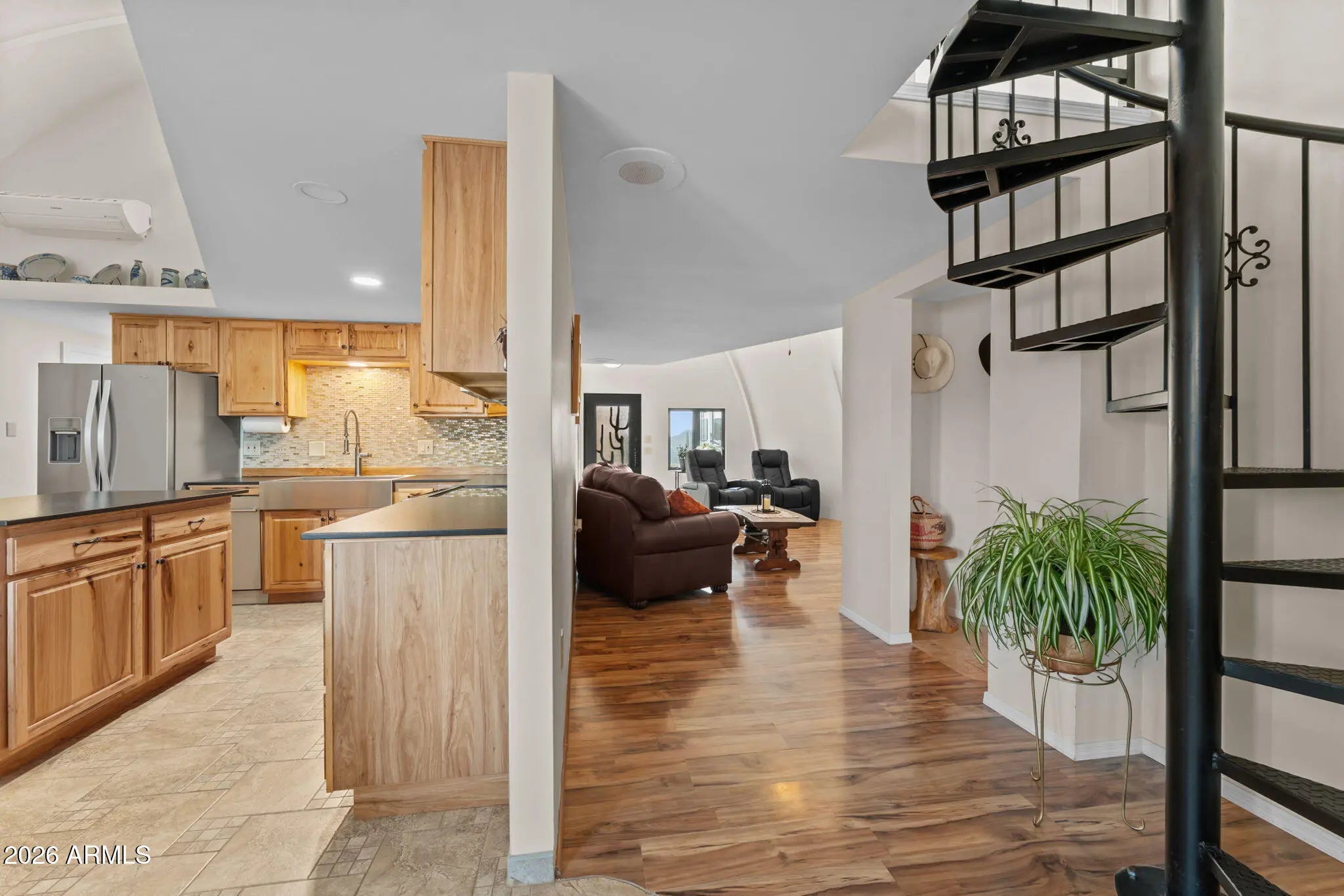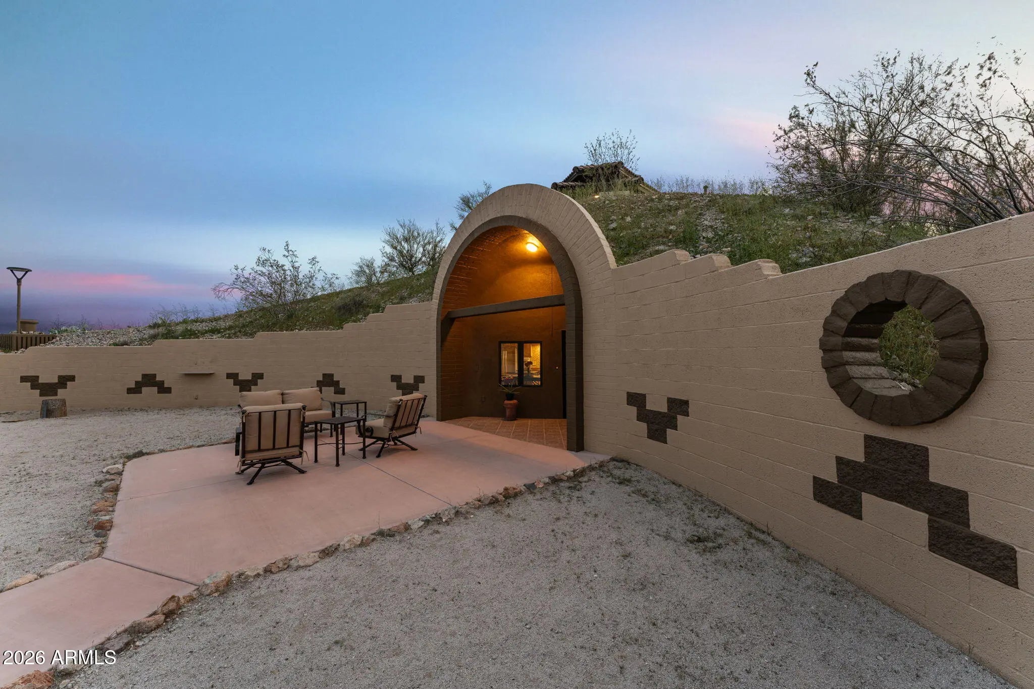 The approach is gradual. The road rises, the land opens, and the hill feels deliberate long before the home comes into view. Built into the hillside, the dome sits grounded and settled, with both the front and back doors meeting the land naturally. Iron doors anchor each entry, while front and rear patios extend the living space outward, offering places to pause, take in the views, and move easily between inside and out. A paved driveway leads the way up, reinforcing the sense that the property has been thoughtfully established rather than improvised. Inside, the curve of the enclosure is stable and quiet, holding the main living spaces in a way that feels calm and grounded. The kitchen and living room sit comfortably within the structure, creating space to cook, gather, or relax without excess. Leathered granite surfaces carry through the kitchen and bathrooms, adding a tactile, durable finish that fits the character of the home. The two bedrooms are positioned on opposite ends of the home, giving each its own sense of separation and privacy, with two bathrooms integrated naturally into the layout. Above it all, the loft rises into the center of the dome, where natural light filters down from the windows overhead and shifts throughout the day. The home has been updated with performance in mind. A heat pump and AC system were replaced in 2022, along with all windows, which were upgraded and tinted with argon gas for heat resistance. The tile roof on both the home and detached garage was replaced with a 30-year underlayment, while the flat roof on the garage was updated more recently. The exterior paint on both the home and the detached garage was refreshed within the last two years, maintaining a clean, cohesive presence across the property. Set apart from the main living space, the detached garage and carport keep vehicles and storage out of the daily flow of the home. Adjacent to them is a fully enclosed, climate-controlled room that is already plumbed, creating a rare opportunity to decide what comes next. Whether finished as a studio, workspace, wellness room, guest suite, or expanded utility space, the infrastructure is already in place, allowing the next chapter to be shaped over time rather than rushed. Behind the scenes, the essentials have been addressed. The well system was fully updated in 2025, including the pump, motor, tanks, and electrical components. The septic system has been serviced and updated. A Solahart solar hot water system, water softener and conditioner, and new outdoor solar lighting support a property designed to operate efficiently and quietly. This home doesn't announce itself. It reveals itself. For someone who pays attention to how a place is built, how it functions, and how it feels to live within it, this one makes sense the moment you arrive.