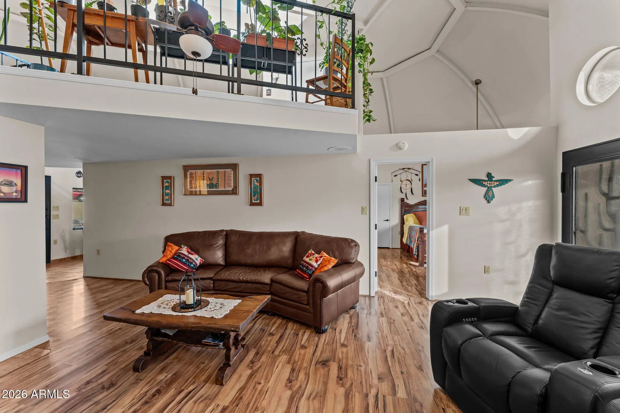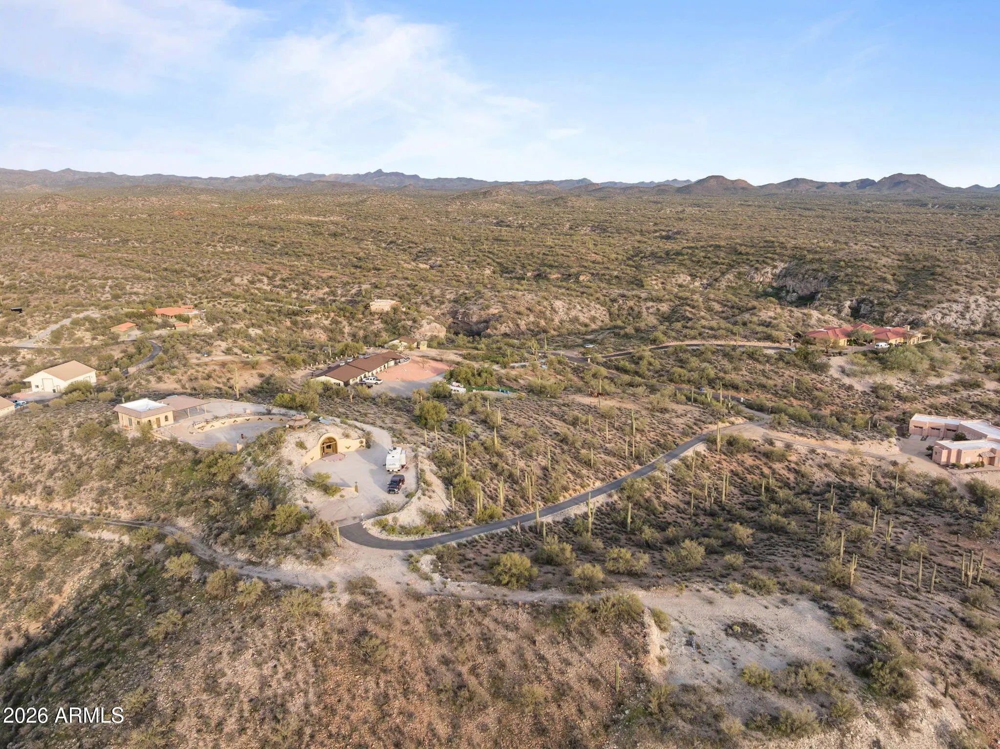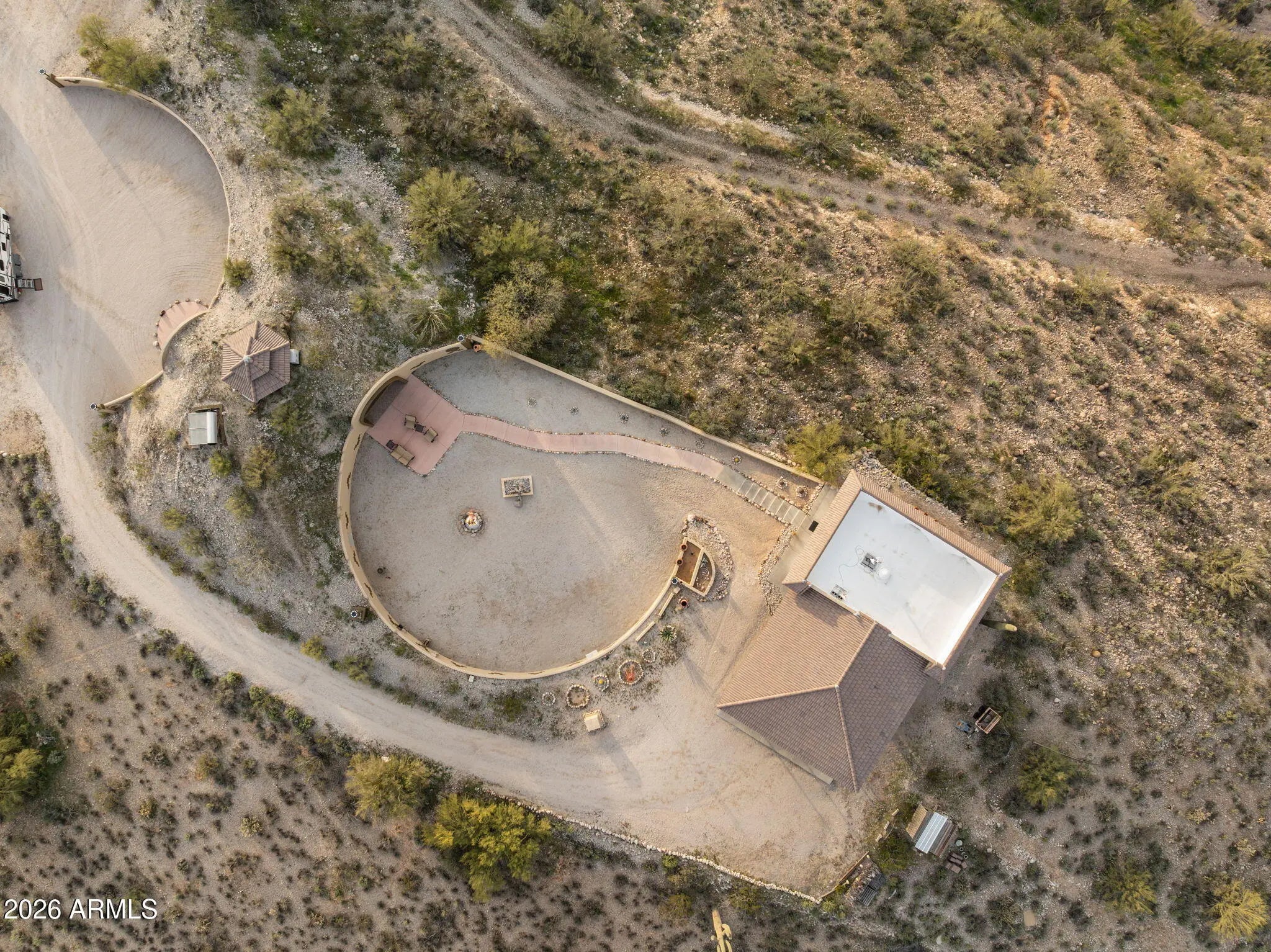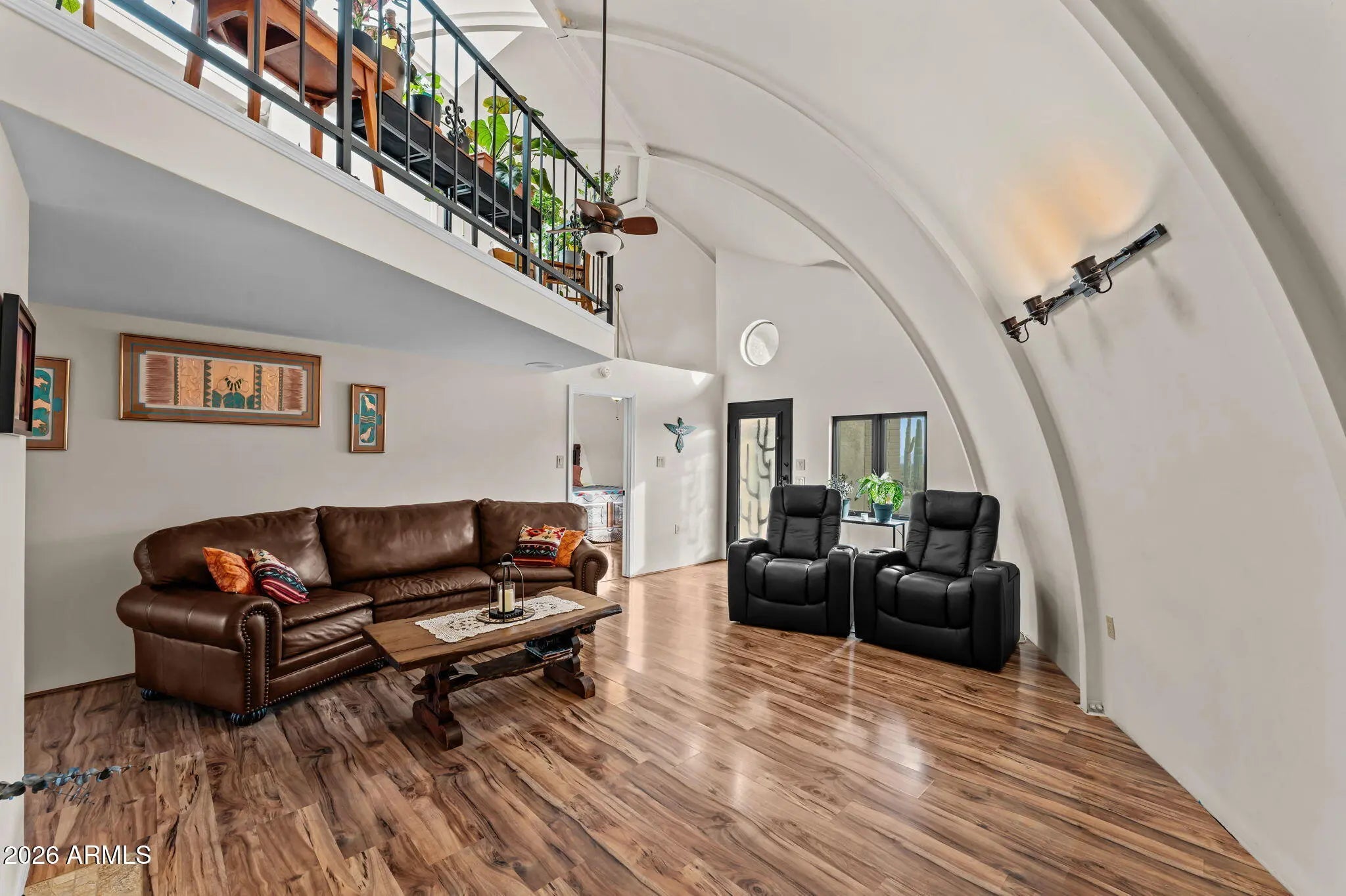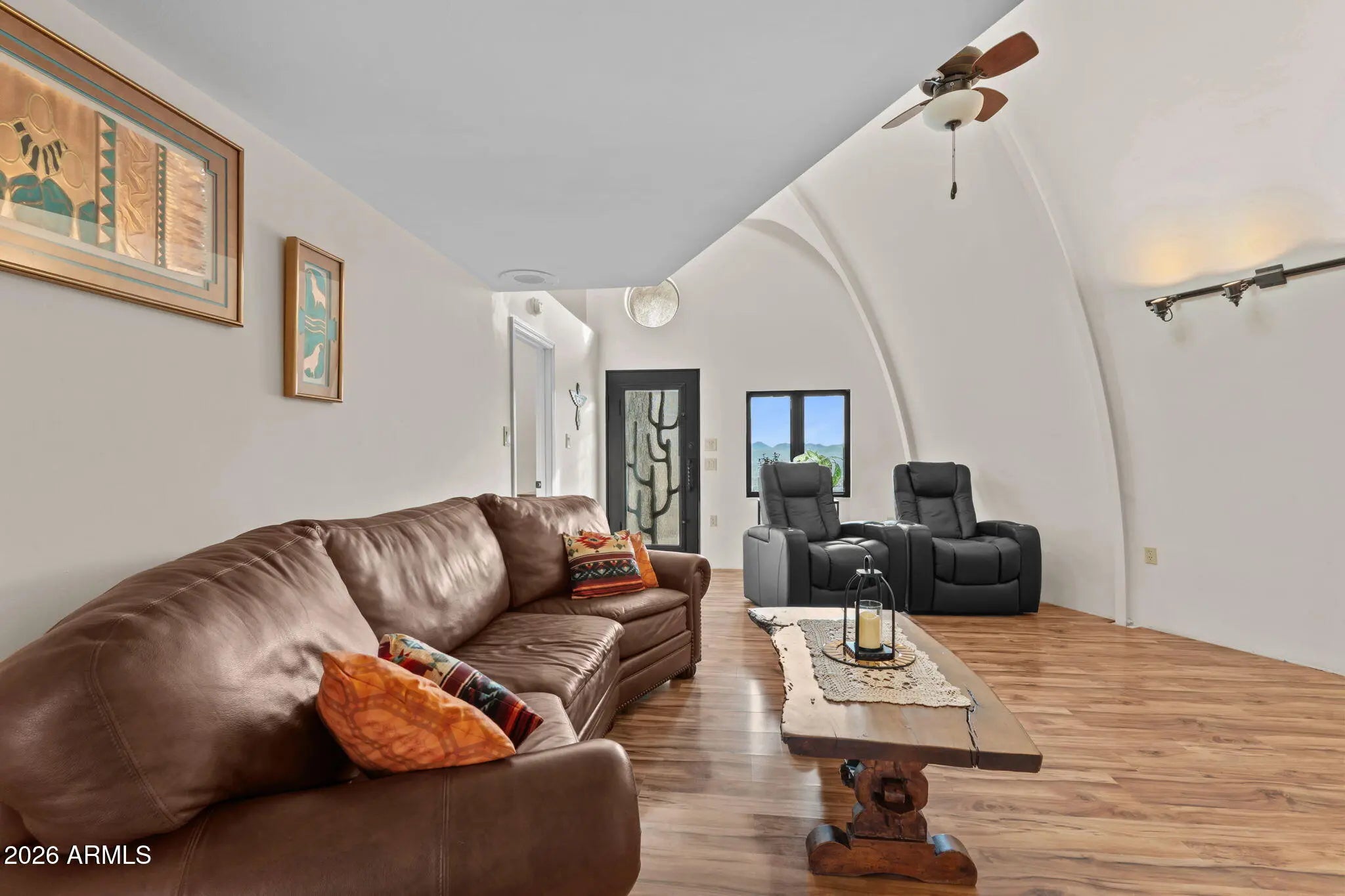 The approach is gradual. The road rises, the land opens, and the hill feels deliberate long before the home comes into view. Built into the hillside, the dome sits grounded and settled, with both the front and back doors meeting the land naturally. Iron doors anchor each entry, while front and rear patios extend the living space outward, offering places to pause, take in the views, and move easily between inside and out. A paved driveway leads the way up, reinforcing the sense that the property has been thoughtfully established rather than improvised. Inside, the curve of the enclosure is stable and quiet, holding the main living spaces in a way that feels calm and grounded. The kitchen and living room sit comfortably within the structure, creating space to cook, gather, or relax without excess. Leathered granite surfaces carry through the kitchen and bathrooms, adding a tactile, durable finish that fits the character of the home. The two bedrooms are positioned on opposite ends of the home, giving each its own sense of separation and privacy, with two bathrooms integrated naturally into the layout. Above it all, the loft rises into the center of the dome, where natural light filters down from the windows overhead and shifts throughout the day. The home has been updated with performance in mind. A heat pump and AC system were replaced in 2022, along with all windows, which were upgraded and tinted with argon gas for heat resistance. The tile roof on both the home and detached garage was replaced with a 30-year underlayment, while the flat roof on the garage was updated more recently. The exterior paint on both the home and the detached garage was refreshed within the last two years, maintaining a clean, cohesive presence across the property. Set apart from the main living space, the detached garage and carport keep vehicles and storage out of the daily flow of the home. Adjacent to them is a fully enclosed, climate-controlled room that is already plumbed, creating a rare opportunity to decide what comes next. Whether finished as a studio, workspace, wellness room, guest suite, or expanded utility space, the infrastructure is already in place, allowing the next chapter to be shaped over time rather than rushed. Behind the scenes, the essentials have been addressed. The well system was fully updated in 2025, including the pump, motor, tanks, and electrical components. The septic system has been serviced and updated. A Solahart solar hot water system, water softener and conditioner, and new outdoor solar lighting support a property designed to operate efficiently and quietly. This home doesn't announce itself. It reveals itself. For someone who pays attention to how a place is built, how it functions, and how it feels to live within it, this one makes sense the moment you arrive.