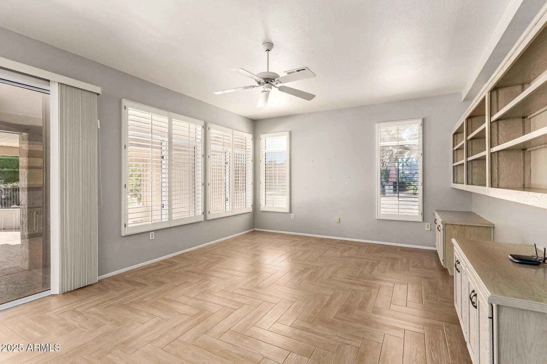 Seller-offered flooring credit allows buyers to personalize the home with finishes that fit their style. Well maintained Sandoval floor plan. 2 bedroom and 2 baths with 2150 sq ft. Enjoy energy efficiency with owned solar, plus peace of mind from major updates including roof underlayment (2021), HVAC (2019), interior and exterior paint (2025), and new sunscreens (2025). The interior features plantation shutters, a spacious layout, abundant natural light, and the opportunity to personalize flooring to your taste. A dedicated area ideal for a home office or craft space. Step outside to a covered patio surrounded by lush Arizona landscaping, ideal for relaxing or entertaining. The garage is well-appointed with built-in cabinets, a workbench, and an epoxy floor.