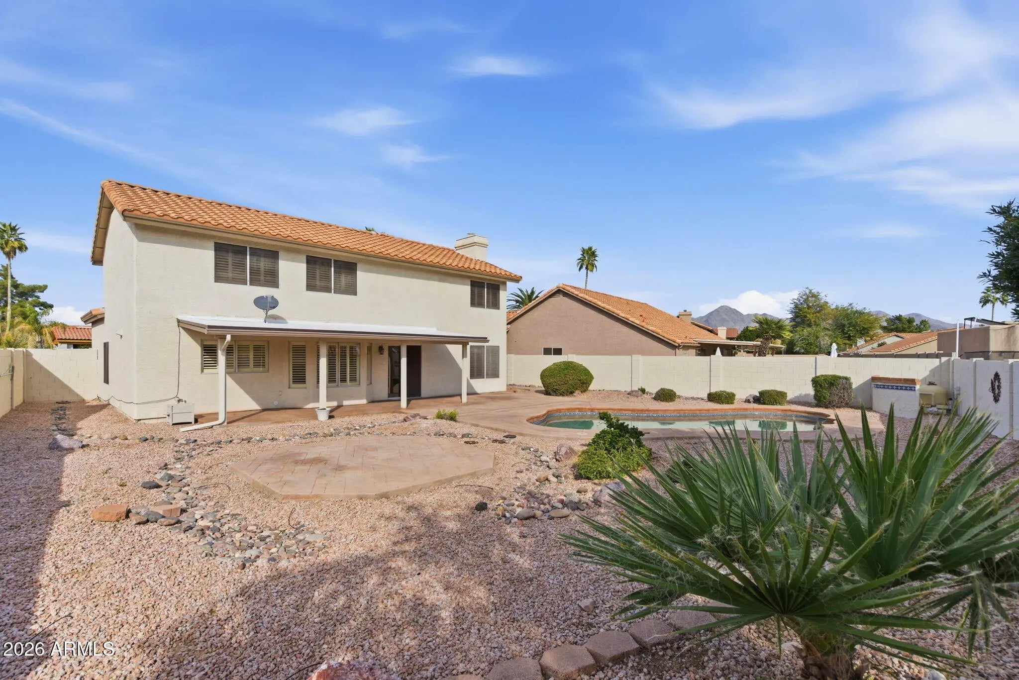 Welcome to this beautifully maintained 4-bedroom, 2.5-bath home, ideally located on a quiet cul-de-sac in Scottsdale's highly desirable 85260 zip code. Featuring a south-facing backyard, this home offers ideal Arizona sun exposure, abundant natural light, and excellent year-round outdoor enjoyment. Inside, you'll find plantation shutters, ceiling fans, and a well-designed floor plan centered around a large kitchen and spacious family room perfect for both everyday living and entertaining. The kitchen is highlighted by granite countertops, ample cabinetry, and a large pantry, while a wood-burning fireplace in the family room adds warmth and charm. Upstairs, the primary suite provides a relaxing retreat with a jetted soaking tub and generous closet space. Three additional bedrooms upstairs share a full bath, offering a practical and comfortable layout. A convenient half bath downstairs is ideal for guests. The 3-car garage offers ample storage, accommodating vehicles, tools, and Arizona lifestyle gear. Step outside to enjoy a private backyard oasis with south-facing exposure, a sports-style pool with an in-floor cleaning system, a large covered patio, stamped concrete, and a separate pad perfect for a gazebo, outdoor dining, or fire pit. Additional features include motion-sensor lighting front and back, irrigation with timers, gutters, dual-pane windows, a security front door, and spectacular mountain views. Located close to shopping, restaurants, and entertainment, this home offers the perfect blend of comfort, functionality, and the Scottsdale lifestyle in a neighborhood buyers love.