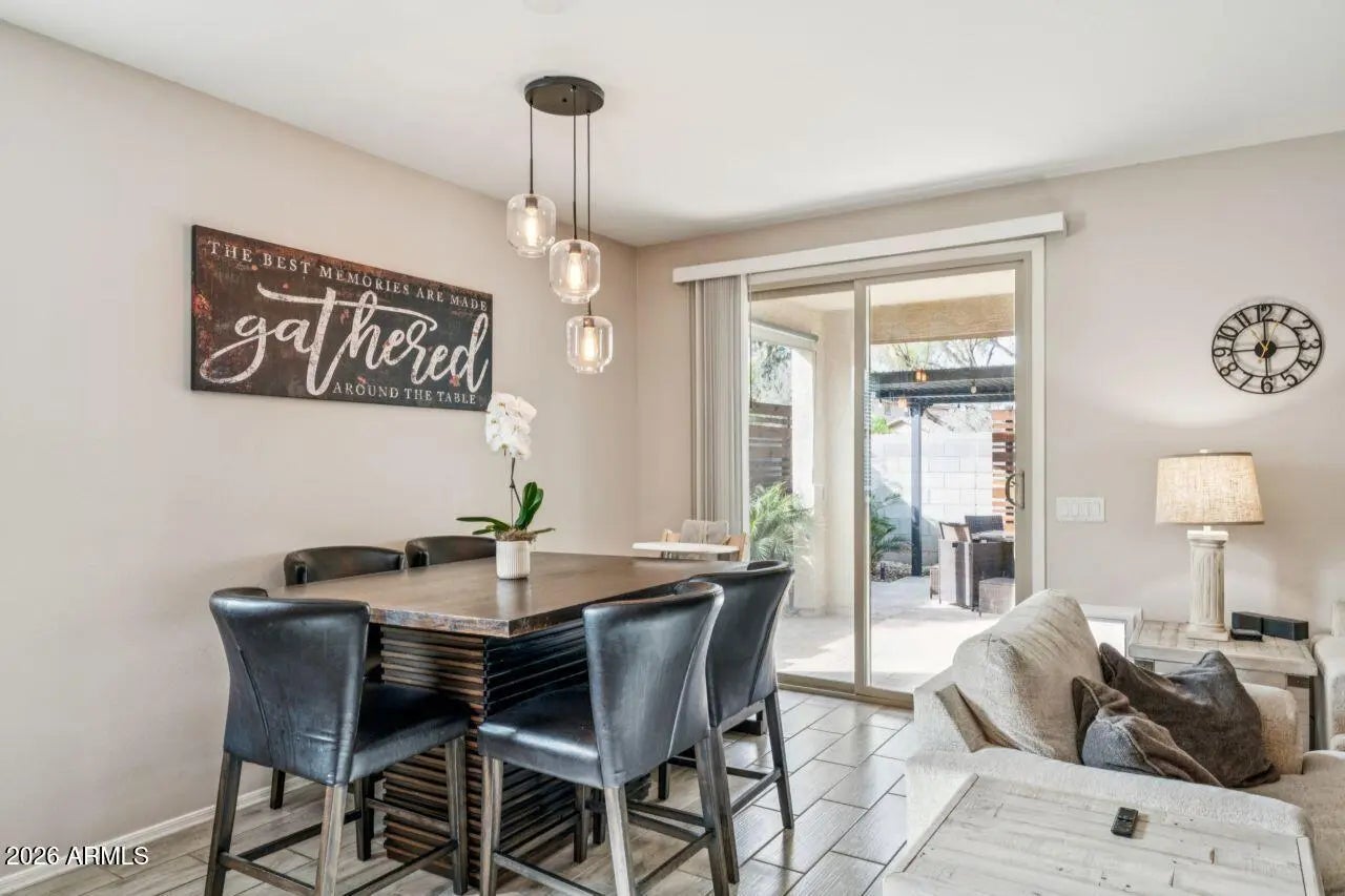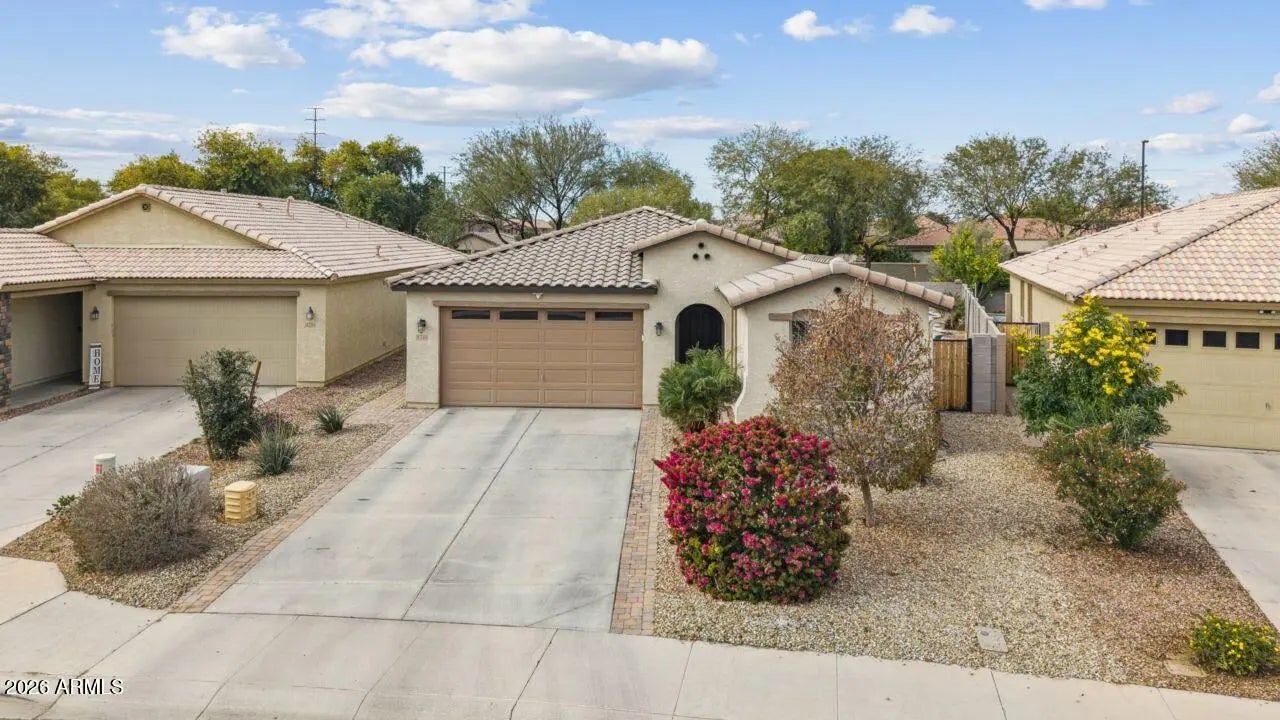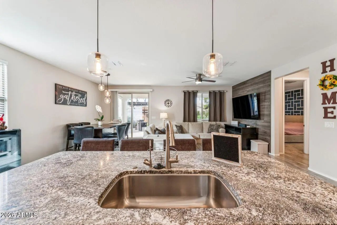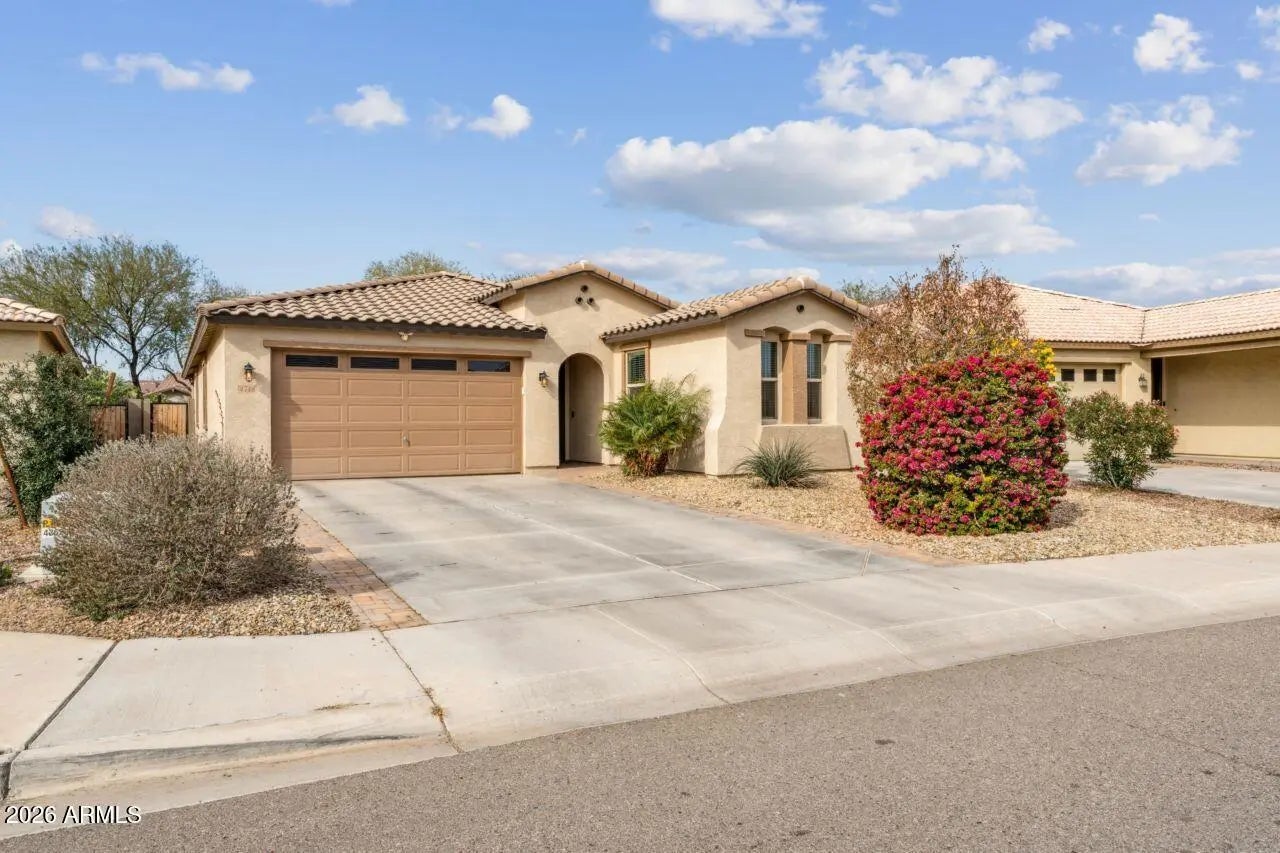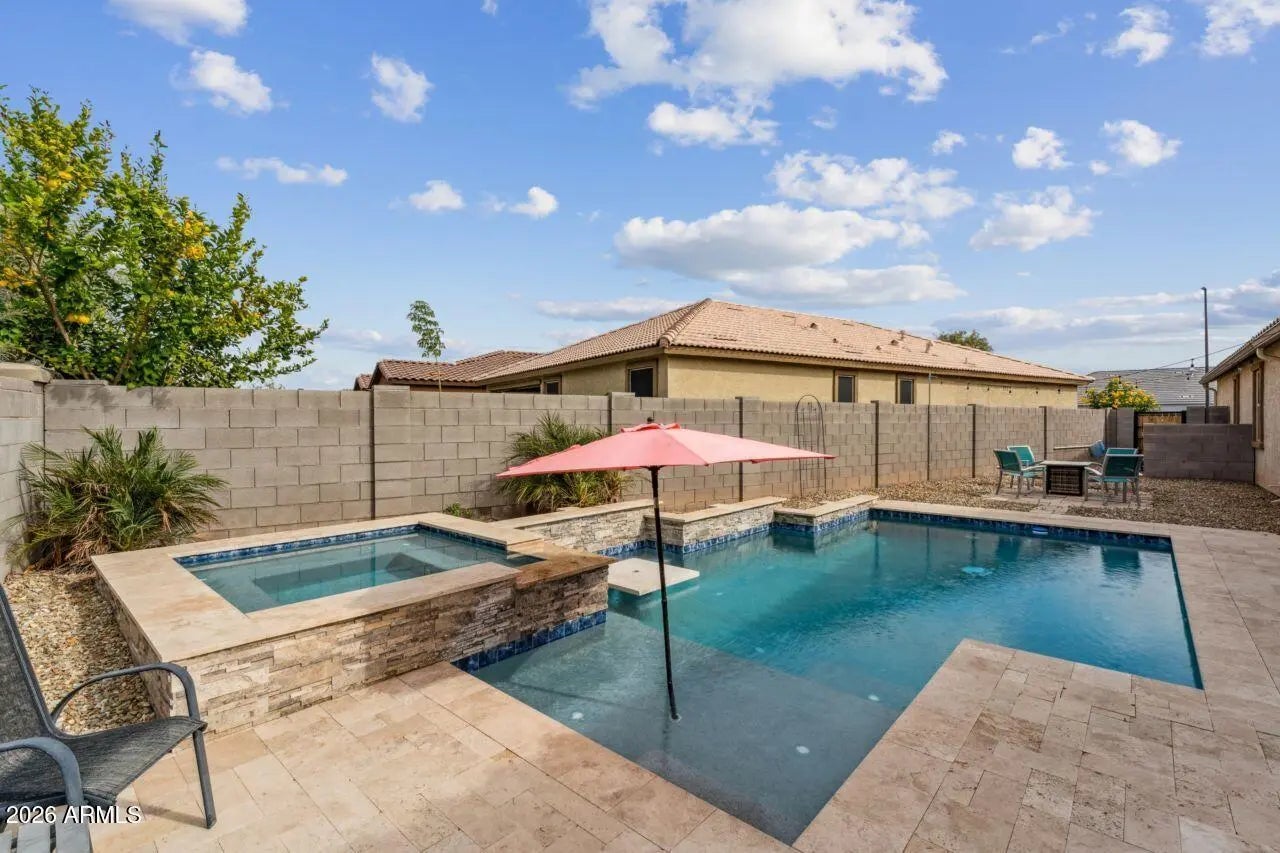 This home is stunning and still under builder warranty. Built in 2021, it offers 4 bedrooms and 2 bathrooms with a desirable split floor plan. The kitchen features a large island, granite countertops, and a 5-burner gas cooktop, perfect for entertaining. The dining area opens to a spacious great room with a custom paneled accent wall. Porcelain plank tile flows throughout the home. The primary suite showcases custom millwork, dual sinks, a large walk-in shower, and an oversized closet. Refrigerator, washer, and dryer are included. The backyard is an entertainer's dream with a ramada, travertine deck, fountain, café lights, artificial turf—and an amazing pool and spa creating the perfect outdoor retreat.