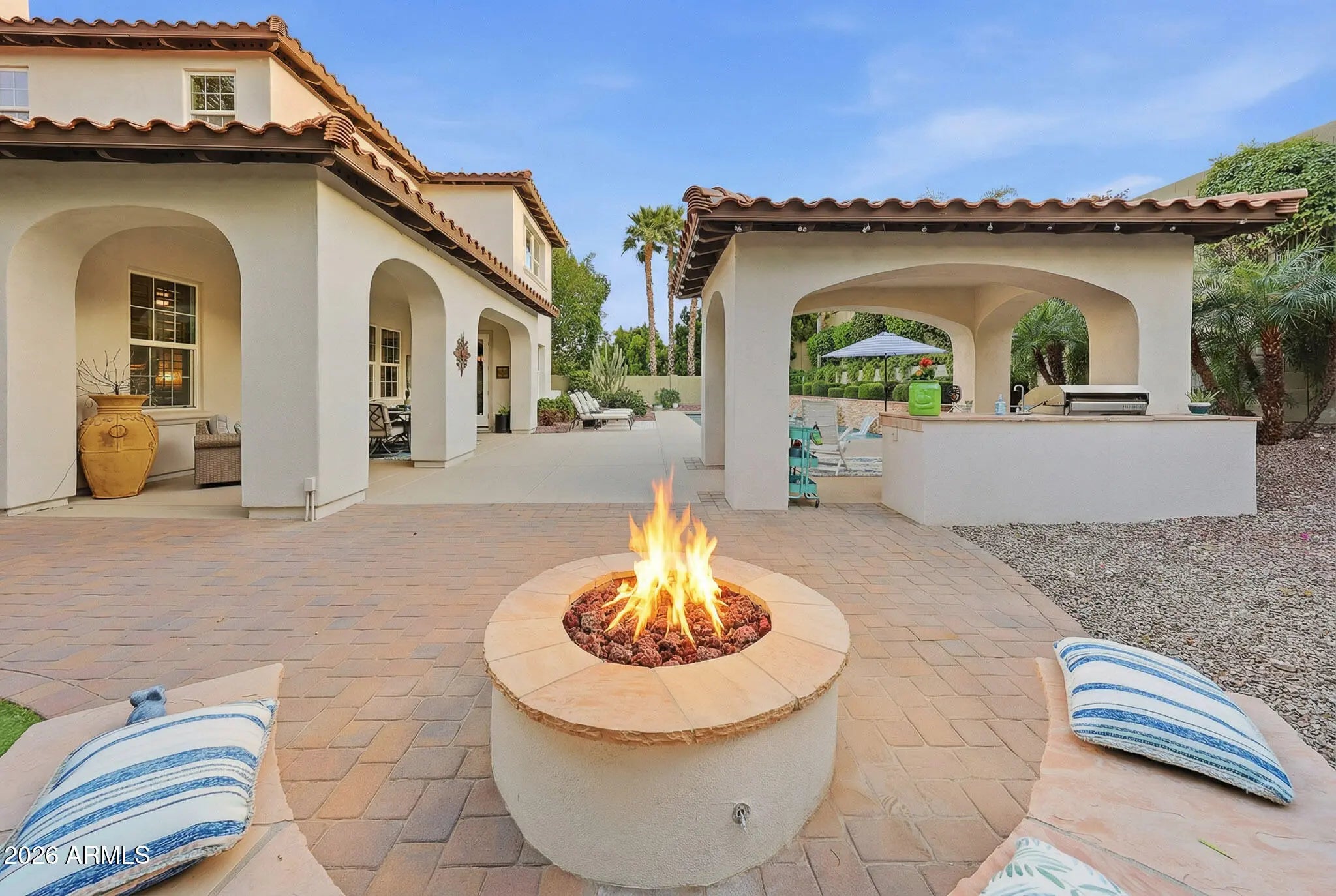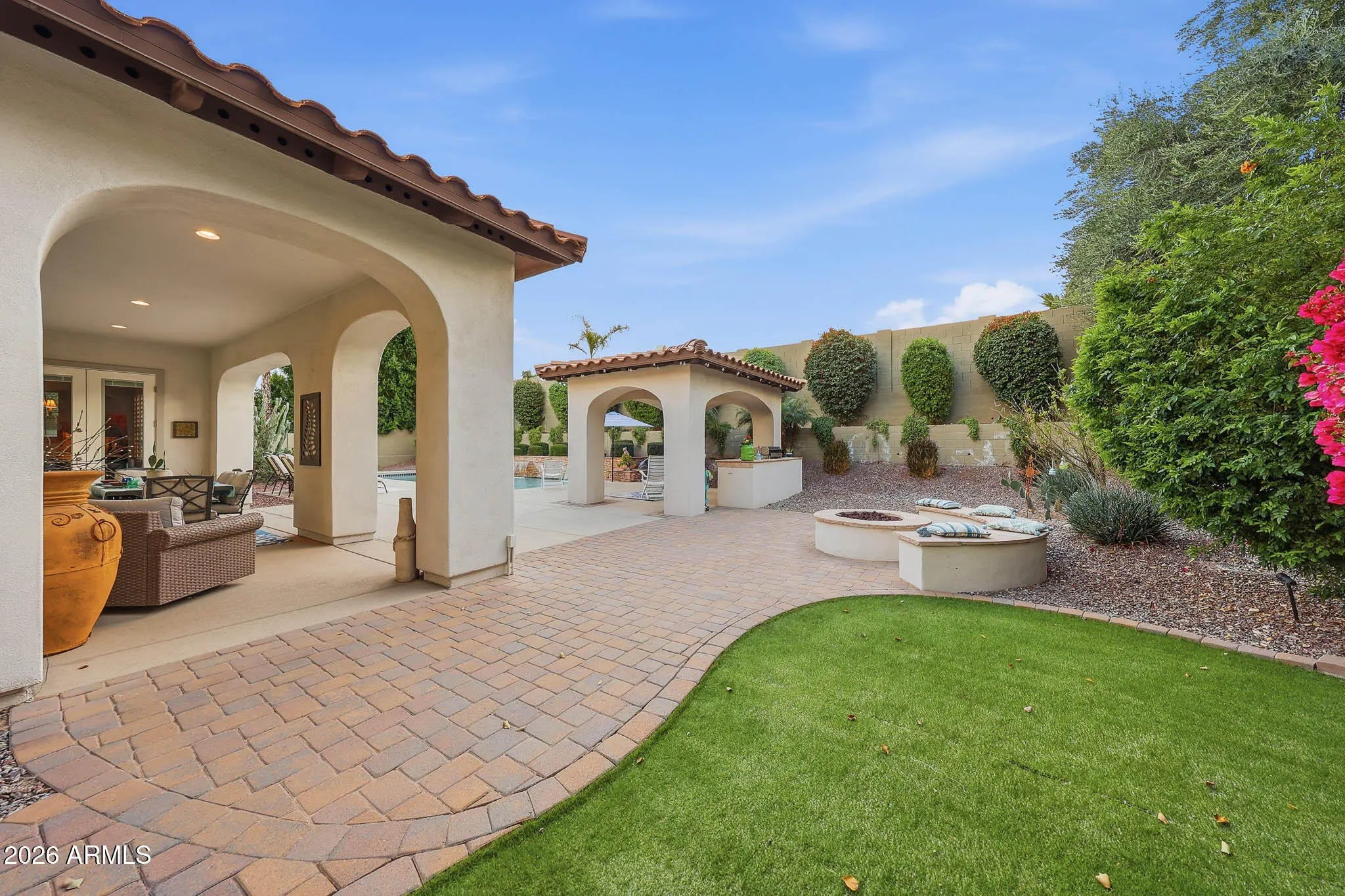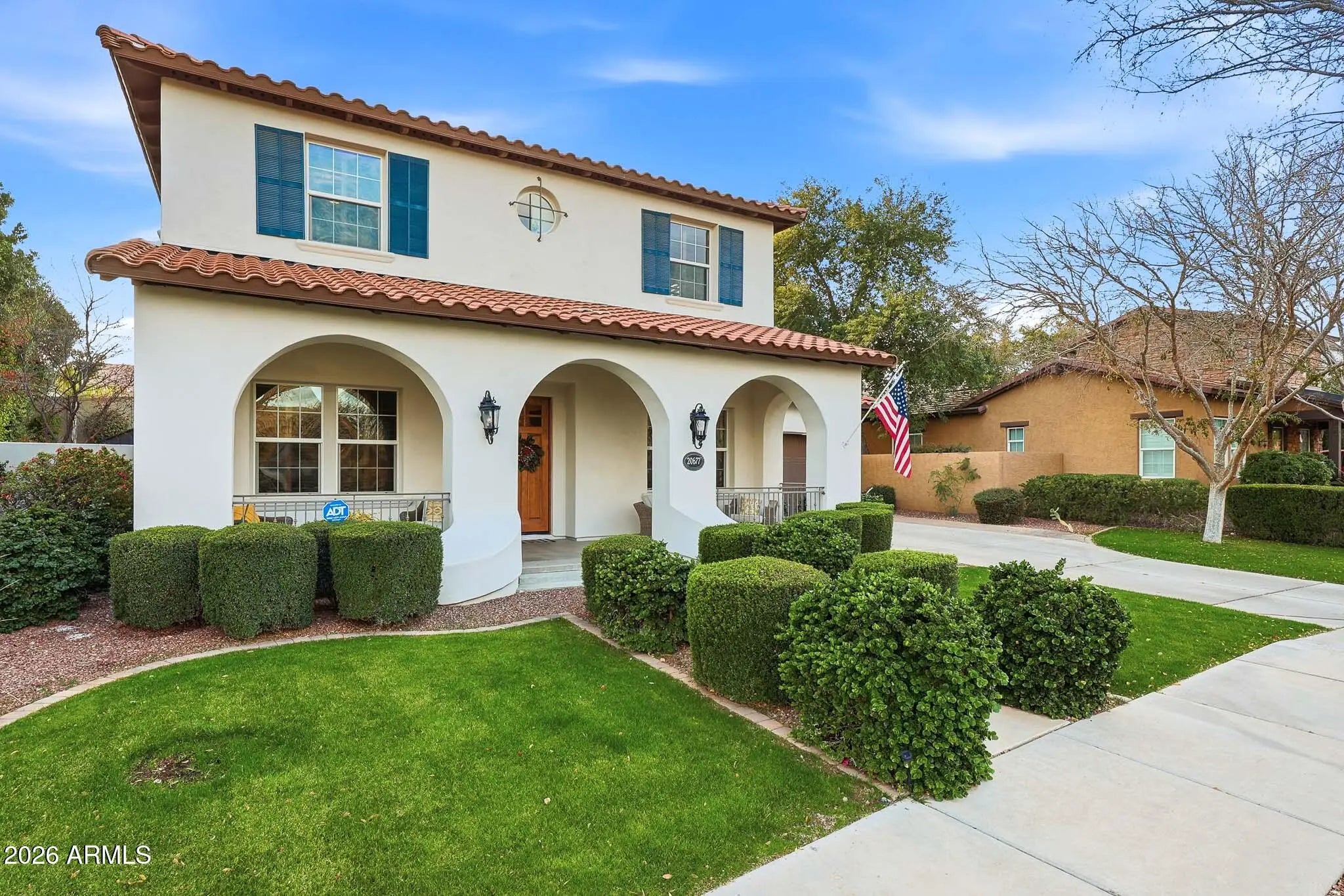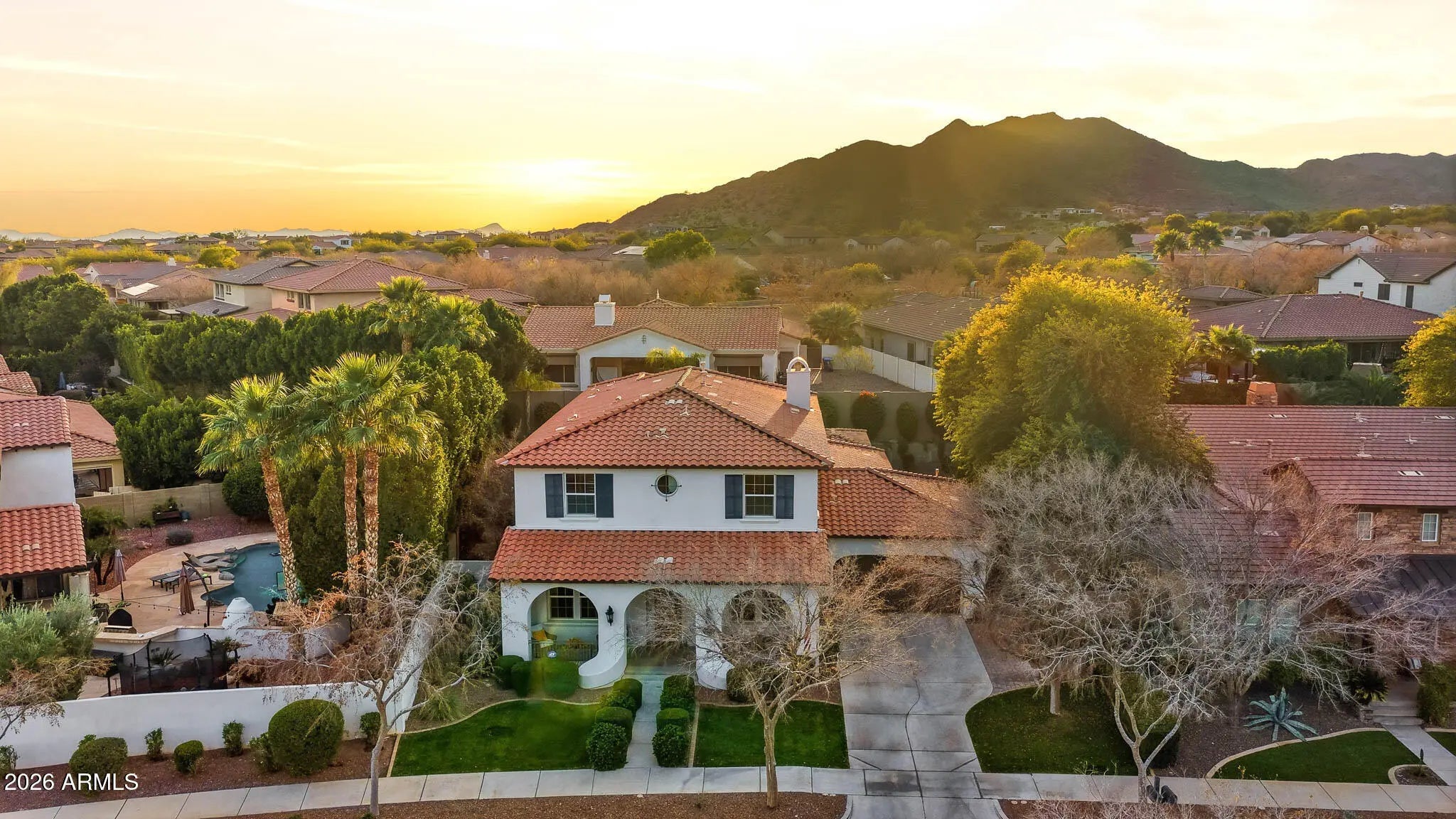 Discover this gorgeous Spanish Colonial two-story residence ideally located in the heart of Verrado's Main Street District. Offering 4,052 sq ft of thoughtfully designed living space, this home features 4 bedrooms, 3.5 bathrooms, and a versatile floorplan including a formal living room, dining room, private office, spacious family room, and a fully equipped kitchen - perfect for both everyday living and entertaining. Every detail reflects exceptional pride of ownership, from the striking custom brick archway entry to the hand-scraped wood floors, beautiful cabinetry, and classic plantation shutters. From the moment you step inside, the home exudes warmth, cohesion, and timeless design, creating a space that feels both elegant and inviting. Step outside to a private outdoor retreat, a secluded desert oasis designed for unforgettable gatherings. Enjoy a sparkling pool, lush mature landscaping, an expansive covered patio, ramada with built-in BBQ, fire pit, and low-maintenance artificial turf; an ideal setting for relaxing evenings and entertaining family and friends. Upstairs, spacious bedrooms are anchored by an oversized primary suite complete with a sitting area and a spa-inspired bath featuring a soaking tub, dual vanities, and a generous walk-in closet. An additional ensuite bedroom, along with two more bedrooms and a shared bath, completes the upper level. Living in Verrado means enjoying iconic tree-lined streets, over 86 parks, championship golf, A-rated schools, and the upcoming Vestar outdoor shopping and dining district, slated to open in 2026 with shops, restaurants, and a movie theater. Experience the lifestyle that makes Verrado one of Arizona's award-winning master-planned communities. Schedule your private tour today and see firsthand everything this remarkable home has to offer.