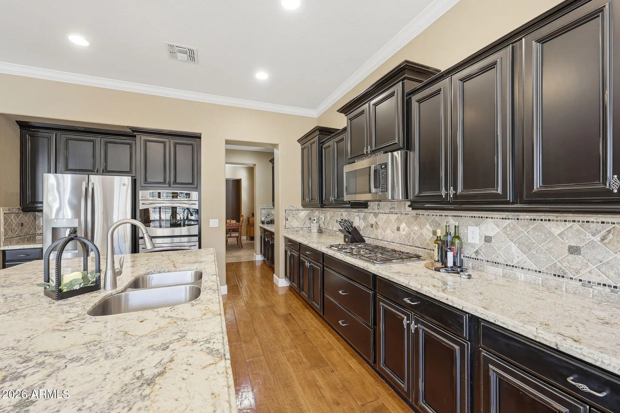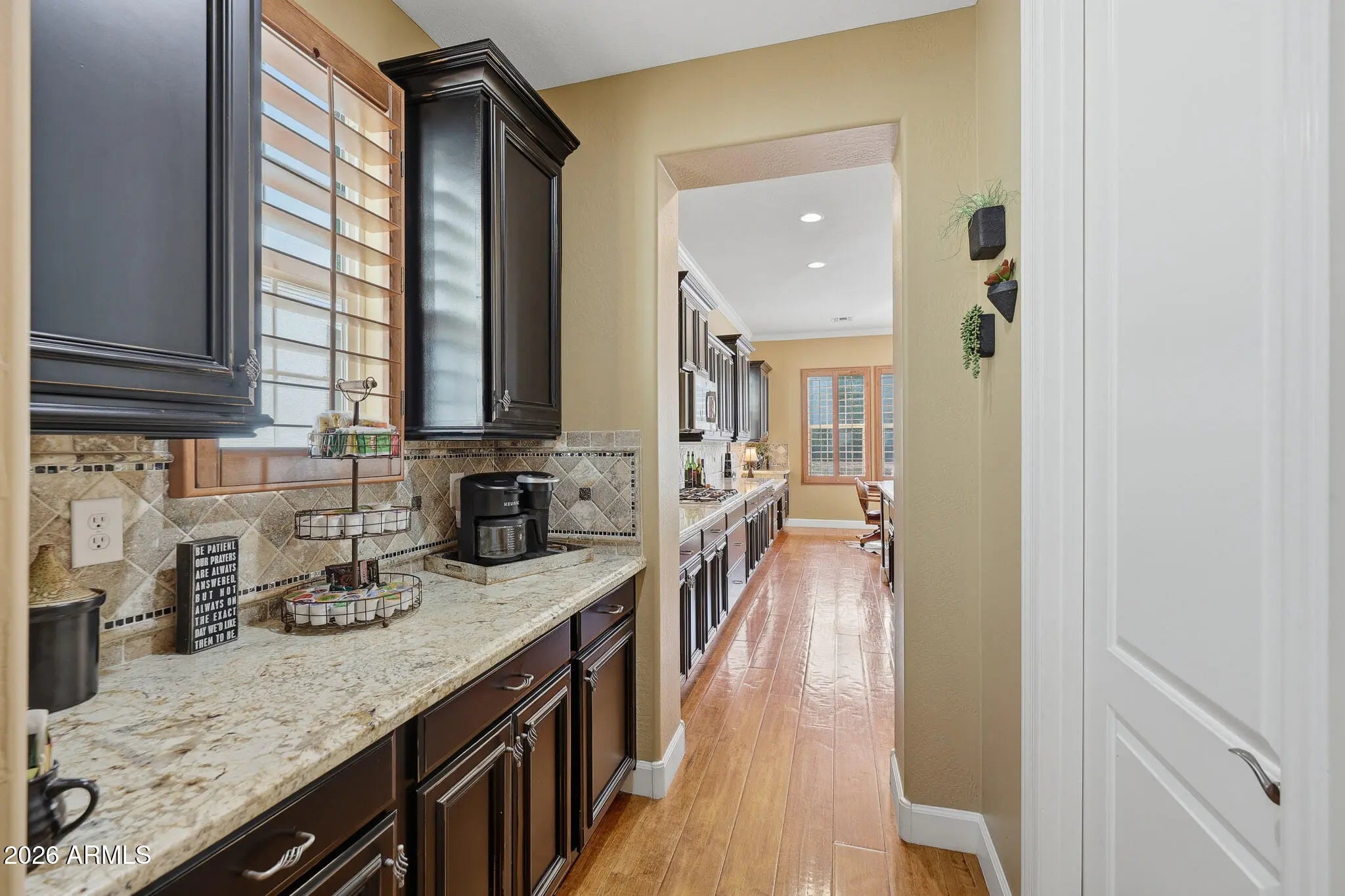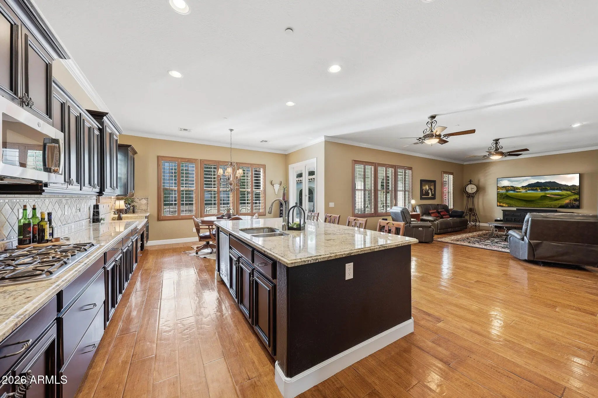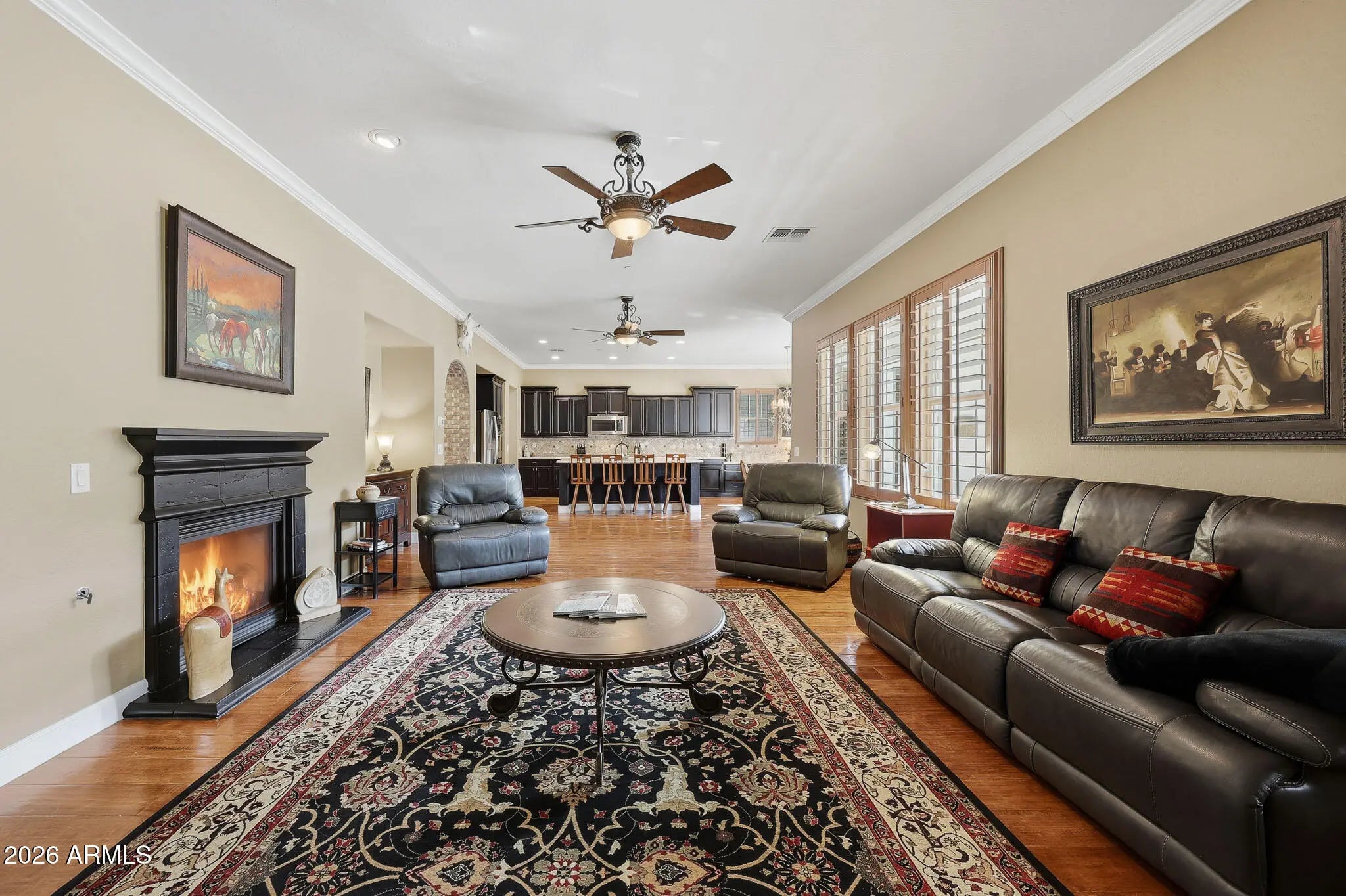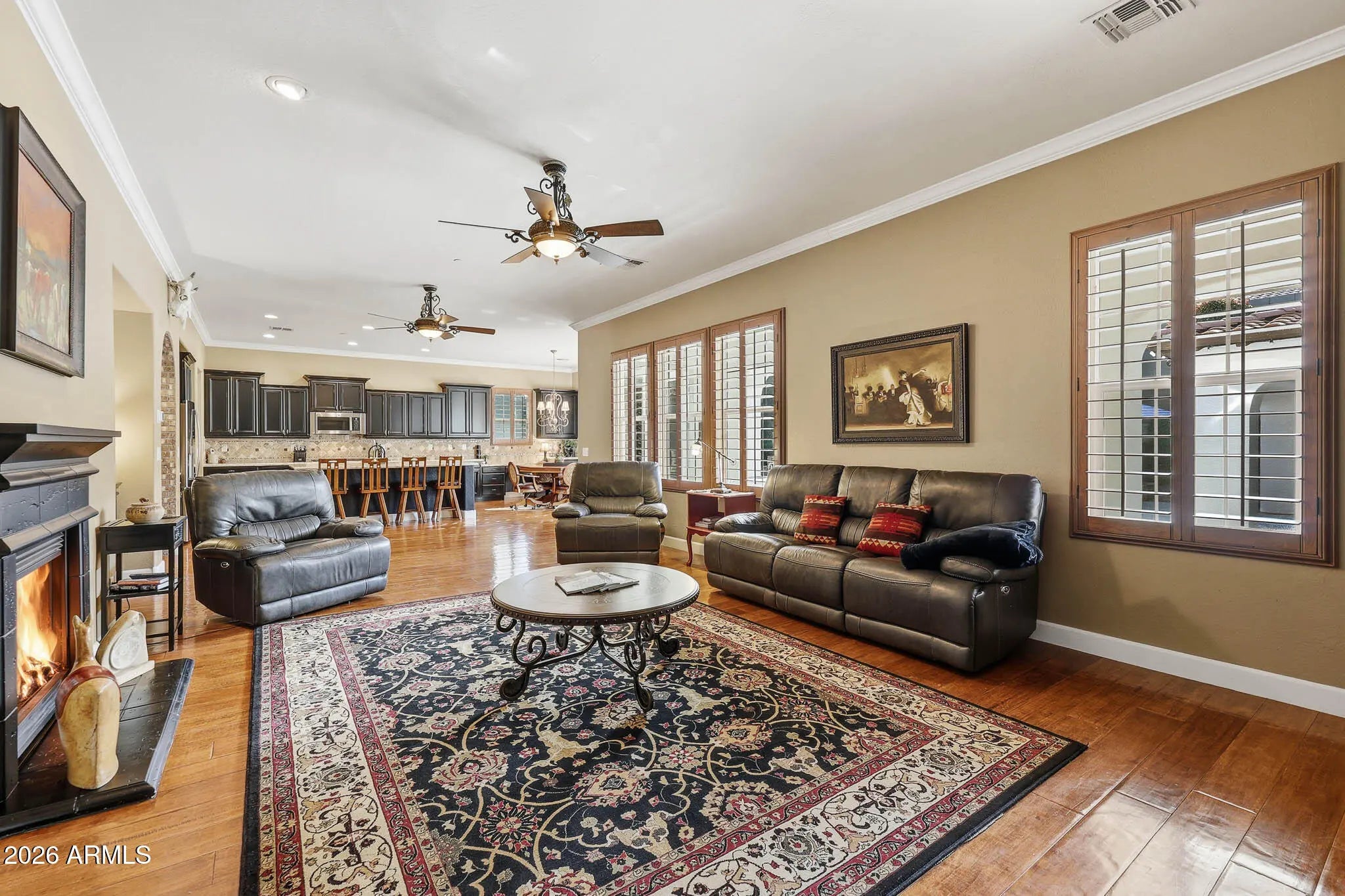 Discover this gorgeous Spanish Colonial two-story residence ideally located in the heart of Verrado's Main Street District. Offering 4,052 sq ft of thoughtfully designed living space, this home features 4 bedrooms, 3.5 bathrooms, and a versatile floorplan including a formal living room, dining room, private office, spacious family room, and a fully equipped kitchen - perfect for both everyday living and entertaining. Every detail reflects exceptional pride of ownership, from the striking custom brick archway entry to the hand-scraped wood floors, beautiful cabinetry, and classic plantation shutters. From the moment you step inside, the home exudes warmth, cohesion, and timeless design, creating a space that feels both elegant and inviting. Step outside to a private outdoor retreat, a secluded desert oasis designed for unforgettable gatherings. Enjoy a sparkling pool, lush mature landscaping, an expansive covered patio, ramada with built-in BBQ, fire pit, and low-maintenance artificial turf; an ideal setting for relaxing evenings and entertaining family and friends. Upstairs, spacious bedrooms are anchored by an oversized primary suite complete with a sitting area and a spa-inspired bath featuring a soaking tub, dual vanities, and a generous walk-in closet. An additional ensuite bedroom, along with two more bedrooms and a shared bath, completes the upper level. Living in Verrado means enjoying iconic tree-lined streets, over 86 parks, championship golf, A-rated schools, and the upcoming Vestar outdoor shopping and dining district, slated to open in 2026 with shops, restaurants, and a movie theater. Experience the lifestyle that makes Verrado one of Arizona's award-winning master-planned communities. Schedule your private tour today and see firsthand everything this remarkable home has to offer.