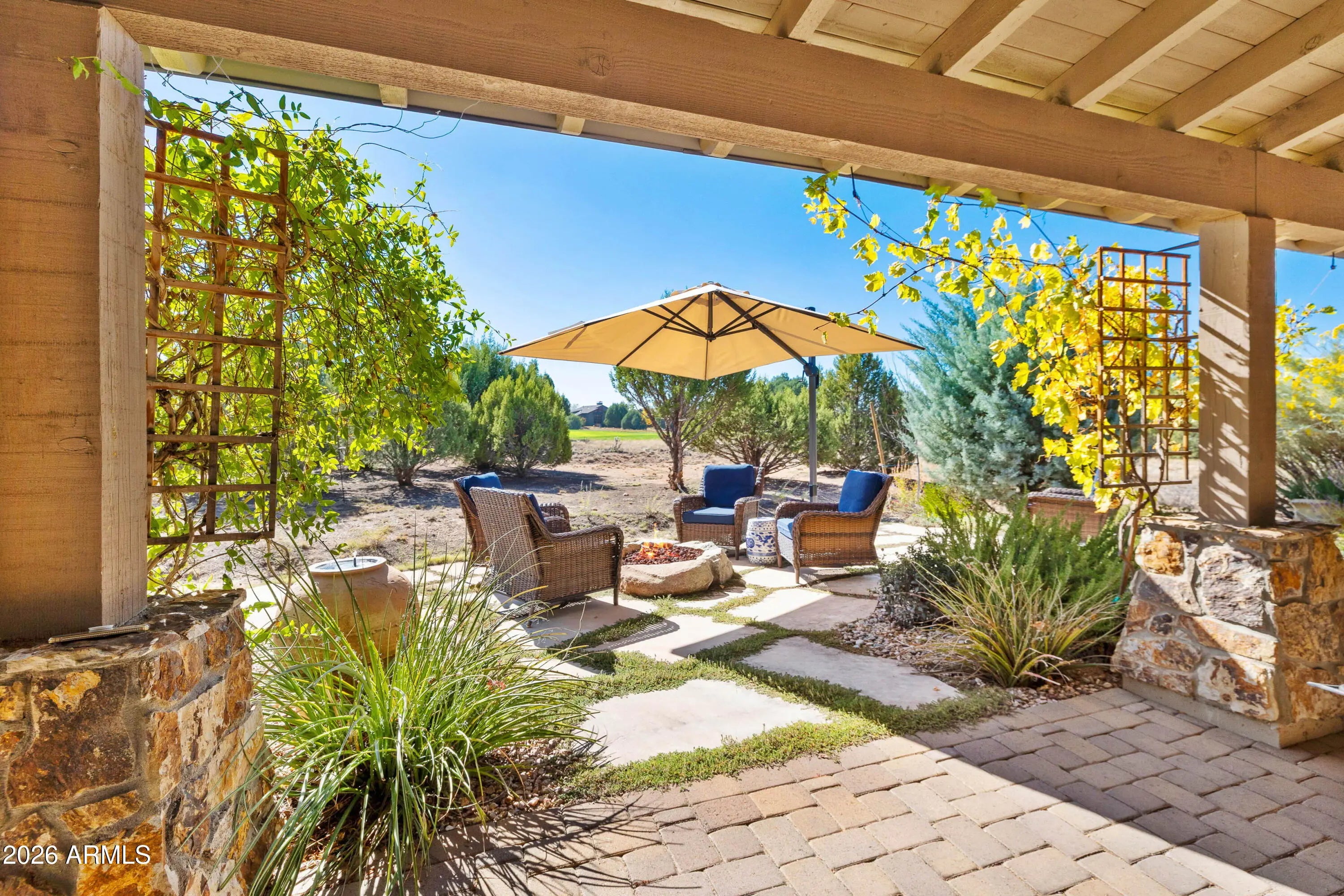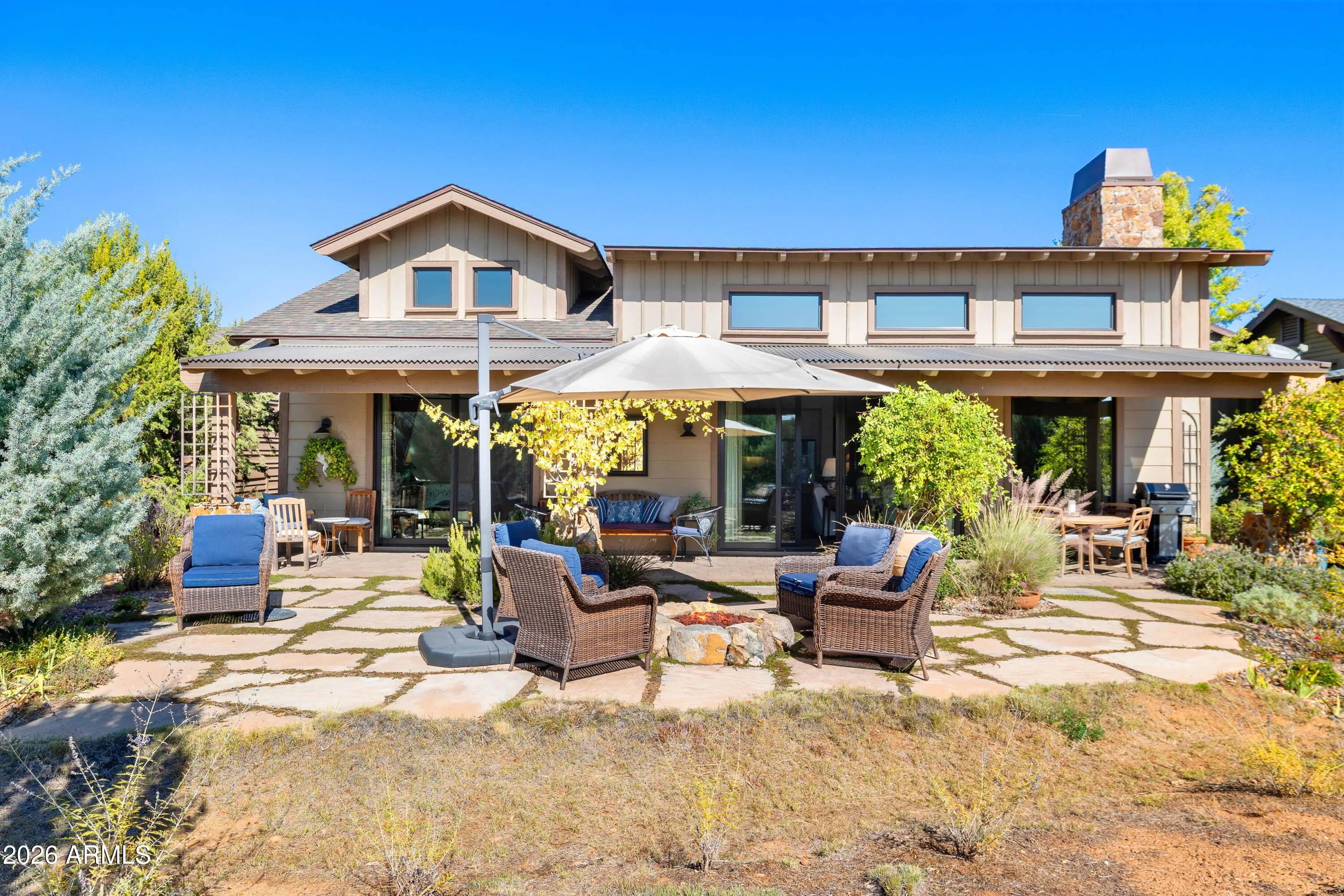 Stylish ranch cottage in a prime golf course location by the second green. Alfresco living on 4 terraces: south facing covered back patio that's shaded in Summer yet sunny in Winter, extended flagstone patio surrounded by fragrant creeping thyme and organic firepit, covered front patio and private casita patio. Mature trees allow you to enjoy privacy on back patios while enjoying views of the golf course. Open design concept ensures a seamless flow of space and large windows and doors throughout provide welcome natural light. This floor plan offers 3 beds, 3 baths plus an attached 1-bed, 1-bath casita with private entry. Classic travertine floors, neutral walls, brie color top tier cabinetry and timeless stone fireplace complement transitional and contemporary design.