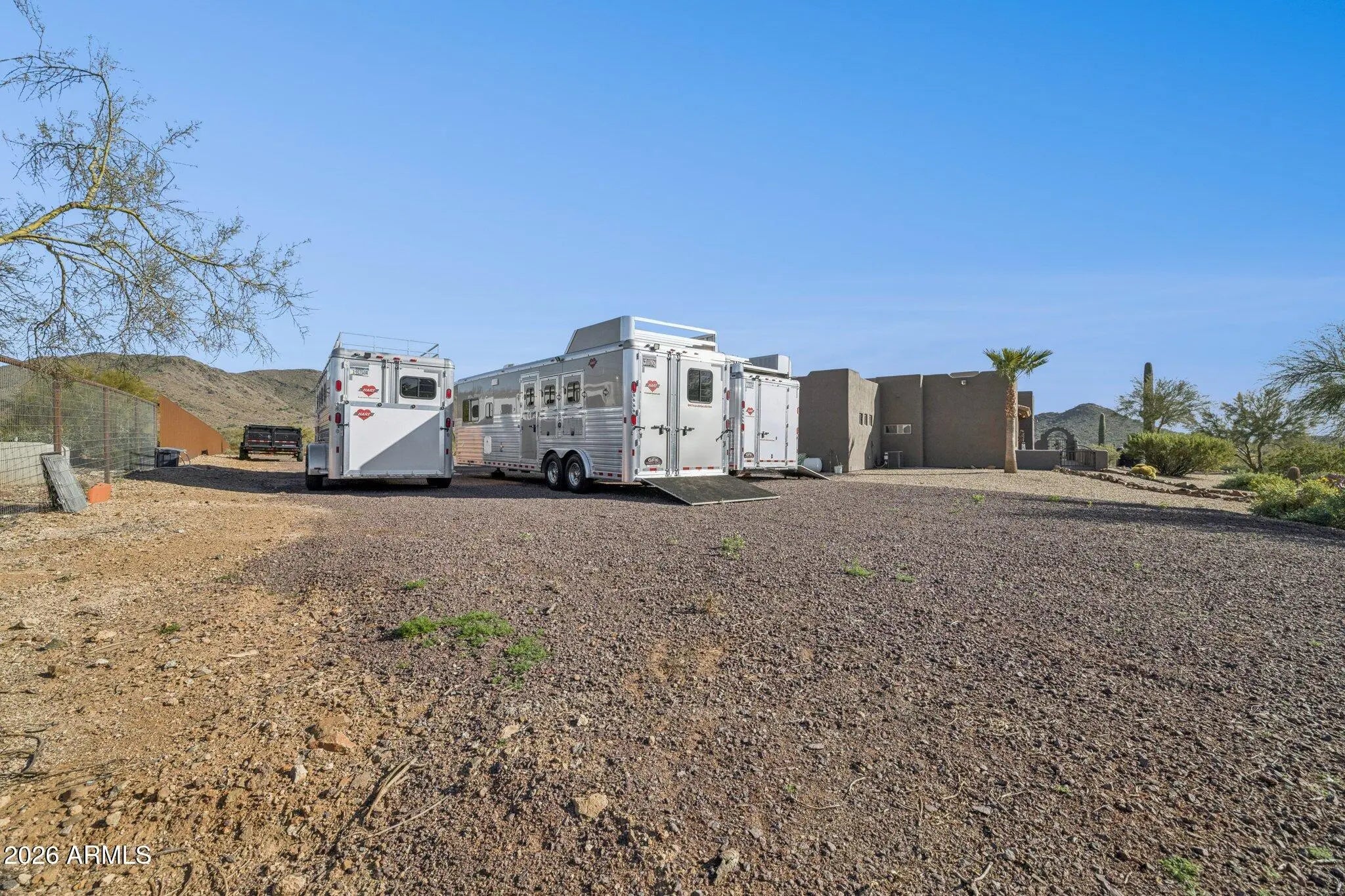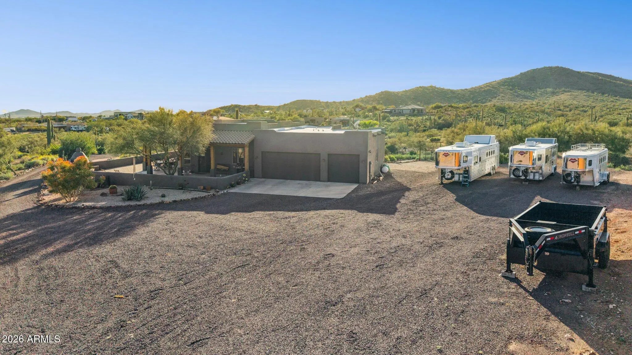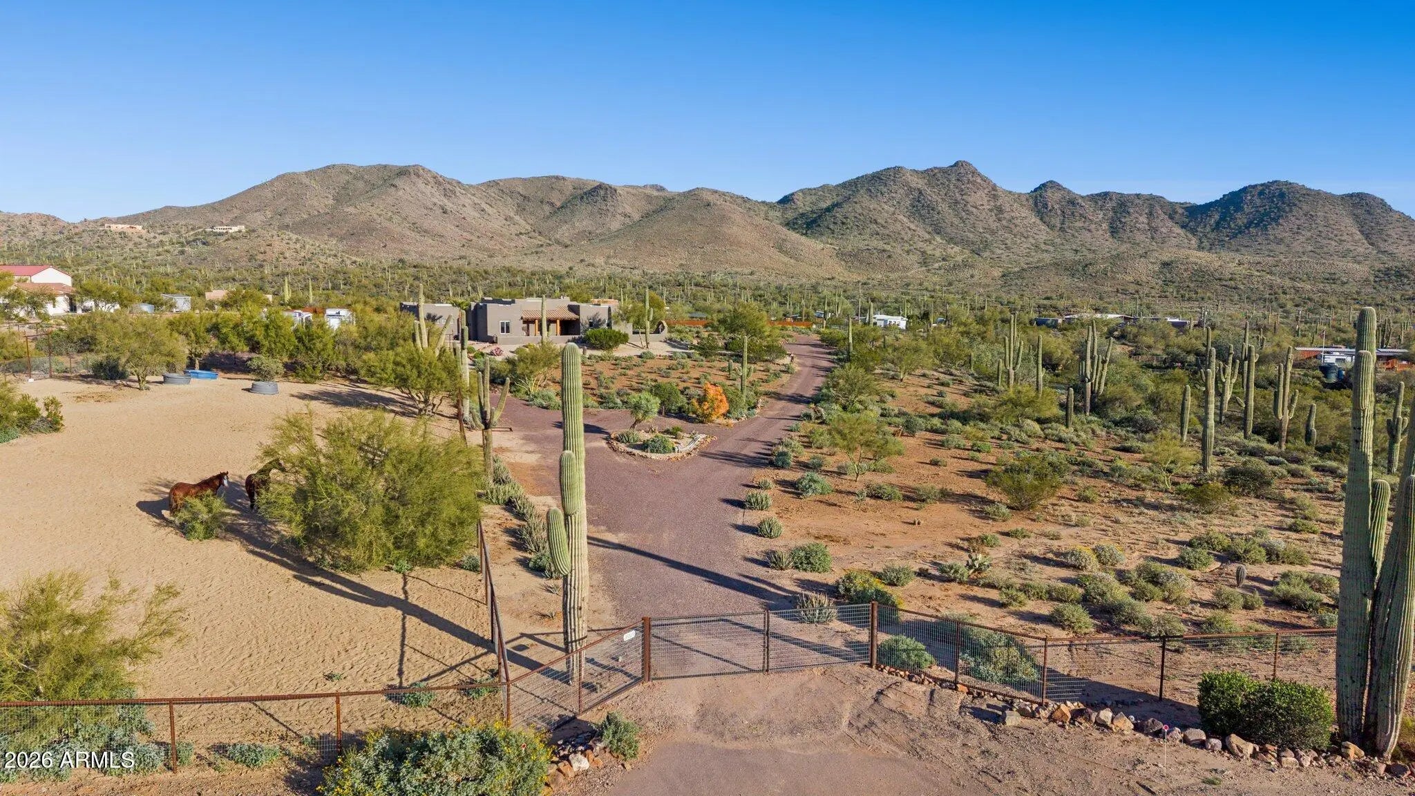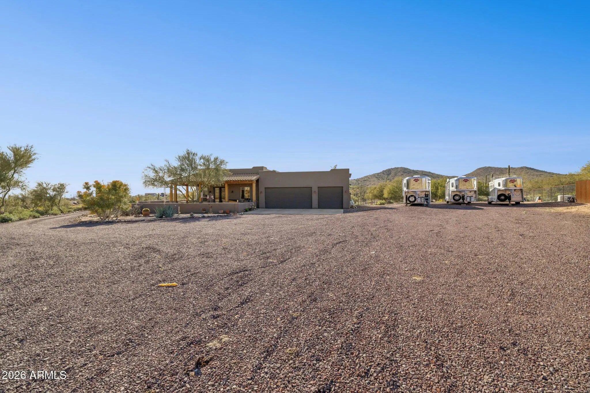 Custom Built Territorial home, Fantastic wrap around patio with panoramic views, features a large beehive outdoor fireplace for you to enjoy the beautiful desert evenings. Chefs kitchen, custom hickory cabinets, Granite tops, stainless appliances, gas range, walk-in pantry. All tile flooring. Oversized 3 car Garage that even will accommodate your Dually or 2 ! Huge 4.75 acre Lot,Room for a full size Roping/Reining/cutting arenas come build out your perfect equine facility. Fully fenced with a combination of privacy fence and 5ft top rail no climb horse fencing, large treed turnout. 50 amp RV Plug.Back of the property faces the mountains of the beautiful Cave Creek regional park for your hiking and riding pleasure. shared well agreement.