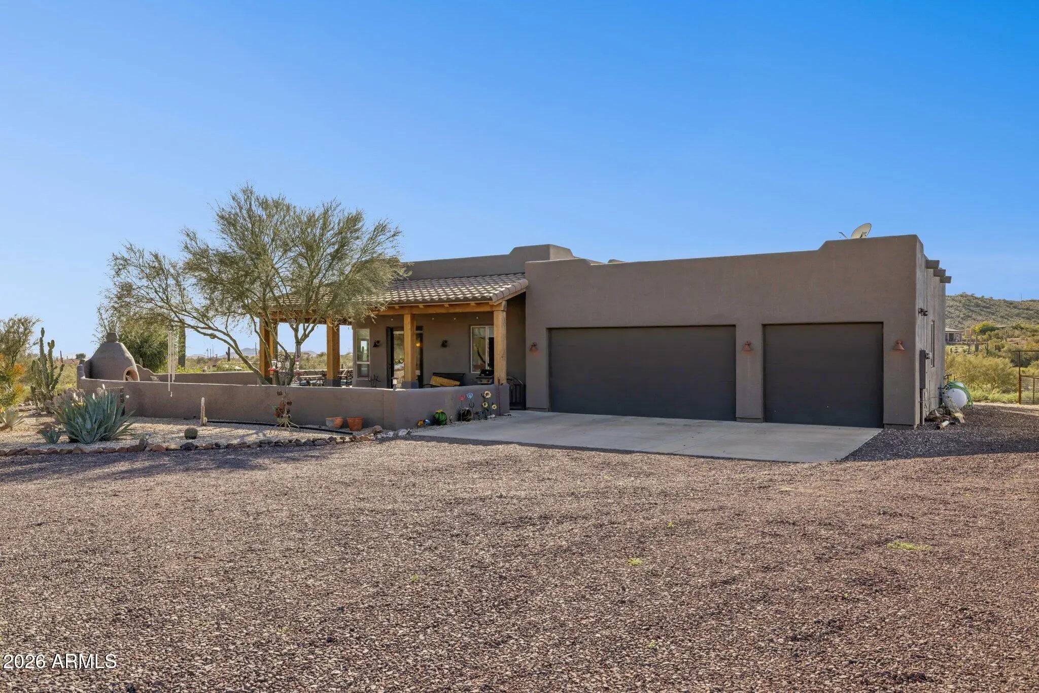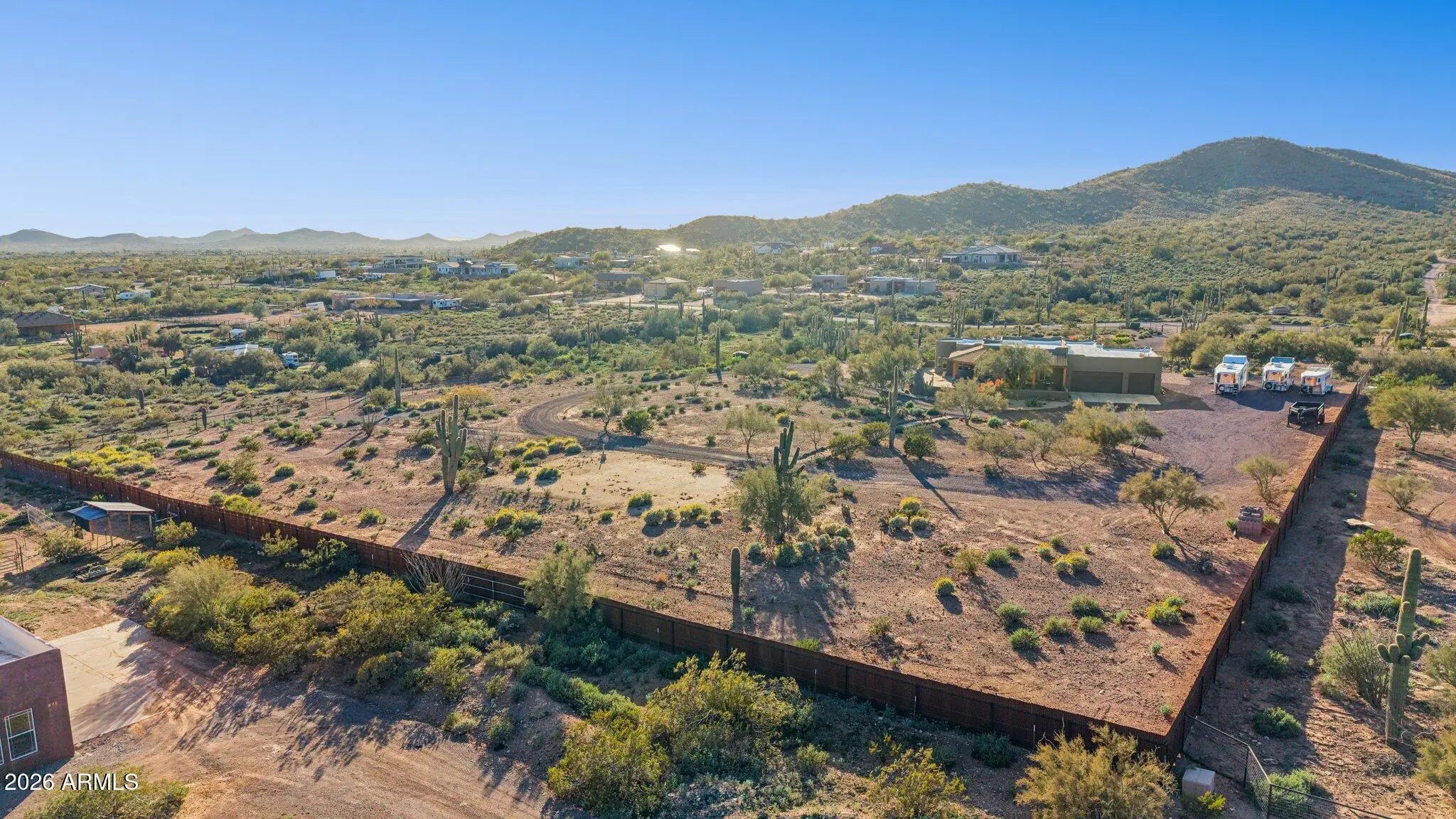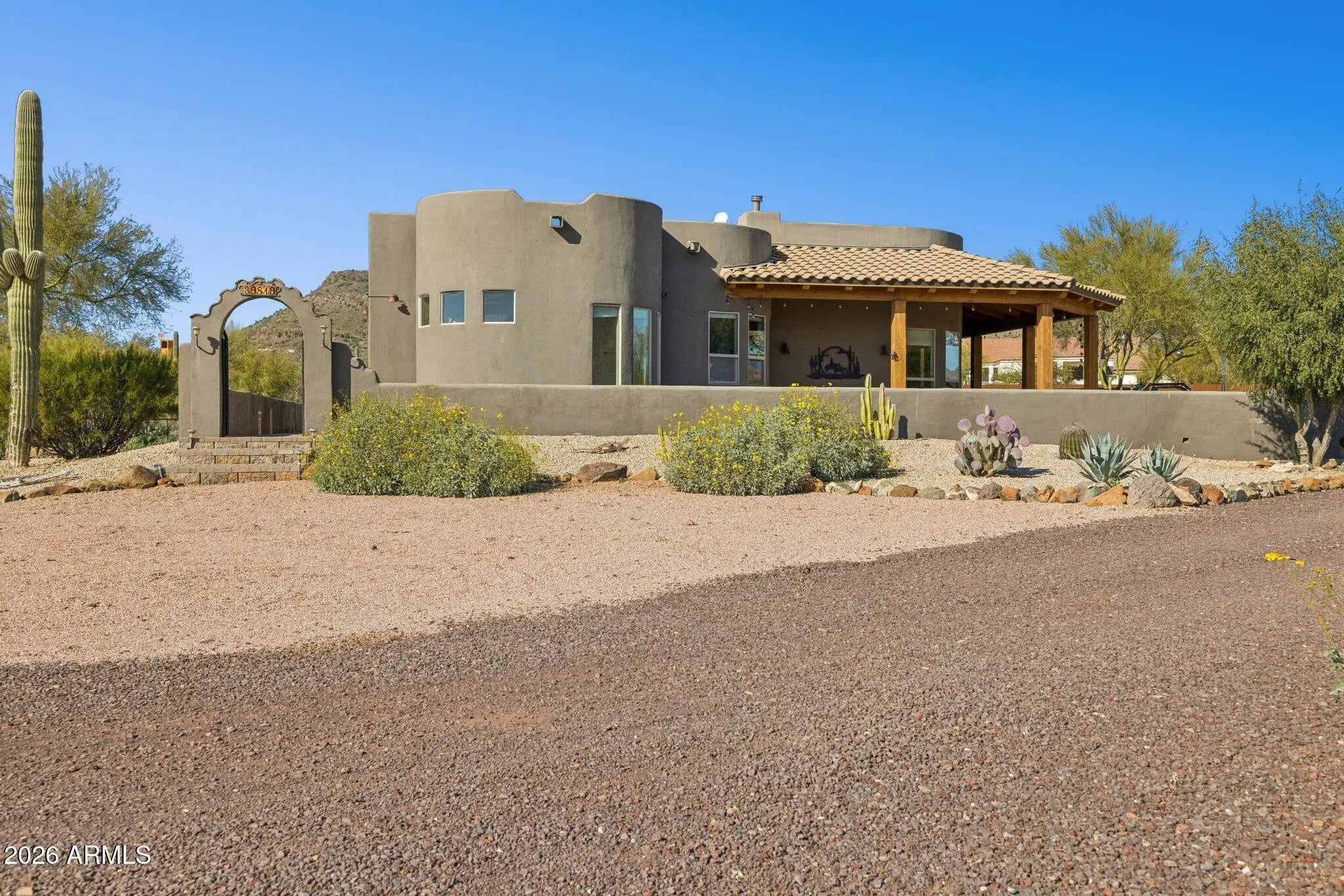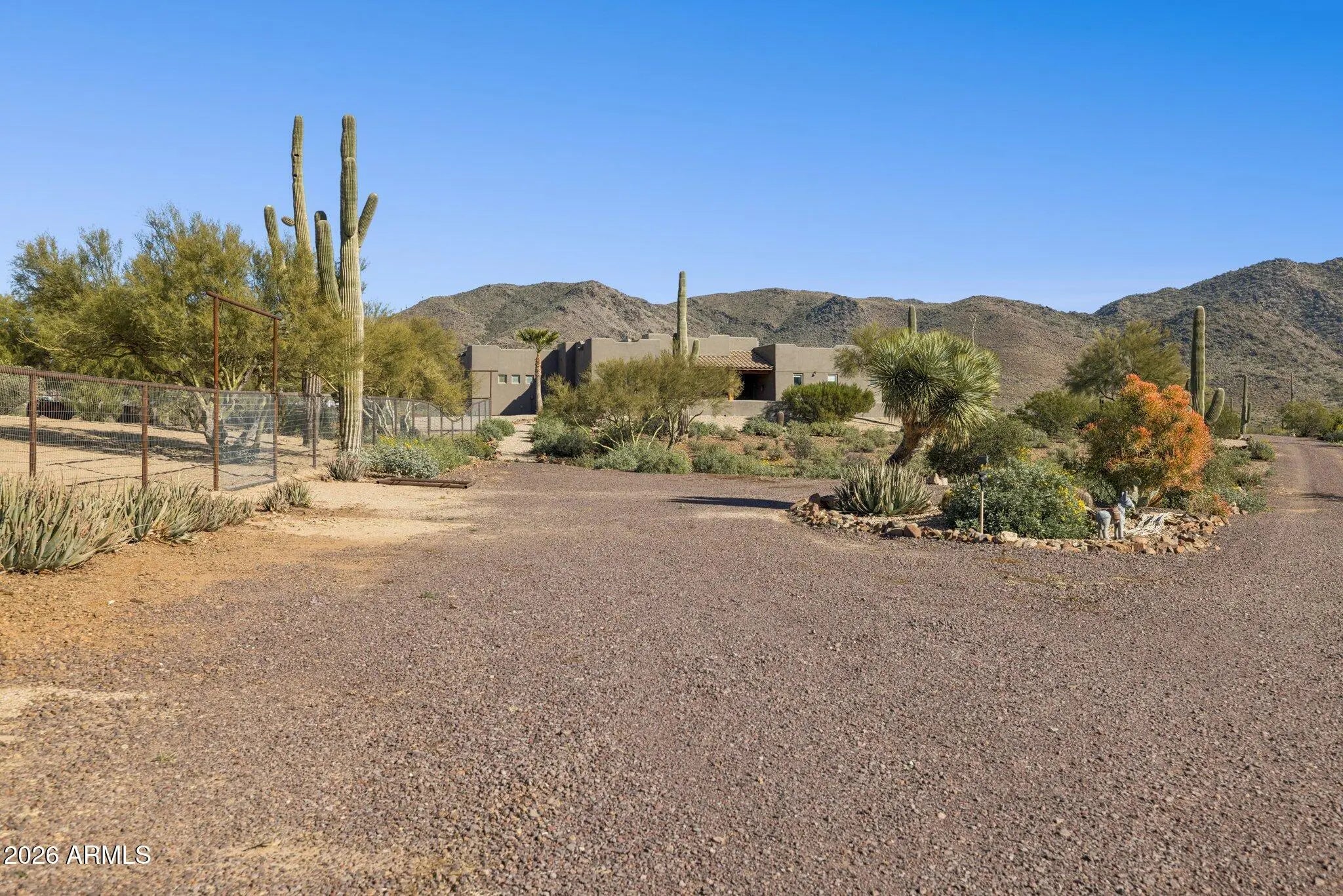 Custom Built Territorial home, Fantastic wrap around patio with panoramic views, features a large beehive outdoor fireplace for you to enjoy the beautiful desert evenings. Chefs kitchen, custom hickory cabinets, Granite tops, stainless appliances, gas range, walk-in pantry. All tile flooring. Oversized 3 car Garage that even will accommodate your Dually or 2 ! Huge 4.75 acre Lot,Room for a full size Roping/Reining/cutting arenas come build out your perfect equine facility. Fully fenced with a combination of privacy fence and 5ft top rail no climb horse fencing, large treed turnout. 50 amp RV Plug.Back of the property faces the mountains of the beautiful Cave Creek regional park for your hiking and riding pleasure. shared well agreement.