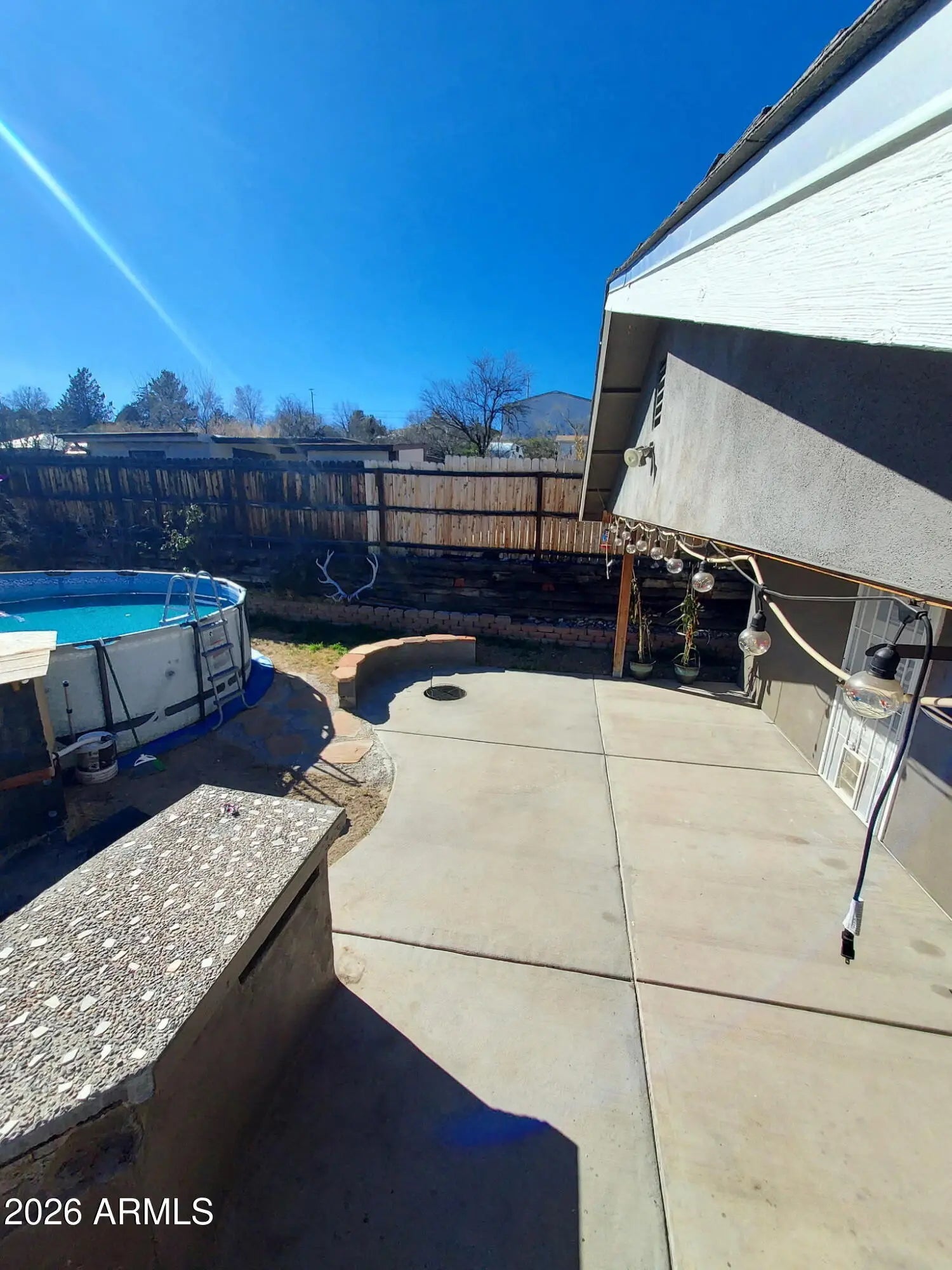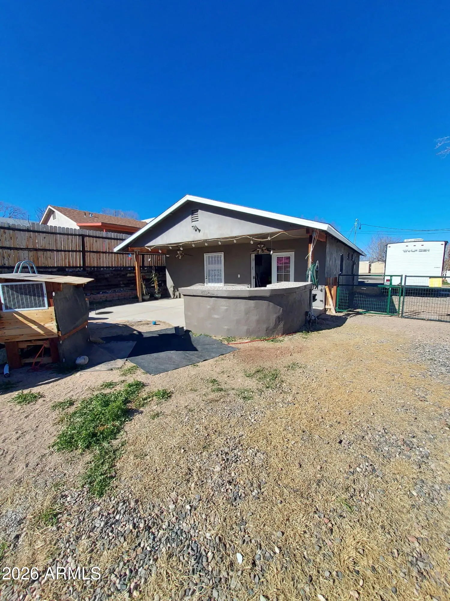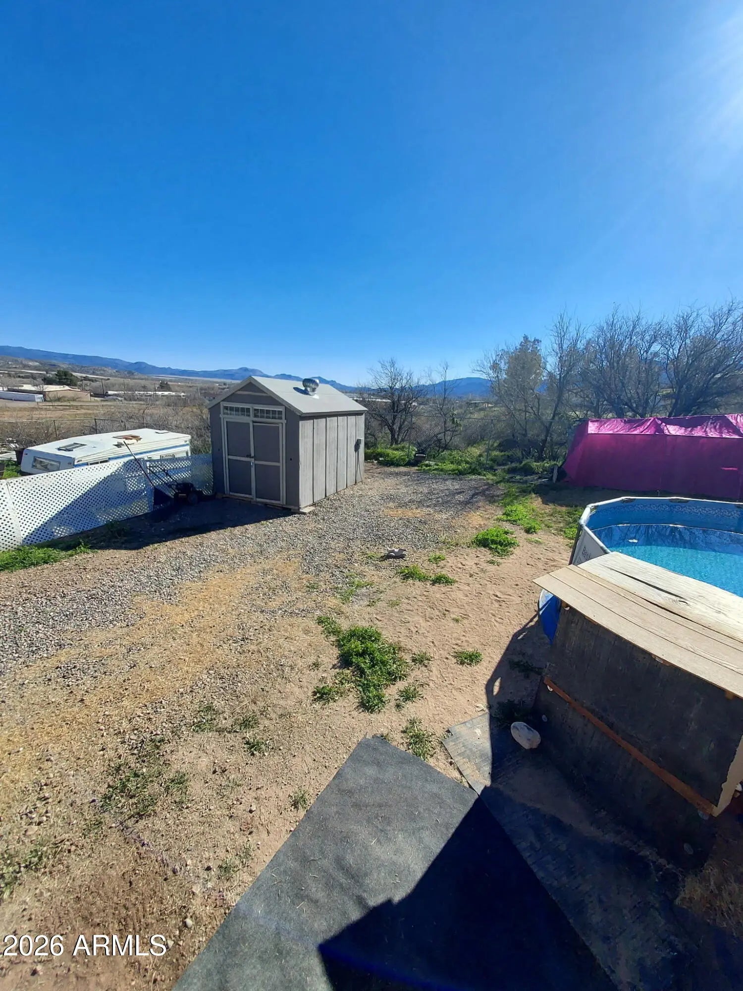 DISCOVER THIS INVITING, 3 BDRM, 2 FULL BATH single-family home! Close to town and shopping. All the BDRMS are generous, with the two larger ones having access to the backyard. The master (18x11.8 ft) has an adjoining bathroom, carpet, and French doors to the patio. The bathroom features a tile-and-stone rain shower. The third bedroom (18x12.3 ft) has a metal door and security gate. All appliances included: electric range, oven, dishwasher, refrigerator, and washer/dryer. The new 30-year composite roof and evaporator cooler were installed in June 2025. NO HOA! The yard is fully fenced, with a wooden picket fence in front and cyclone chain link in back, with gate access from the driveway. There's a shed/shop (8x10), an above-ground 18ft pool with upgraded filtration and motor on a timer. There is a 100% full RV hookup; water, sewer, electric, everything there for an RV in the backyard. Along the back fence, a raised garden grows roses, pomegranates, ruby red grapefruit, lemon, and two orange trees, all fruit-bearing. The backyard is ideal for entertaining, with wiring and water for grills and smokers. The covered concrete patio features an in-ground fire pit, built-in seating, and an outdoor counter. Enjoy a relaxed lifestyle in scenic Camp Verde, gateway to the Verde Valley's Wine Country.