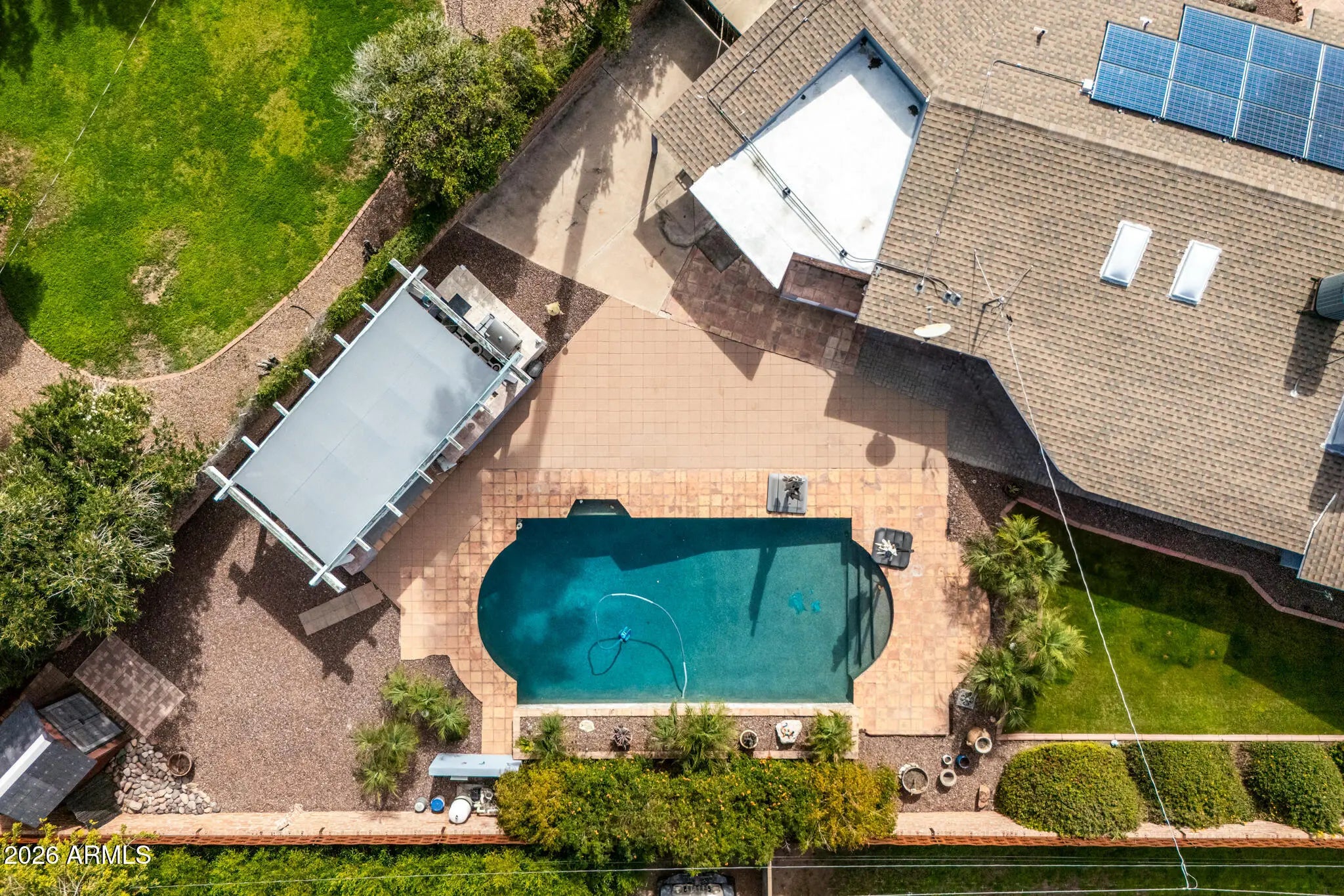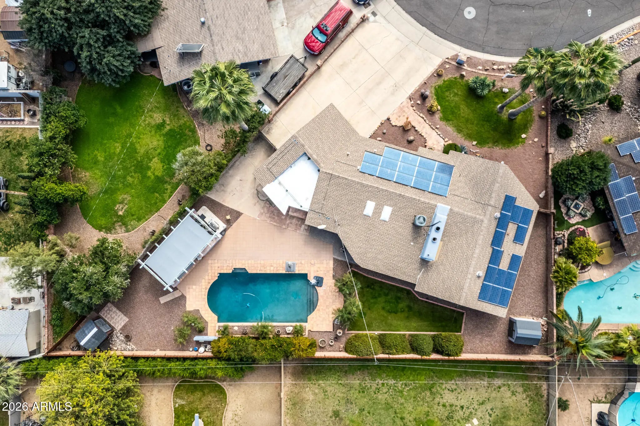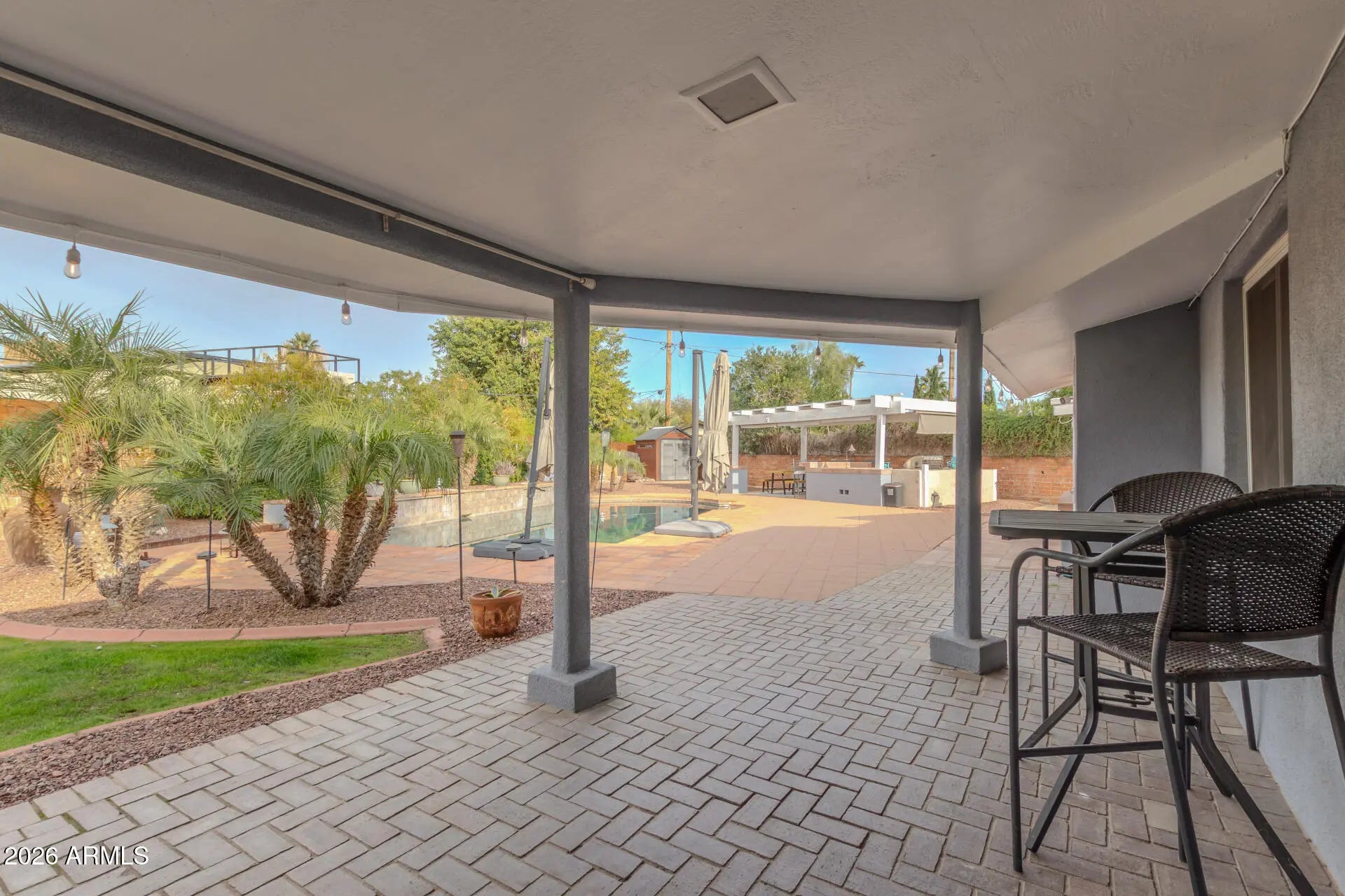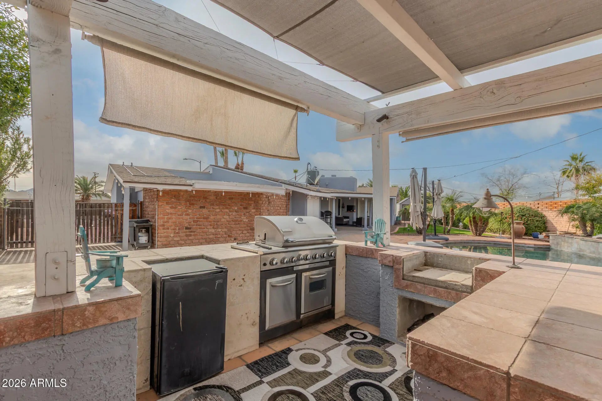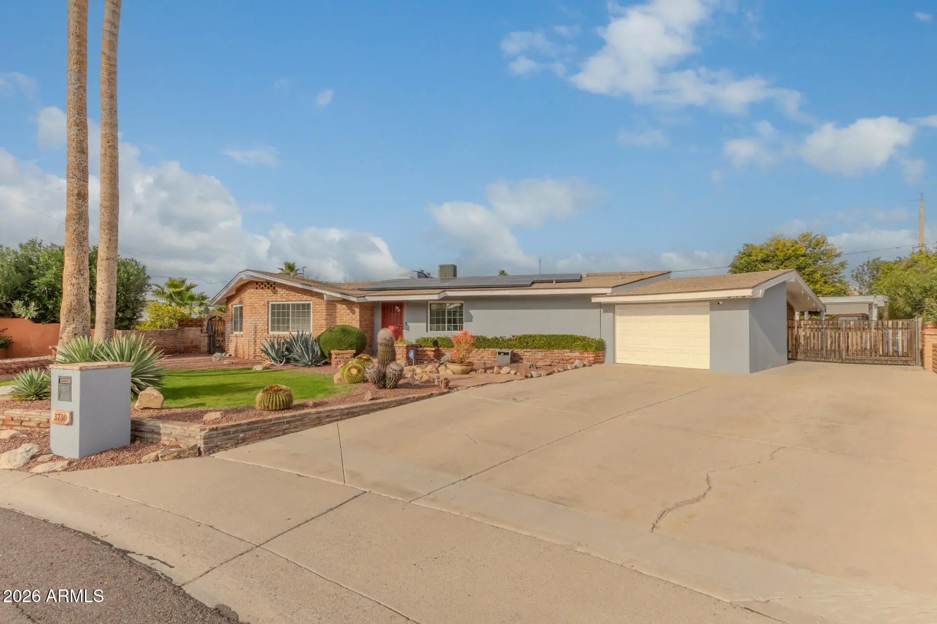 This beautifully updated ranch-style mid-century home offers the perfect blend of classic design and modern comfort. Featuring 3 bedrooms and 2 bathrooms, the home showcases fresh interior and exterior paint with exposed brick that enhances its clean lines and timeless appeal. Situated on one of the largest lots in the neighborhood, the property truly shines outdoors with a huge, resort-style backyard—ideal for entertaining or relaxing—complete with a sparkling pool, covered outdoor bbq, and plenty of space to unwind. Solar panels make this home energy efficient and help with savings, especially in the summer months. With its generous lot size, inviting layout, and stylish updates, this home delivers a rare opportunity for both indoor comfort and exceptional outdoor living. No HOA.
