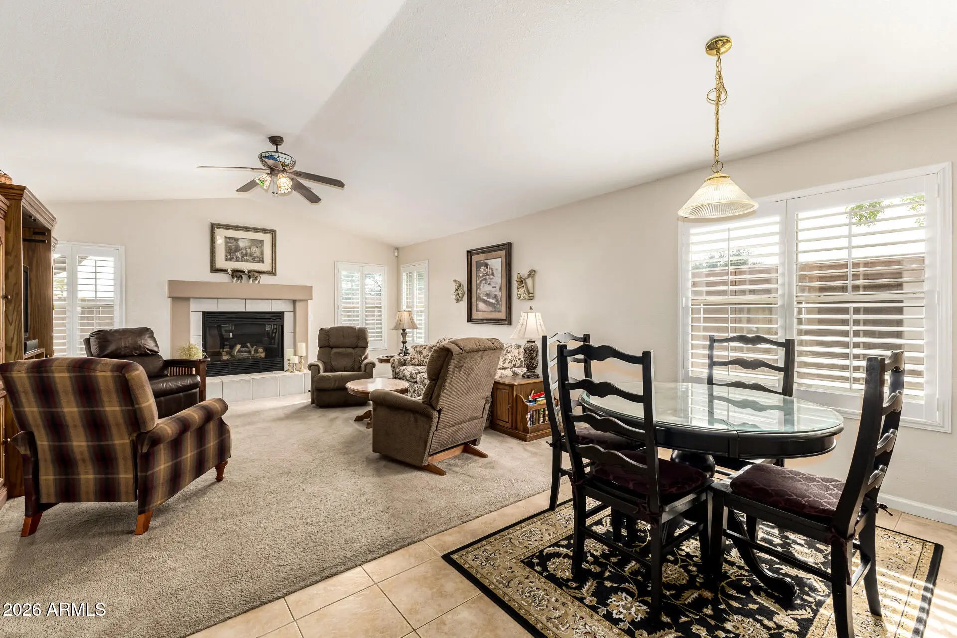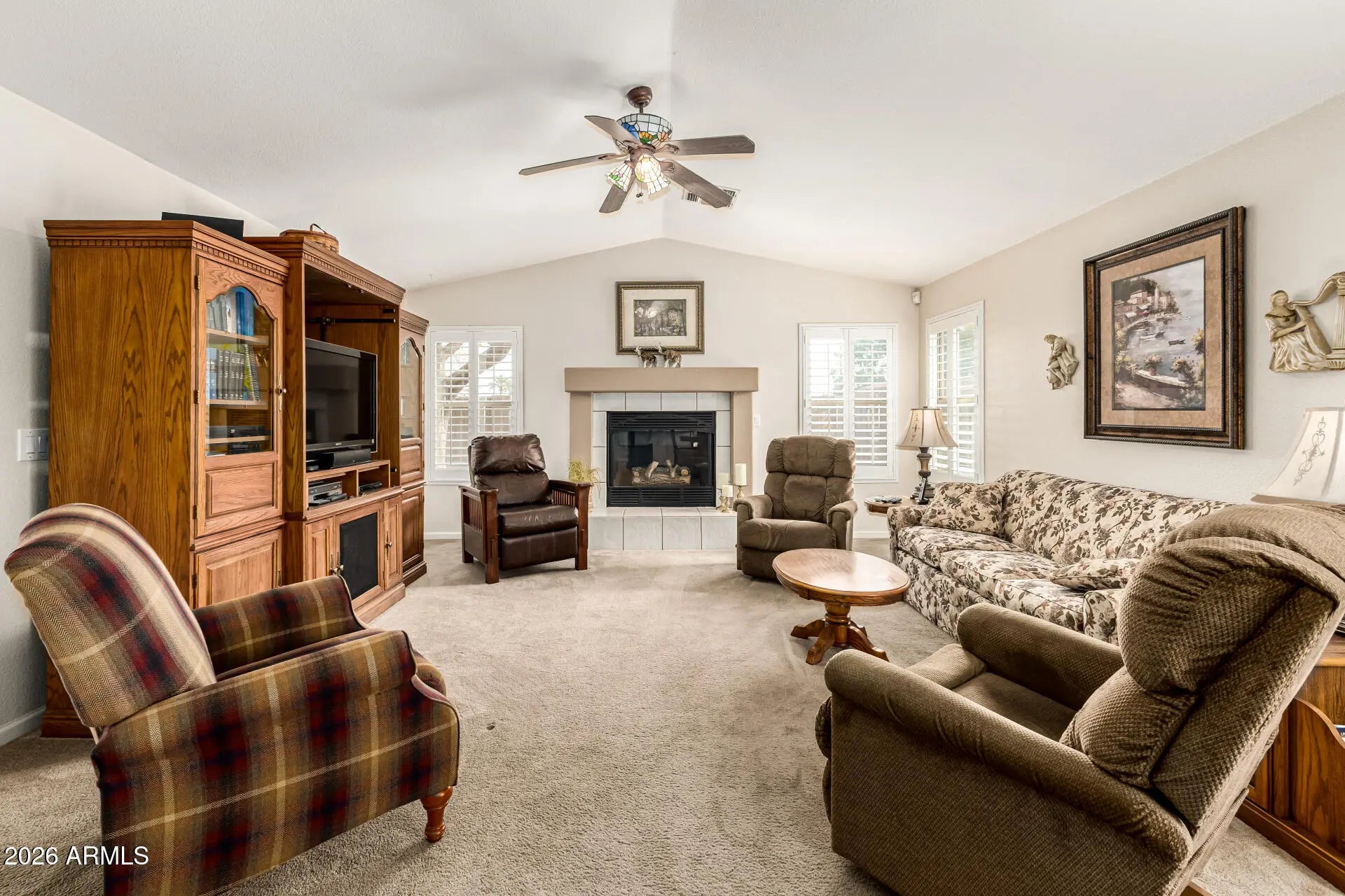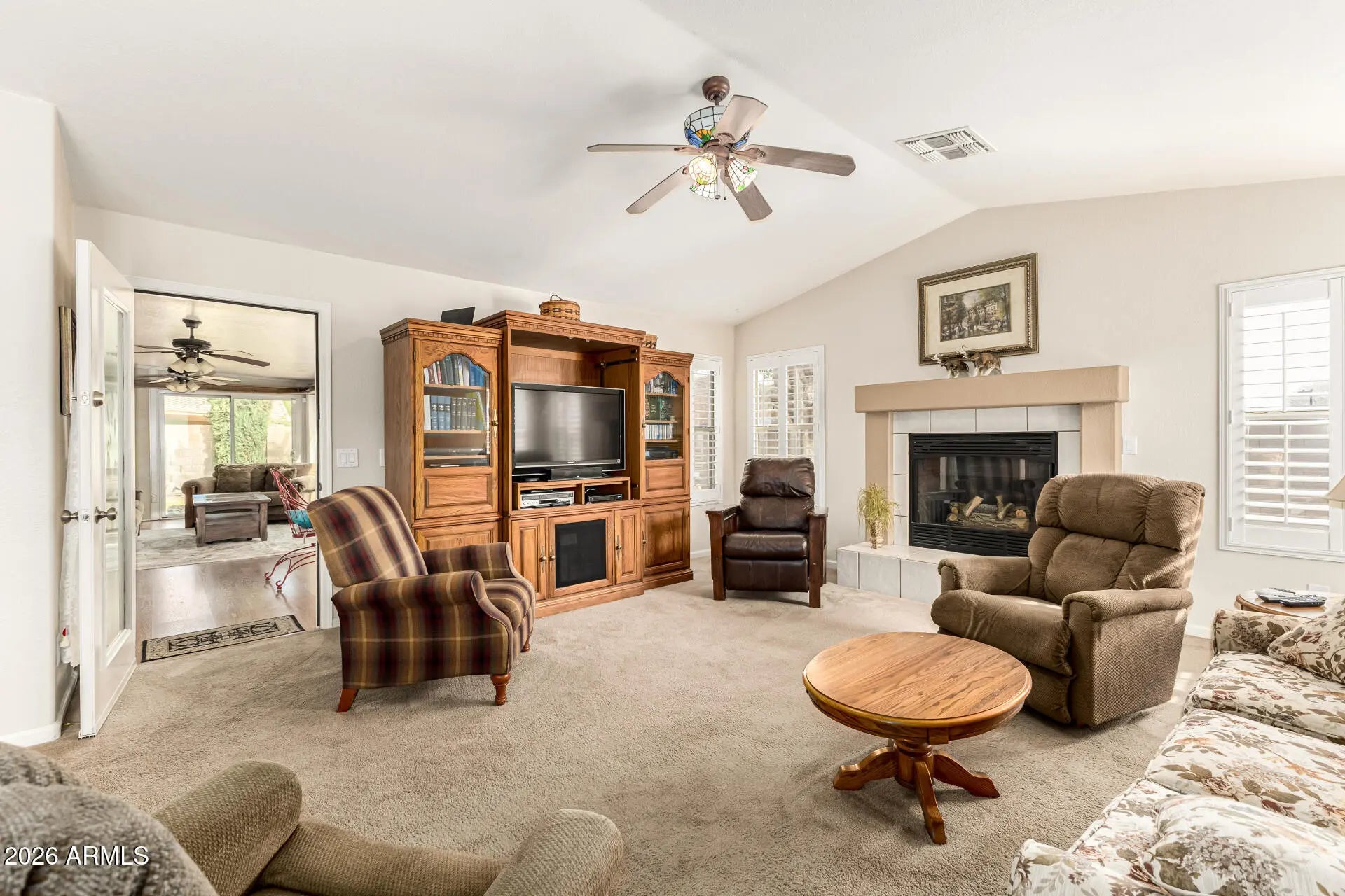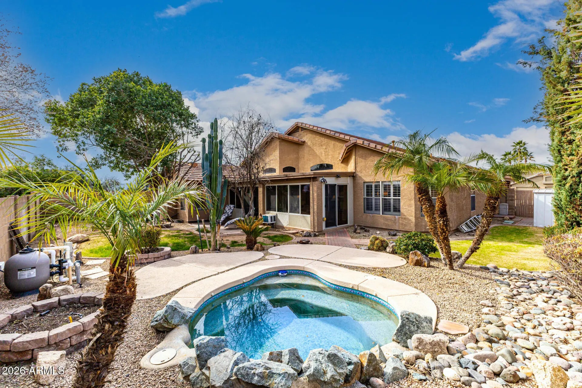 The search is finally over! This delightful corner lot property welcomes you with a 3-car garage and a well-maintained desert landscape for excellent curb appeal. You'll be pleased by the inviting living/dining room with vaulted ceilings, blinds, and soft carpeting for added comfort. Gather loved ones in the family room, which includes a cozy fireplace. The gourmet kitchen comes with granite counters, wood cabinets, contemporary track lighting, a tile backsplash, built-in appliances, a pantry, and an island with a breakfast bar. Double doors lead to a versatile den ideal for an office or a quiet study. Spend peaceful afternoons in the bright sunroom, perfect for enjoying the warm Arizona weather year-round. Pet and smoke free home! The tranquil primary bedroom features classic plantation shutters, an ensuite with double sinks, and a walk-in closet. Unwind at the end of a long day in the lovely backyard, showcasing an open patio, a storage shed, and a refreshing pool. Don't miss out on this fantastic opportunity!