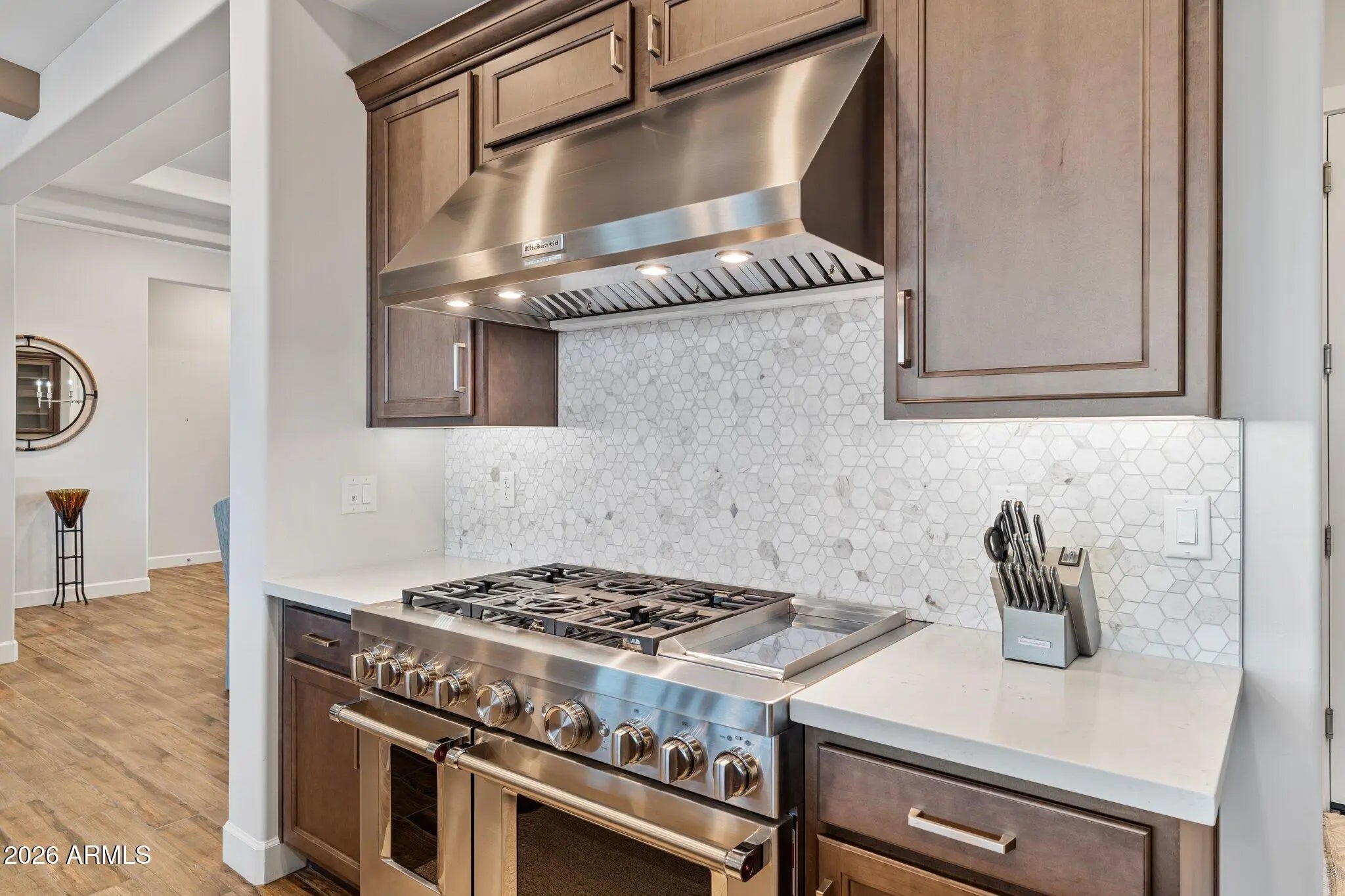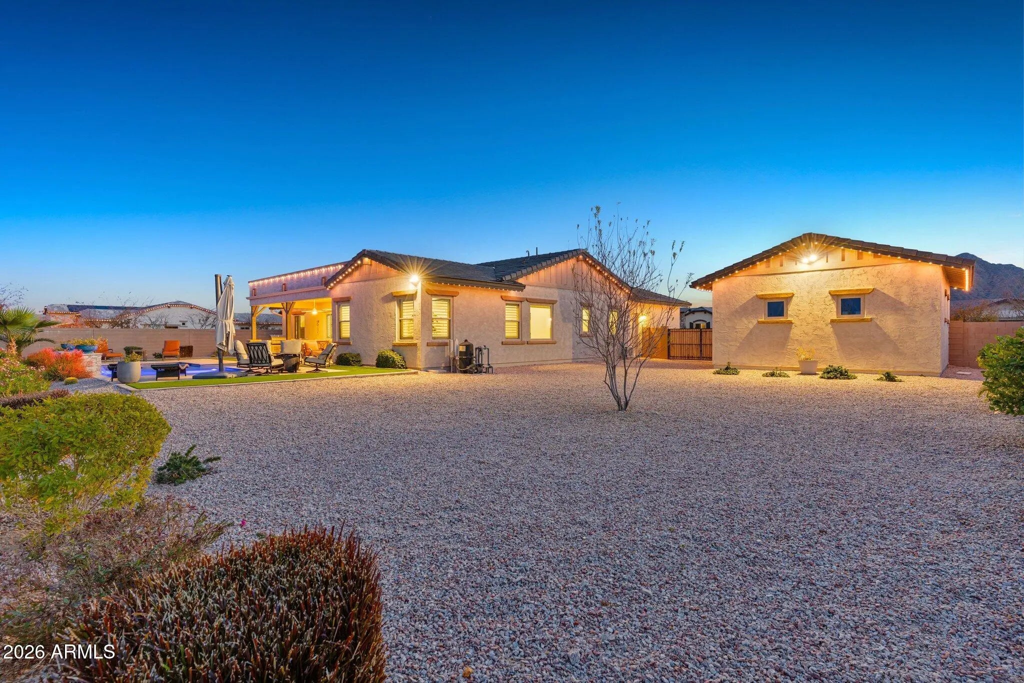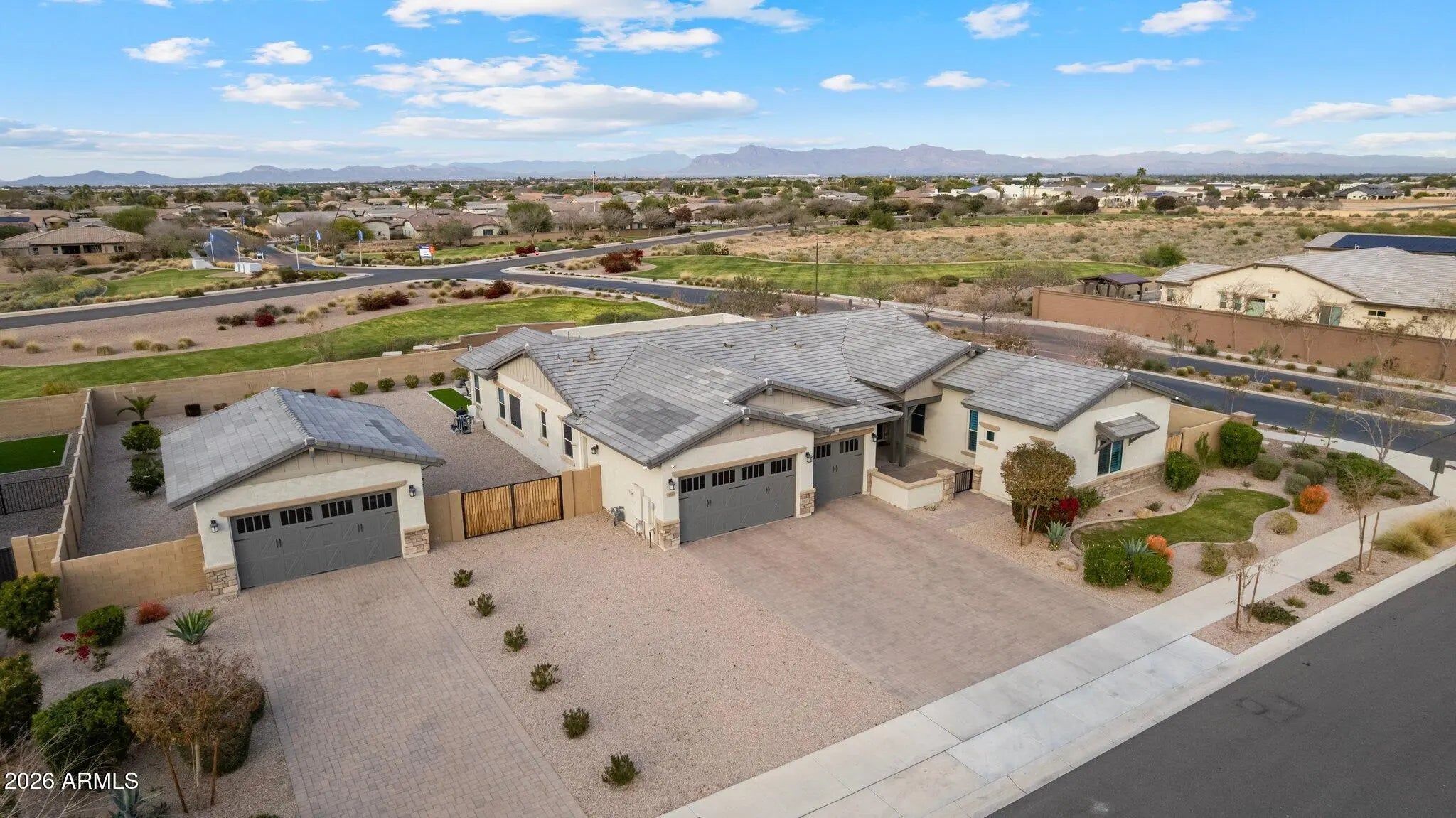 Designed for those who value refined living and intentional design, this exceptional Queen Creek residence is distinguished by elevated craftsmanship and unobstructed Superstition Mountain views from a premium oversized lot. The single-level layout is anchored by a gourmet kitchen featuring a commercial-style 48'' KitchenAid gas range and built-in 42'' KitchenAid refrigerator ideal for entertaining. A private attached casita with kitchenette, living area, bedroom, bath, and separate interior and exterior access adds remarkable flexibility. Your backyard paradise features a resort-style pool with waterfall feature, covered patio, and even room to build your own private pickleball court. A three-car attached garage is complemented by a detached two car garage with room for all of your toys!