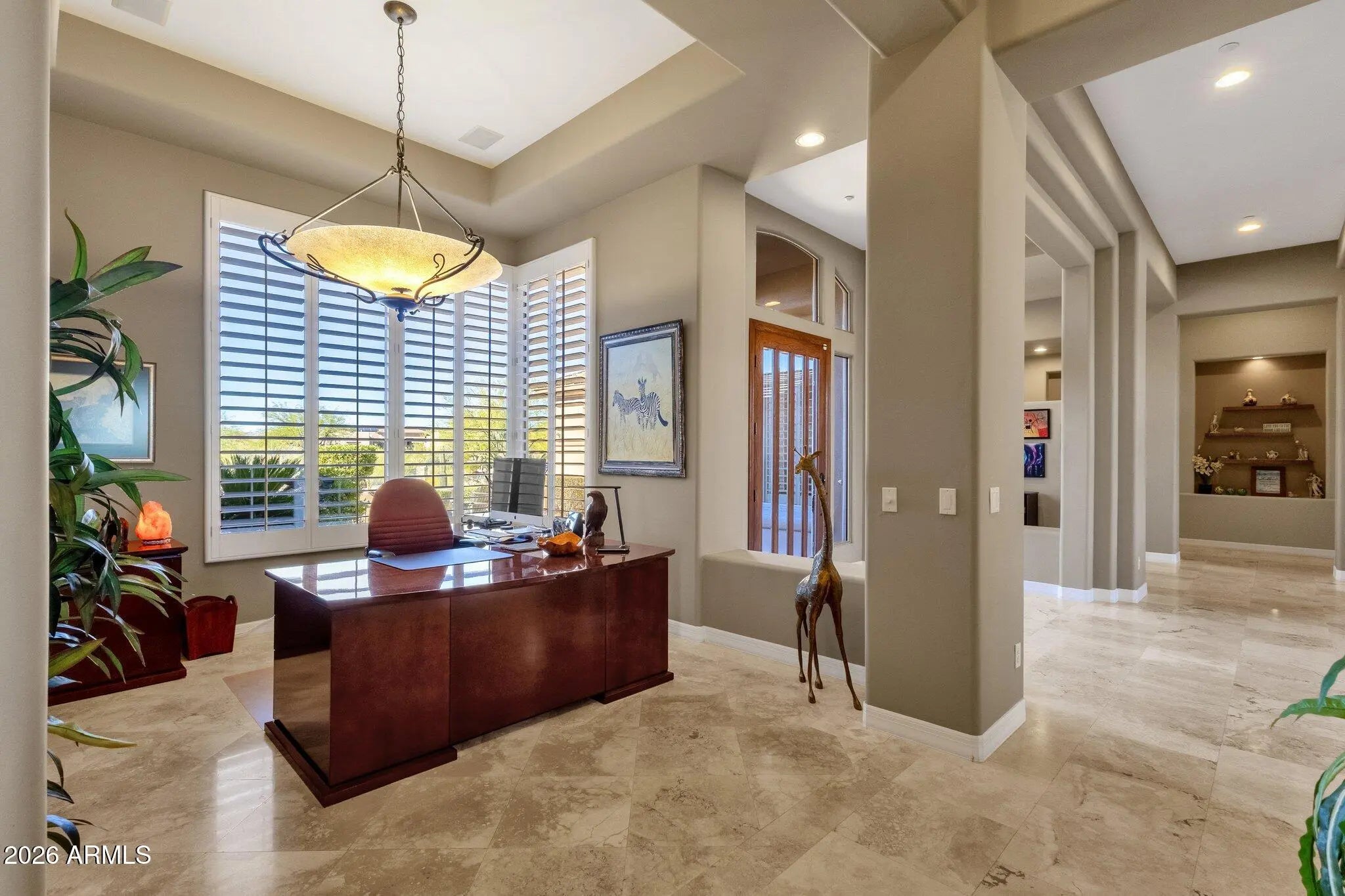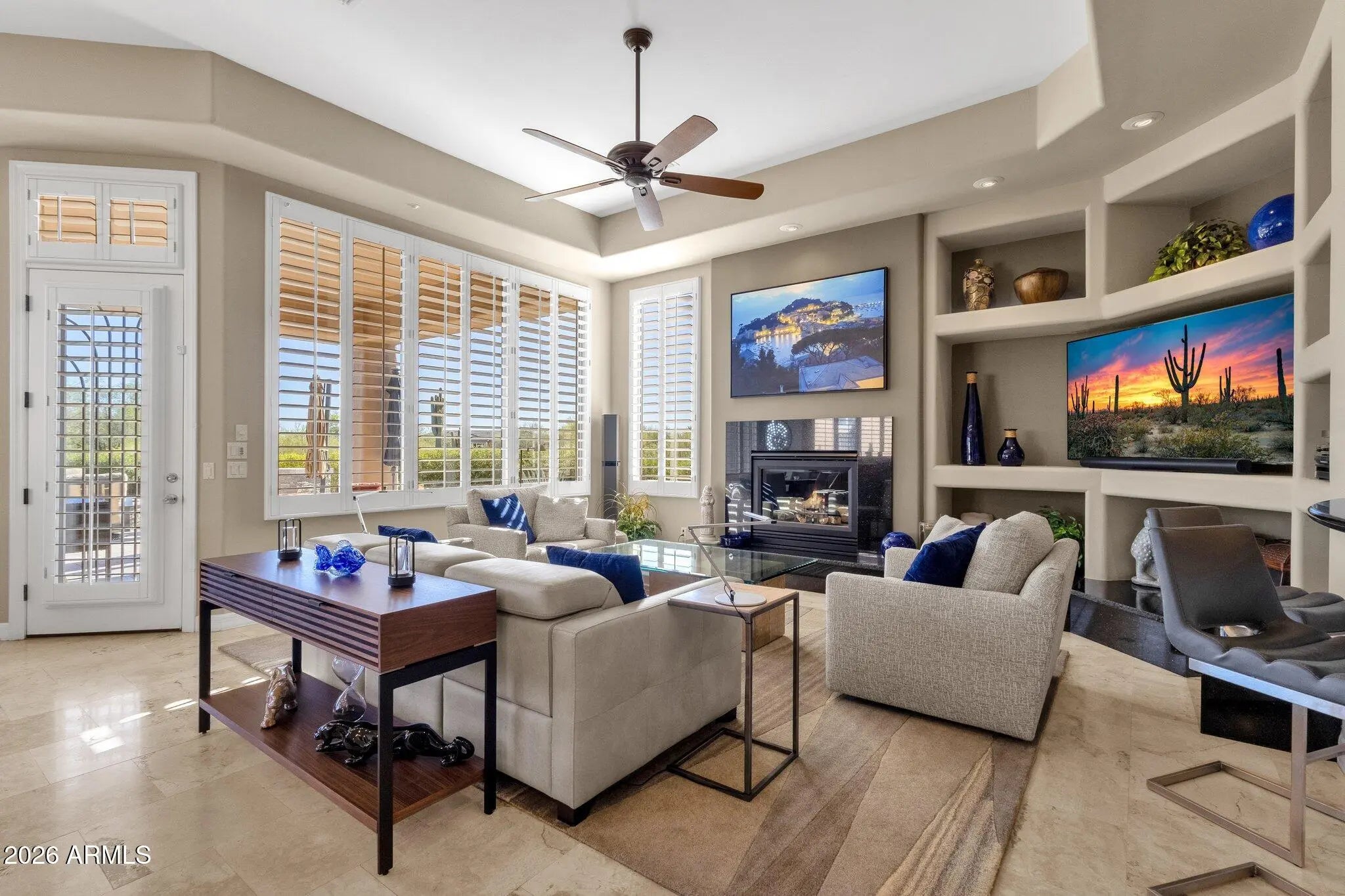 MTN VIEWS, PRIVACY, MOVE-IN-READY, NORTH SCOTTSDALE - nestled within an exclusive gated community. The home features travertine flooring, 12-ft ceilings, 8-ft solid-core doors and extra-wide doorways and hallways. The expansive primary suite is a true retreat complete with sitting area, a spa-inspired bath offering dual water closets, dual-head shower, oversized soaking tub and a large walk-in closet. Two separate offices (or formal dining) with clear views of Black Mtn and Desert Mtn - ideal for work-from-home flexibility. Gourmet kitchen features an over-sized Taj-Mahal Quartzite island, new 48'' Sub-Zero refrig, 5-burner gas stove and walk-in pantry. Great room w/gas fireplace & full bar, wine refrig, perfect for entertaining. Home is on ¾+ acre lot, surrounded by natural desert. Major updates include HVAC, roof and window glass and several SMART home technology additions. Owned security system complete with several outside cameras with remote video monitoring and door sensors make this an easy lock-and-leave home. Backyard renovation included adding pool w/stacked stone surround, natural gas fire pit, TWIN EAGLE built-in BBQ, travertine pavers and landscaping. The pebble-tec, self-cleaning, heated pool includes two water features and a Baja shelf. Conveniently located within gates of the Verdante community (38 homes) between Pima Rd. & Scottsdale Rd. Minutes to World-Class Golf Courses (walking distance to The Boulders), Upscale Shopping, Fine Dining and the Vibrant Western Towns of Cave Creek & Carefree. You have MANY choices for biking & hiking with beautiful mountains and trails nearby. Quick 35 minute ride to Phoenix Sky Harbor International airport. For fishing and boating enthusiasts, the home is 30 minutes to Bartlett Lake and 40 minutes to Lake Pleasant. Meticulously maintained home. MUST SEE!!