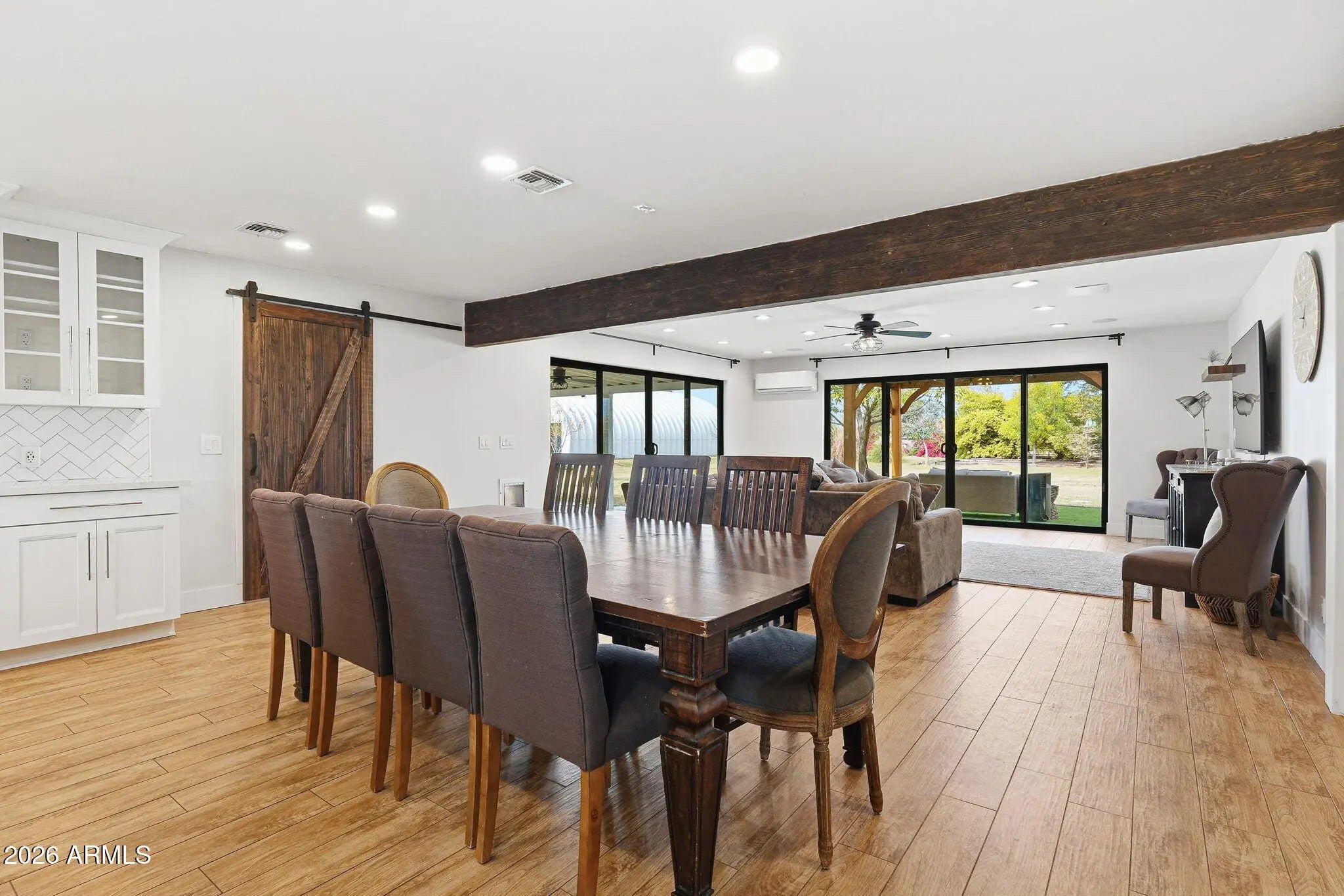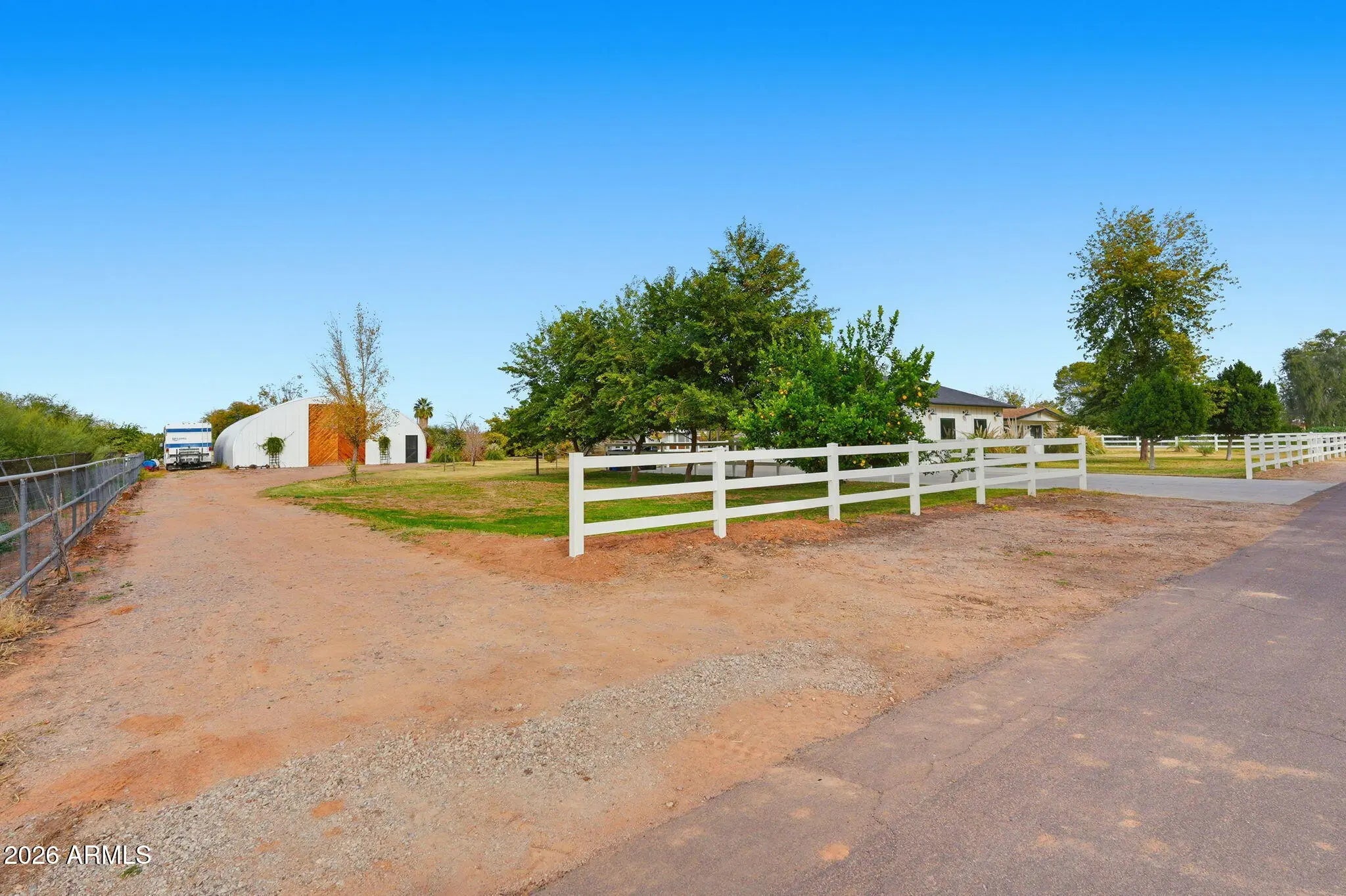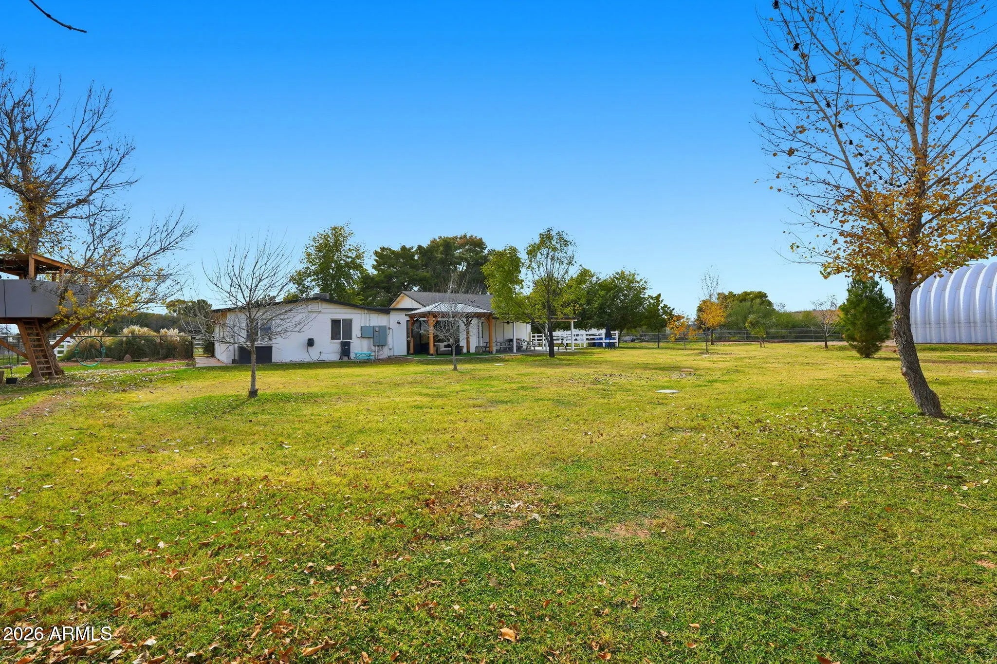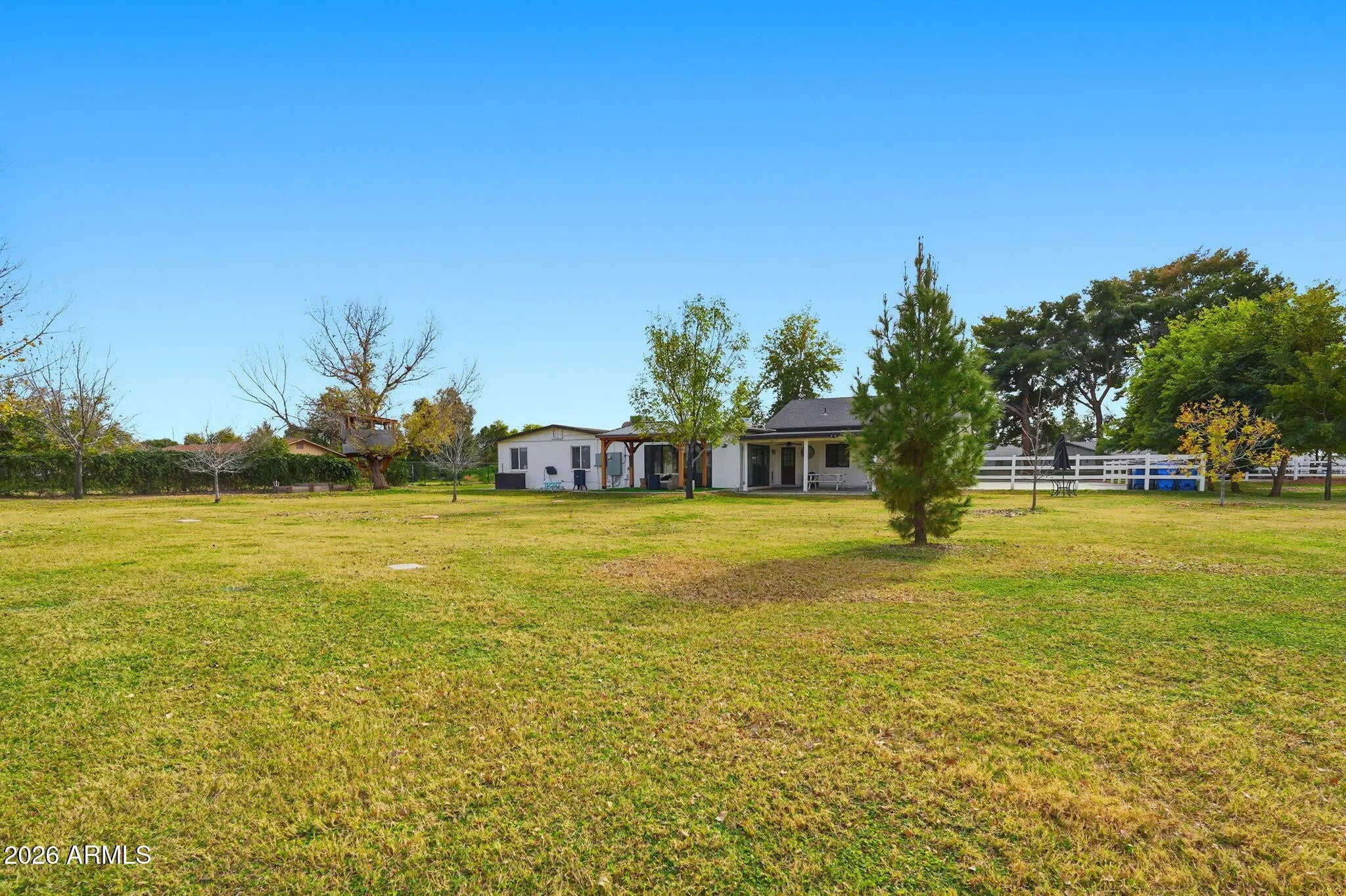 Rare flooding irrigated acre property in the heart of Gilbert with no HOA, tucked deep into a quiet neighborhood near the Riparian Preserve and canal paths with bike access toward downtown Gilbert. The home features a remodeled kitchen with KitchenAid appliances, large island with electrical, soft close cabinetry, and walk in pantry. The detached RV garage and shop is approximately 60x40, fully spray foam insulated with dual AC units and extensive electrical including multiple 220V outlets, creating a true year round climate controlled space. Four car attached garage, RV hookups, solar ready 400 amp panel, horse stalls, tack room with power, flood irrigation, mature shade trees, and a custom tree house complete this rare and versatile property.
