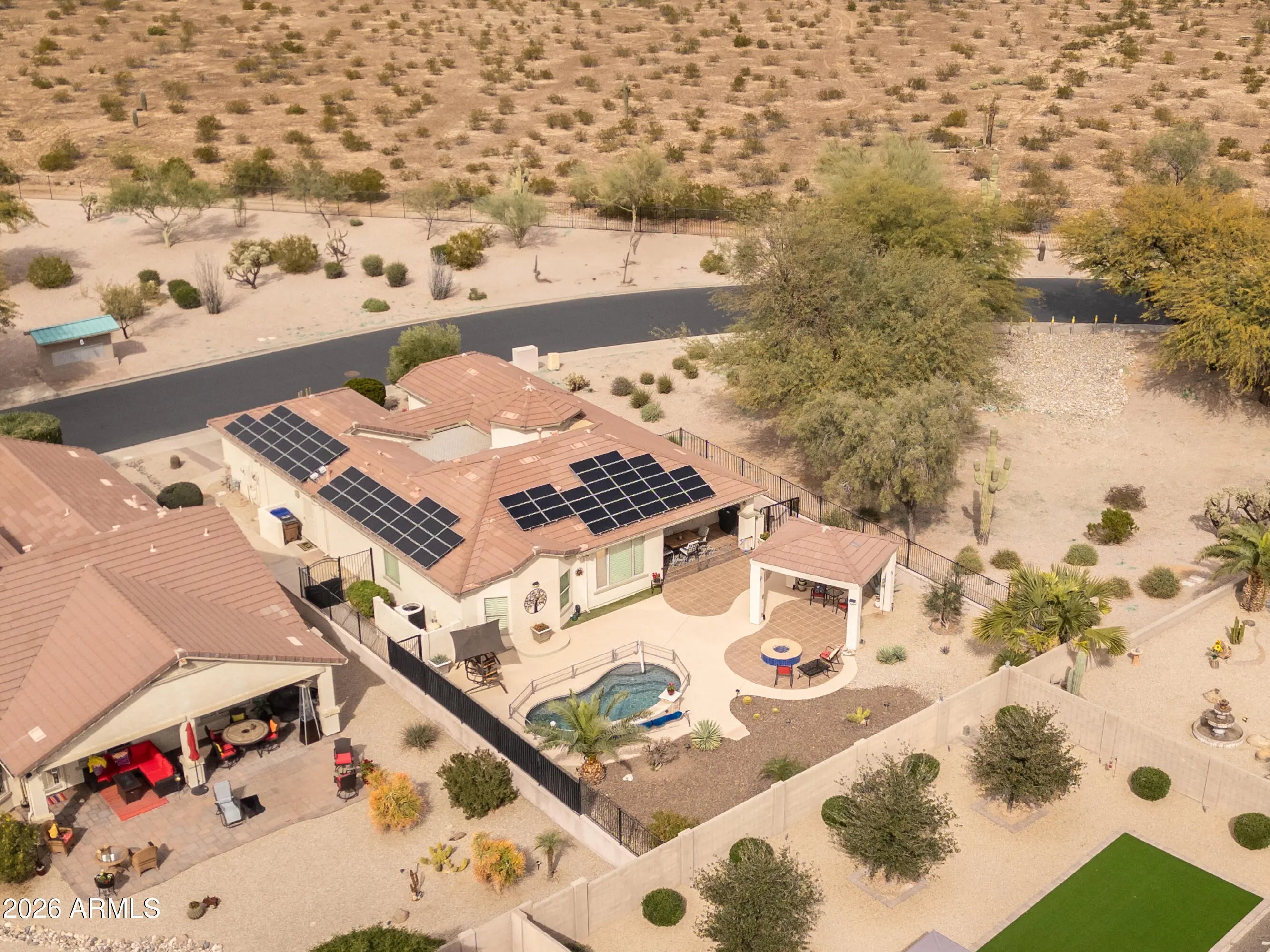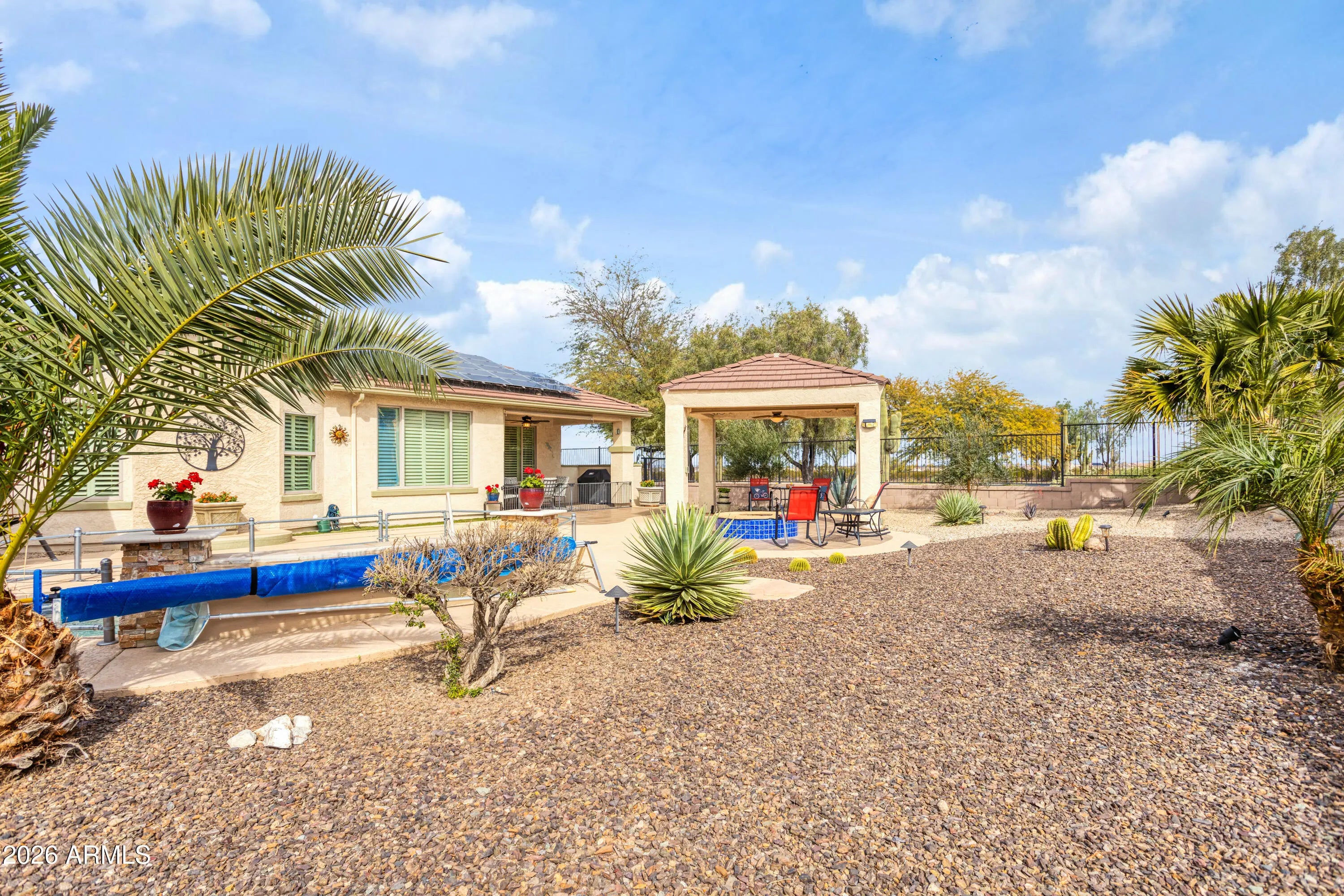 Look no further. This fully furnished home located in the active living gated community of Solera with all of its amenities it has to offer. Situated on a corner lot with 2 Bedrooms, 2 Baths, a Den and a covered front courtyard. Upgraded Kitchen with granite counters, backsplash, SS appliances, RO system, water softener, cabinet lighting and walk in pantry. With upgraded flooring in all the right places and fresh neutral paint tones throughout. Spacious primary Bedroom, upgraded Bathroom with walk in shower, double sinks, double mirrors and countertops. Entertain in the large backyard oasis while relaxing under the ramada, sitting around the gas firepit or swimming in the heated pool. Home has solar power that is completely paid for! 2.5 car extended length garage with storage cabinets.