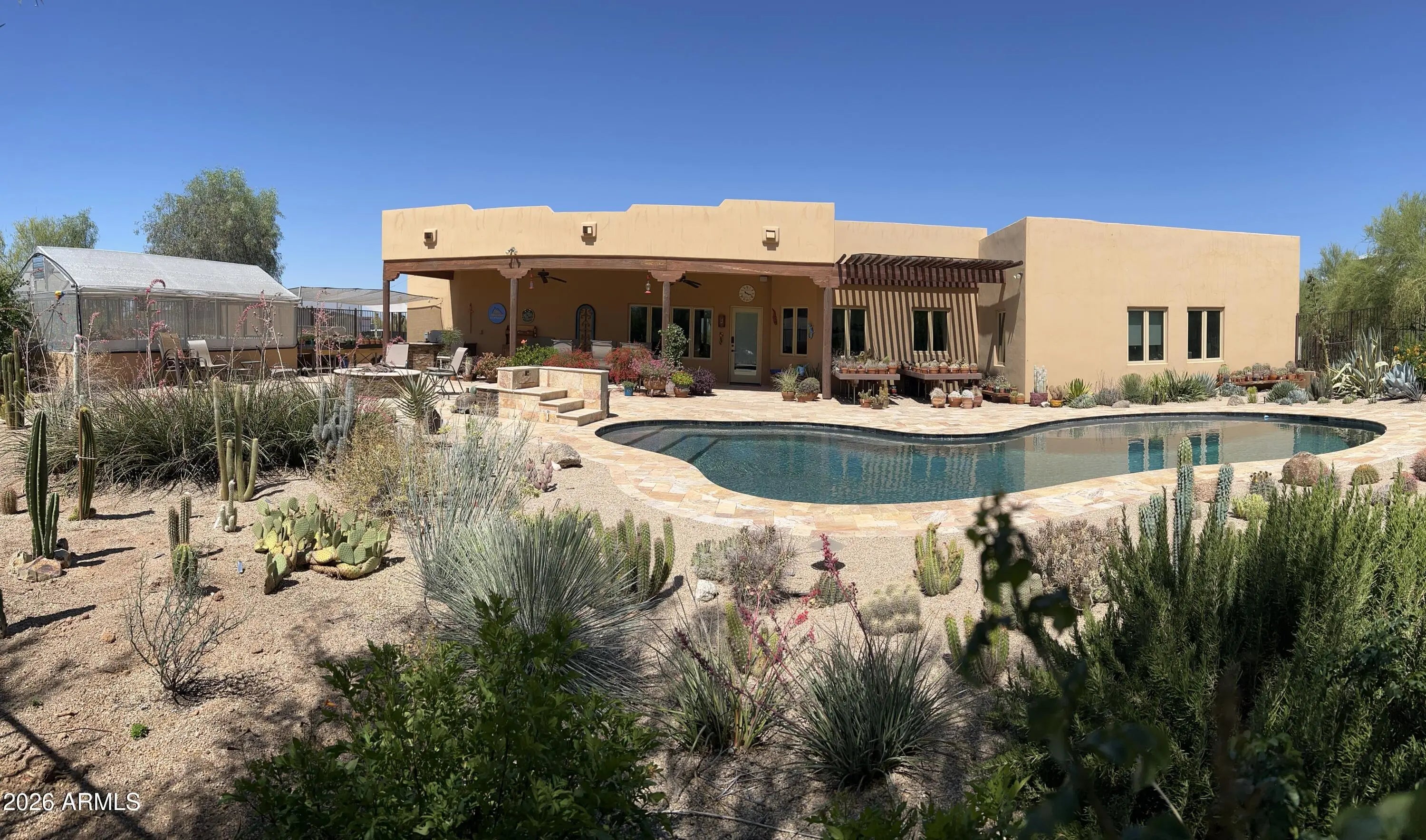 Tucked into the natural beauty of Cave Creek, this thoughtfully custom-designed single-level home sits on 1+ acre with full ADA compliance and no HOA. Custom 42'' wide doorways and an easy-flow, one-level floor plan provide seamless accessibility & everyday comfort. Pella casement windows are featured throughout. Open living areas connect effortlessly to the outdoors, offering covered front and back patios with travertine, an outdoor kitchen, LP gas firepit, and a private pool--perfect for relaxing or entertaining. A dedicated greenhouse adds a unique touch for gardening or sustainable living. Enjoy a peaceful desert setting with convenient access to local amenities, dining, and outdoor recreation. Additional highlights include a 3-car climate-controlled garage, 220-volt service, & stora