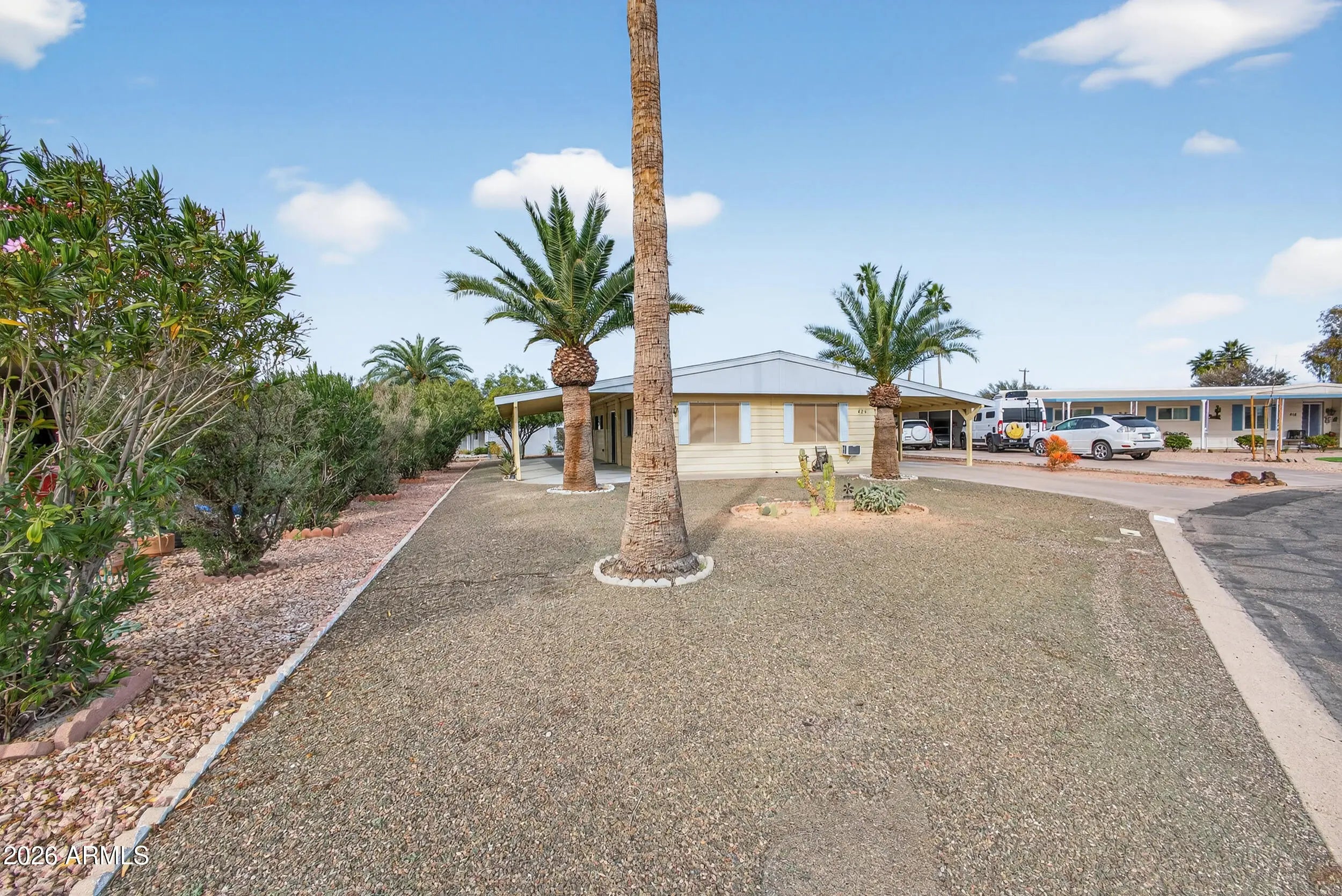 Cul De Sac location! 2 bedroom, 1 3/4 baths with 2 Car covered carport. Full length south facing covered patio, Inside laundry. Active Adult 55+ Gated Community, FOUNTAIN OF THE SUN! Country Club & Golf Course Community. Heated Community Pool. Lots of planned activities, pickle ball, yoga, arts & crafts, card room, shuffleboard, etc.