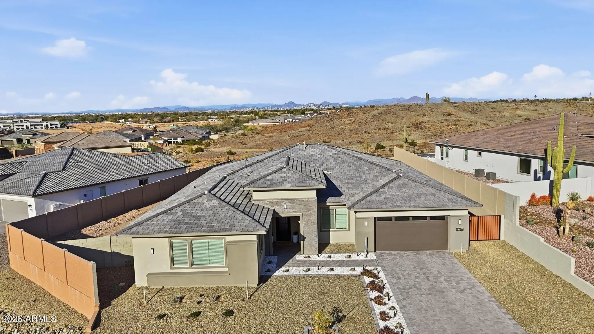 What an incredible premium hillside lot in the beautiful Whispering Hills neighborhood at the base of South Mountain! This Pinnacle Floorplan has over 3600 SF w/4 Bedrooms & 3.5 Bathrooms. Split Bdrms & Home Office. Seller paid for all the right PREMIUM features... Soaring 12' ceiling w/CORNER Sliding Glass Door out to patio, Modern Iron Front Door, Added Exercise/Bonus Rm, Upgraded Flooring, Custom Tile Master Shower w/Raincan Head & Frameless Walk In enclosure. Gourmet Kitchen includes upgraded Cabinets & Quartz Countertops, Beverage Center, Premium Cafe' GE Appliance Pkg: 36'' Gas Cooktop, Double Ovens & Commercial S/S Vent. Champagne Bronze TOUCH Kitchen Faucet & Pot Filler. Baths have Matte Black Fixtures w/raised Vanities & Rectangle sinks for a modern look. Make this your new HOME! Added Upgrades: 12" Ceiling Height in Great Room Contemporary Iron Front Entry Door w/Lever Matte Black Hardware Finished Bonus Exercise/Game Room Extended Corner Sliding Glass Door Upgraded Aristokraft Cabinets Throughout Grade 5 Quartz Countertops Cafe' GE Appliance Package 36" Cafe' Gas Cooktop Champagne Finish Pot Filler Super SingleBowl Kitchen Sink Champagne Finish TOUCH Faucet Beverage Center Commercial 36" S/S Vent Custom Shower Tile Surround w/ Frameless Walk In Shower Enclosure RainCan Shower Head with Watersense & Sep Valves Raised Vanities all Baths w/ Rectangular Vanity Sinks Matte Black Bath Plumbing Fixtures Soft Water System Gas Line Stub out for Backyard Premium Oversized Hillside Lot (.46 Acre) Insulated Garage Door Prewire for Pendant Lights Ceiling Fans & Prewire w/Sep switch for Fan & Light Full house Window Blinds Floor outlet in Great Room Additional Outlet 10' RV Gate Standard features are: 400 AMP Electrical Panel SMART Features: Switches, Thermostat, Front Entry Door, Doorbell & Garage Door Opener. LED Disc Lighting per Plan, USB Port @ Kitchen & Primary Suite with Duplex Charger. Energy & Earth Friendly features: LEED Certified Home, 16 Seer Lennox Air Conditioner System, Fresh Air Intake & R8 Flex Duct System, Tankless Gas Water Heater, Low E Dual Pane Vinyl Frame Windows, Sprayed Cellulose Insulation in Exterior Wall, Low Water Plumbing Fixtures & Toilets, Post Tension Foundation System. All Interior paint to be Low VOC